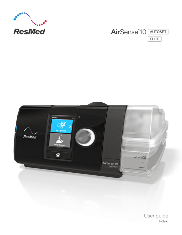 User guide Polski POLSKI Witamy Urządzenia AirSense 10™ AutoSet™ i AirSense 10 Elite to nowoczesne urządzenia wytwarzające ciśnienie, z automatyczną regulacją, i urządzenia wytwarzające stałe ciśnienie dodatnie w drogach oddechowych (CPAP) firmy ResMed. OSTRZEŻENIE • Przed użyciem urządzenia należy przeczytać instrukcję. • Niniejsze urządzenie należy używać zgodnie z przeznaczeniem opisanym w niniejszym podręczniku użytkownika. • Należy przede wszystkim postępować zgodnie z zaleceniami lekarza przepisującego leczenie, a następnie zgodnie z informacjami zawartymi w niniejszym podręczniku użytkownika. Wskazania do użycia AirSense 10 AutoSet Samoregulujące urządzenie AirSense 10 AutoSet jest przeznaczone do leczenia obturacyjnego bezdechu sennego (OBS) u pacjentów ważących ponad 30 kg. Urządzenie przeznaczone do użytku domowego i szpitalnego. Nawilżacz jest przeznaczony do użytku u jednego pacjenta w warunkach domowych oraz do wielokrotnego używania w warunkach szpitalnych/instytucjonalnych. AirSense 10 Elite Urządzenie AirSense 10 Elite jest przeznaczone do leczenia obturacyjnego bezdechu sennego (OBS) u pacjentów ważących ponad 30 kg. Urządzenie przeznaczone do użytku domowego i szpitalnego. Nawilżacz jest przeznaczony do użytku u jednego pacjenta w warunkach domowych oraz do wielokrotnego używania w warunkach szpitalnych/instytucjonalnych. Przeciwwskazania Dodatnie ciśnienie w drogach oddechowych może być przeciwwskazaniem dla niektórych pacjentów cierpiących na następujące schorzenia: • ciężka pęcherzowa choroba płuc • odma opłucnowa • patologicznie niskie ciśnienie krwi • odwodnienie • wyciek płynu mózgowo-rdzeniowego, niedawny zabieg chirurgiczny czaszki lub uraz. Polski 1 Działania niepożądane Pacjenci powinni zgłaszać lekarzowi zalecającemu leczenie nietypowe bóle w klatce piersiowej, silne bóle głowy lub nasilenie duszności. Ostra infekcja górnych dróg oddechowych może wymagać tymczasowego przerwania leczenia. Podczas leczenia z zastosowaniem urządzenia mogą wystąpić następujące działania niepożądane: • suchość w nosie, ustach lub gardle • krwawienie z nosa • wzdęcie • dyskomfort w uchu lub zatokach • podrażnienie oczu • wysypka na skórze. W skrócie Urządzenie AirSense 10 obejmuje następujące elementy: • Urządzenie • nawilżacz HumidAir™ • Rura przewodząca powietrze • Zasilacz • Torba podróżna • Karta SD (dotyczy tylko niektórych urządzeń). Należy skontaktować się z dostawcą aparatury w sprawie dostępnych akcesoriów do użycia z urządzeniem, obejmujących następujące elementy: • Rura przewodząca powietrze (podgrzewana i niepodgrzewana): ClimateLineAir™, SlimLine™, ClimateLineAir Oxy, Standardowa • Pokrywę boczną do stosowania bez nawilżacza • Filtr: filtr hipoalergiczny, filtr standardowy • Konwerter prądu stałego Air10™ • Czytnik karty SD • Adapter oksymetru Air10 • Adapter USB Air10 • Power Station II • Kolanko do rury Air10. 2 Informacje podstawowe 1 Wylot powietrza 5 Nawilżacz HumidAir 2 Osłona filtru powietrza 6 Ekran 3 Gniazdo zasilacza 7 Pokrywa adaptera 4 Numer seryjny i numer urządzenia 8 Pokrywa karty SD Informacje o panelu kontrolnym Przycisk Start/Stop Nacisnąć, aby rozpocząć/zatrzymać terapię. Nacisnąć i przytrzymać przez trzy sekundy, aby przejść do trybu oszczędzania energii. Pokrętło Obrócić, aby poruszać się po menu i nacisnąć, aby wybrać opcję. Obrócić, aby dostosować wybraną opcję i nacisnąć, aby zapisać wprowadzoną zmianę. Przycisk powrotu do ekranu głównego Nacisnąć, aby powrócić do ekranu Home (Głównego). Zależnie od okoliczności, ekran może wyświetlać różne ikony, na przykład: Czas narastania Siła sygnału bezprzewodowego (zielony) Automatyczny czas narastania Transfer bezprzewodowy nie włączony (szary) Wilgotność Brak łączności bezprzewodowej Ogrzewanie nawilżacza Tryb samolotowy Chłodzenie nawilżacza Polski 3 Konfiguracja PRZESTROGA Nie wolno przepełniać nawilżacza, gdyż woda może wniknąć do urządzenia i rury przewodzącej powietrze. 1. Umieścić urządzenie na stabilnej, poziomej powierzchni. 2. Podłączyć złącze zasilania z tyłu urządzenia. Podłączyć jeden koniec kabla zasilania do zasilacza, a drugi do gniazda zasilania. 3. Podłączyć dokładnie rurę przewodzącą powietrze do wylotu powietrza znajdującego się z tyłu urządzenia. 4. Otworzyć nawilżacz i napełnić go wodą do znacznika maksymalnego poziomu. Nie napełniać nawilżacza gorącą wodą. 5. Zamknąć nawilżacz i włożyć go z boku do urządzenia. 6. Podłączyć maskę z osprzętem do wolnego końca rury przewodzącej powietrze. Szczegółowe informacje znajdują się w instrukcji użytkowania maski. Zalecane maski są dostępne na stronie www.resmed.com. 4 Rozpoczęcie terapii 1. Dopasować maskę. 2. Wcisnąć Start/Stop lub oddychać normalnie, jeżeli uruchomiona jest funkcja SmartStart. Leczenie jest uruchomione, jeżeli wyświetlony jest ekran „Raport Snu”. Na zielono pokazywane jest bieżące ciśnienie terapeutyczne. W czasie narastania ciśnienie stopniowo rośnie i widoczne jest obracające się kółko. Po osiągnięciu przepisanego ciśnienia terapeutycznego całe kółko jest zielone. Po krótkim okresie czasu ekran automatycznie stanie się czarny. Można nacisnąć przycisk powrotu do ekranu głównego lub pokrętło, aby ponownie włączyć ekran. Jeśli podczas leczenia nastąpi przerwa w dopływie zasilania, urządzenie automatycznie wznawia leczenie po przywróceniu zasilania. Urządzenie AirSense 10 jest wyposażone w czujnik światła, który dopasowuje jasność ekranu w oparciu o poziom oświetlenia w pomieszczeniu. Zatrzymywanie terapii 1. Zdjąć maskę. 2. Nacisnąć Start/Stop lub – jeżeli włączona jest opcja SmartStart – praca urządzenia zostanie zatrzymana automatycznie po kilk