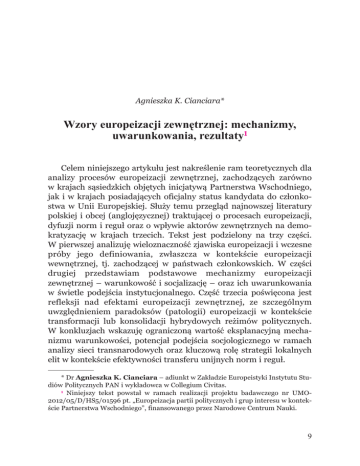 Agnieszka K. Cianciara* wzory europeizacji zewnętrznej: mechanizmy, uwarunkowania, rezultaty1 Celem niniejszego artykułu jest nakreślenie ram teoretycznych dla analizy procesów europeizacji zewnętrznej, zachodzących zarówno w krajach sąsiedzkich objętych inicjatywą Partnerstwa Wschodniego, jak i w krajach posiadających oficjalny status kandydata do członkostwa w Unii Europejskiej. Służy temu przegląd najnowszej literatury polskiej i obcej (anglojęzycznej) traktującej o procesach europeizacji, dyfuzji norm i reguł oraz o wpływie aktorów zewnętrznych na demokratyzację w krajach trzecich. Tekst jest podzielony na trzy części. W pierwszej analizuję wieloznaczność zjawiska europeizacji i wczesne próby jego definiowania, zwłaszcza w kontekście europeizacji wewnętrznej, tj. zachodzącej w państwach członkowskich. W części drugiej przedstawiam podstawowe mechanizmy europeizacji zewnętrznej – warunkowość i socjalizację – oraz ich uwarunkowania w świetle podejścia instytucjonalnego. Część trzecia poświęcona jest refleksji nad efektami europeizacji zewnętrznej, ze szczególnym uwzględnieniem paradoksów (patologii) europeizacji w kontekście transformacji lub konsolidacji hybrydowych reżimów politycznych. W konkluzjach wskazuję ograniczoną wartość eksplanacyjną mechanizmu warunkowości, potencjał podejścia socjologicznego w ramach analizy sieci transnarodowych oraz kluczową rolę strategii lokalnych elit w kontekście efektywności transferu unijnych norm i reguł. * Dr Agnieszka K. Cianciara – adiunkt w Zakładzie Europeistyki Instytutu Studiów Politycznych PAN i wykładowca w Collegium Civitas. 1 Niniejszy tekst powstał w ramach realizacji projektu badawczego nr UMO2012/05/D/HS5/01596 pt. „Europeizacja partii politycznych i grup interesu w kontekście Partnerstwa Wschodniego”, finansowanego przez Narodowe Centrum Nauki. 9 Studia Europejskie, 3/2013 fenomen europeizacji Intensyfikacja użycia terminu „europeizacja” związana jest z wyczerpywaniem się adekwatności tradycyjnych teorii integracji do opisu bytu politycznego, jakim jest Unia Europejska.2 Autorzy wskazują ponadto na instytucjonalny zwrot w naukach politycznych (od lat 80. XX w.), a potem także w studiach europejskich.3 Konceptualizacja fenomenu europeizacji pozwala na uchwycenie podstawowych zależności i procesów zachodzących w relacjach między instytucjami ponadnarodowymi (poziomem unijnym) a instytucjami i aktorami krajowymi. Należy podkreślić na wstępie, że europeizacja nie jest teorią wyjaśniającą relacje w wielopoziomowym systemie rządzenia Unii Europejskiej, ale fenomenem, który sam wymaga wyjaśnienia.4 W celu wyjaśnienia fenomenu europeizacji wykorzystywane jest najczęściej podejście neoinstytucjonalne, przede wszystkim instytucjonalizm racjonalnego wyboru, ale także instytucjonalizm socjologiczny. Już w pionierskich opracowaniach dotyczących europeizacji pojawia się problem jej wielowymiarowości i wieloaspektowości. Johan P. Olsen podkreślał istnienie „wielu twarzy europeizacji”, takich jak: a) centralna penetracja krajowych systemów rządzenia i procesy adaptacyjne tam zachodzące, b) rozwój instytucji na poziomie europejskim, c) tworzenie politycznego projektu integracji europejskiej, ale także d) zmiany poza granicami UE następujące w wyniku procesu rozszerzenia, e) eksport form organizacji politycznej do państw i organizacji trzecich.5 2 J. Caporaso, The Three Worlds of Regional Integration Theory w: Europeanization: New Research Agenda, red. P. Graziano, M.P. Vink, Basingstoke 2007, s. 24. 3 J. Ruszkowski, Europeizacja jako przedmiot badań w studiach nad integracją europejską w: Metodologiczne problemy studiów europejskich, red. K.A. Wojtaszczyk, Warszawa 2012, s. 81–82. 4 R. Riedel, Podejścia i teorie w badaniach nad europeizacją w: Europeizacja – mechanizmy, wymiary, efekty, red. A. Pacześniak, R. Riedel, Toruń 2010, s. 46. 5 J.P. Olsen, The Many Faces of Europeanization, „Journal of Common Market Studies” nr 5/2002, s. 921–952. 10 A.K. Cianciara, Wzory europeizacji zewnętrznej... Trudno więc sformułować jednoznaczną definicję europeizacji zachodzącej zarówno wewnątrz Unii Europejskiej, w relacjach instytucji i aktorów poziomu ponadnarodowego i krajowego, jak i w relacjach UE z instytucjami i aktorami krajów nienależących do Unii, w tym krajów kandydujących, ale także innych podmiotów stosunków międzynarodowych, niejednokrotnie od kontynentu europejskiego geograficznie odległych. Mamy zatem do czynienia z europeizacją wewnętrzną i zewnętrzną. Ulrich Beck i Edgar Grande stwierdzają, że europeizacja przebiega w dwóch kierunkach – do wewnątrz, przez rozszerzanie kompetencji UE i wynikające z niego dostosowania w państwach członkowskich, oraz na zewnętrz, dzięki geograficznemu rozszerzaniu Unii i eksportowi jej reguł i norm.6 Ponadto wskazuje się, że europeizacja implikuje zmianę zarówno na poziomie krajowym, jak i europejskim, a więc zachodzić może europeizacja odgórna (top-down) oraz oddolna (bottom-up). Wreszcie, europeizacja może być ujmowana jako proces albo jako efekt końcowy, czyli zmiana, która zaszła pod wpływem członkostwa, akcesji czy innych relacji o charakterze integracyjnym z Unią Europejską.7 Chronologicznie rzecz ujmując, badacze europeizacji skupili się najpierw na procesie krajowej adaptacji do integracji europejskiej w przypadku państw członkowskich. Pierwsza ogólna definicja europeizacji, sformułowana przez Roberta Ladrecha w 1994 r., odnosiła się do „stopniowego procesu reorientacji kierunku i kształtu polityki krajowej w taki sposób, że polityczna i gospodarcza dynamika UE staje się częścią organizacyjnej logiki krajowej polityki i krajowego procesu decyzyjnego”.8 Z kolei Claudio Radaelli ujął europeizację w państwach członkowskich w kontekście instytucjonalizmu socjologicznego, wskazując, że