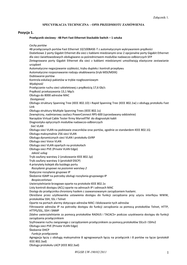 Załącznik 1. SPECYFIKACJA TECHNICZNA – OPIS PRZEDMIOTU ZAMÓWIENIA Pozycja 1. Przełącznik sieciowy - 48 Port Fast Ethernet Stackable Switch – 1 sztuka Cechy portów 48 przełączanych portów Fast Ethernet 10/100BASE-T z automatycznym wykrywaniem prędkości Dodatkowe 2 porty Gigabit Ethernet dla sieci z kablami miedzianymi oraz 2 opcjonalne porty Gigabit Ethernet dla sieci światłowodowych obsługiwane za pośrednictwem modułów nadawczo-odbiorczych SFP Zintegrowane porty Gigabit Ethernet dla sieci z kablami miedzianymi umożliwiają elastyczne zestawianie urządzeo Automatyczne negocjowanie szybkości, trybu dupleks i kontroli przepływu Automatyczne rozpoznawanie rodzaju okablowania (tryb MDI/MDIX) Dublowanie portów Kontrola eskalacji pakietów w trybie rozgłoszeniowym Wydajność Przełączanie ruchu sieci szkieletowej z prędkością 17,6 Gb/s Prędkośd przekazywania 13,1 Mp/s Obsługa do 8000 adresów MAC Dostępność Obsługa struktury Spanning Tree (IEEE 802.1D) i Rapid Spanning Tree (IEEE 802.1w) z obsługą protokołu Fast Link Obsługa struktury Multiple Spanning Trees (IEEE 802.1s) Zewnętrzny, nadmiarowy zasilacz PowerConnect RPS-600 (sprzedawany oddzielnie) Narzędzie Virtual Cable Tester firmy MarvellTM do diagnostyki kabli Diagnostyka optycznych modułów nadawczo-odbiorczych Sieć VLAN Obsługa sieci VLAN na podstawie znaczników oraz portów, zgodnie ze standardem IEEE 802.1Q Obsługa maksymalnie 256 sieci VLAN Obsługa dynamicznych sieci VLAN i protokołu GVRP Obsługa sieci Voice VLAN Obsługa sieci VLAN opartych na protokołach Obsługa sieci PVE (Private VLAN Edge) Jakość usług Tryb zaufany warstwy 2 (znakowanie IEEE 802.1p) Tryb zaufany warstwy 3 (protokół DSCP) 4 priorytety kolejek dla każdego portu Rozsyłanie grupowe na poziomie warstwy 2 Statyczne rozsyłanie grupowe IP Śledzenie IGMP na potrzeby obsługi rozsyłania grupowego IP Bezpieczeostwo Uwierzytelnianie brzegowe oparte na protokole IEEE 802.1x Listy kontroli dostępu (ACL) oparte na adresach IP i adresach MAC Dostęp do przełącznika chroniony hasłem z zaawansowanym zarządzaniem hasłami. Określane przez użytkownika ustawienia dostępu do funkcji zarządzania przy użyciu interfejsu WWW, protokołów SSH, SSL i Telnet Oparte na portach alarmy dotyczące adresów MAC i blokowanie tych adresów Filtrowanie adresów IP na potrzeby dostępu do funkcji zarządzania za pomocą protokołów Telnet, HTTP, HTTPS/SSL, SSH i SNMP Zdalne uwierzytelnianie za pomocą protokołów RADIUS i TACACS+ podczas uzyskiwania dostępu do funkcji zarządzania przełącznikiem Szyfrowanie ruchu związanego z zarządzaniem przełącznikiem za pomocą protokołów SSLv3 i SSHv2 Obsługa sieci PVE (Private VLAN Edge) Śledzenie DHCP Funkcje przełączania Agregacja łączy z obsługą maksymalnie 8 agregowanych łączy na przełącznik i 8 portów na łącze (protokół IEEE 802.3ad) Obsługa protokołu LACP (IEEE 802.3ad) WGiSR UW-190/02/2011 1 Zarządzanie Interfejs zarządzania przez WWW Interfejs wiersza polecenia zgodny ze standardami branżowymi, dostępny za pośrednictwem usługi Telnet lub lokalnego portu szeregowego Obsługa protokołów SNMPv1, SNMPv2c i SNMPv3 Obsługa 4 grup funkcji zdalnego monitorowania RMON (historia, statystyki, alarmy i zdarzenia) Przesyłanie plików oprogramowania wewnętrznego i plików konfiguracyjnych za pomocą protokołu TFTP Dwa obrazy oprogramowania wewnętrznego dostępne w urządzeniu Obsługa wysyłania/pobierania wielu plików konfiguracyjnych Statystyki związane z monitorowaniem błędów i optymalizacją wydajności, w tym tabele podsumowao dla portów Obsługa zarządzania adresami IP za pomocą protokołu BootP/DHCP Obsługa protokołu LLDP-MED Funkcje zdalnego rejestrowania komunikatów w dzienniku systemowym Czujniki temperatury umożliwiające monitorowanie środowiska pracy Narzędzie Virtual Cable Tester firmy MarvellTM i narzędzie do diagnostyki światłowodowych urządzeo nadawczo-odbiorczych do zaawansowanego rozwiązywania problemów Obudowa Wysokośd: 1U, do montażu w szafie 19” Zasilacz: napięcie zasilania 100–240 V (prąd przemienny), częstotliwośd 50–60 Hz Pozycja 2. Dysk twardy: 1TB NearLine SAS 6Gbps, 7.2k (3.5") HD – 7 sztuk Typ produktu : dysk twardy* Prędkość obrotowa: 7200 RPM Pojemność : 1 TB Interfejs : SAS Przeznaczenie: rozbudowa (zapełnienie wolnych banków) posiadanej pamięci sieciowej MD3000i firmy Dell Wymagania dodatkowe: wymagany montaż w wskazanym przez Zamawiającego urządzeniu MD3000i *Zastosowanie: pamięć PowerVault MD3000i firmy Dell Pozycja 3. Przełącznik KVM (8-Port USB PS/2 Combo VGA KVM Switch with Set of 4 USB and 4 PS/2 KVM Cables) – 1 sztuka Cechy: 8 portów Combo VGA 4 porty USB 4 porty PS/2 KVM Cables: Kable w ilości niezbędnej do połączenia z czterema serwerami Wymagania dodatkowe: wymagany montaż przełącznika KVM, podłączenie serwerów oraz panelu Dell 1U LCD Flat panel do urządzenia KVM i jego uruchomienie wraz z przeprowadzeniem testów poprawności działania Przeznaczenie: integracja zarządzania serwerami (4 sztuki - tj. Dell Power Edge R710 oraz Dell T3500.) za pośrednictwem jednego panelu szafowego 1U LCD Flat panel firmy Dell, WGiSR UW-190/02/2011 2 Pozycja 4. Komputer stacjonarny – 1 sztuka Lp. 1. 2. 3. 4. 5. 6. 7. 8. 9. 10. 11. 12. 13. 14. 15. 16. 19. Nazwa komponentu Wymagane minimalne parametry techniczne komputerów Płyta główna Zaprojektowana na zlecenie producenta jednostki centralnej komputera, wyposażona w 1 złącze PCI Express x16, 2 wolne złącza PCI, 1 złącze PCI Express x1, 4 złącza DIMM z obsługą do 16GB DDR3 pamięci RAM, 4 złącza SATA; płyta musi być trwale oznaczona logo producenta komputera, Chipset dostosowany do oferowanego procesora lub równoważny Procesor klasy x86-64 4-rdzeniowy lub procesor równoważny wydajnościowo. Procesor Zaoferowany procesor musi uzyskiwać jednocześnie w teście 3DMark 06 wynik min.: 5400 punkt