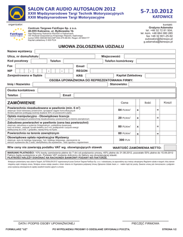 SALON CAR AUDIO AUTOSALON 2012 5-7.10.2012 XXIII Miêdzynarodowe Targi Technik Motoryzacyjnych XXIII Miêdzynarodowe Targi Motoryzacyjne KATOWICE organizator: kontakt: Gra¿yna Adamska tel. +48 32 72 81 504; tel. kom. +48 664 080 285 fax +48 32 601-25-92 [email protected] [email protected] Centrum Targowe FairExpo Sp. z o.o. 40-955 Katowice, ul. Bytkowska 1b S¹d Rejonowy Katowice-Wschód w Katowicach VIII Wydzia³ Gospodarczy Krajowego Rejestru S¹dowego numer KRS 0000361843,NIP 634-275-88-90, Regon 241694177 Kapita³ zak³adowy 5 000 PLN UMOWA ZG£OSZENIA UDZIA£U Nazwa wystawcy Ulica, nr domu/lokalu Miejscowoœæ Kod pocztowy Telefon Telefon komórkowy Fax Email NIP - - REGON - Zarejestrowana w S¹dzie Imiê i Nazwisko KRS Kapita³ Zak³adowy OSOBA UPOWA¯NIONA DO REPREZENTOWANIA FIRMY: Stanowisko Osoba kontaktowa Email Telefon ZAMÓWIENIE Cena Koszt Iloœæ 2 Powierzchnia niezabudowana w pawilonie (min. 6 m ) obejmuje: koszt dzier¿awy powierzchni, sprz¹tanie ci¹gów komunikacyjnych Stoiska piêtrowe podlegaj¹ osobnej dop³acie 30% od powierzchni piêtra. Op³ata manipulacyjna - Obowi¹zkowa licencja 84 PLN/m 2 x = 20 PLN/m 2 x = obejmuje: zabudowê w systemie Octagonalnym, wyk³adzinê dywanow¹, kosz na œmieci, wieszak,1punkt œwietlny na 2 m2, pod³¹czenie i zu¿ycie energii elektrycznej do 2 kW, 1 gniazdko, nazwê firmy na fryzie. 80 PLN/m 2 x = Powierzchnia na terenie zewnêtrznym 80 PLN/m 2 x = dla firm zamawiaj¹cych powierzchniê niezabudowan¹ i powierzchniê na terenie zewnêtrznym Zabudowa powierzchni w pawilonie (cena bez powierzchni) Obowi¹zkowa op³ata rejestracyjna Wystawcy obejmuje: wpis do katalogu targowego, 1szt. katalogu targowego, zaproszenie na wieczór wystawców dla 2 osób, identyfikatory dla wystawców - iloœæ zgodna z regulaminem W/w ceny nie zawieraj¹ podatku VAT wg. obowi¹zuj¹cych stawek 300 PLN WARTOŒÆ ZAMÓWIENIA NETTO: WARUNKI P£ATNOŒCI: 10% kwoty zamówienia p³atne do 7 dni od podpisania umowy, 40% p³atne do 31.08.2012, pozosta³e 50% p³atne do 15.09.2012 Faktury bêd¹ wystawione w pln. Podatek VAT zostanie doliczony do faktury wg obowi¹zuj¹cej stawki. P£ATNOŒCI NALE¯Y DOKONAÆ NA RACHUNEK BANKOWY PODANY NA FAKTURZE. Niniejszym potwierdzamy nasz udziaù w Targach „AUTOSALON 2012” organizowanych przez Centrum Targowe FairExpo Sp. z o.o. i oúwiadczamy, ýe zapoznaliúmy siæ z treúcià i akceptujemy Regulamin udziaùu w targach, który stanowi integralnà czæúã niniejszej umowy. Niniejsza umowa zostaje zawarta z dniem dotarcia do Organizatora podpisanej Umowy Zgùoszenia Udziaùu faxem, e – mailem bàdê teý pocztà. Zawarcie umowy jest równoznaczne z podjæciem przez wystawcæ zobowiàzania do zapùaty wszelkich kosztów ujætych w umowie. DATA I PODPIS OSOBY UPOWA¯NIONEJ FORMULARZ "UZ" PO WYPE£NIENIU PROSIMY O ODES£ANIE ORYGINA£U POCZT¥ PIECZÊÆ FIRMOWA STRONA 1/2 SALON CAR AUDIO AUTOSALON 2012 XXIII Miêdzynarodowe Targi Technik Motoryzacyjnych XXIII Miêdzynarodowe Targi Motoryzacyjne organizator: 5-7.10.2012 KATOWICE kontakt: Gra¿yna Adamska tel. +48 32 72 81 504; tel. kom. +48 664 080 285 fax +48 32 601-25-92 [email protected] [email protected] Centrum Targowe FairExpo Sp. z o.o. 40-955 Katowice, ul. Bytkowska 1b S¹d Rejonowy Katowice-Wschód w Katowicach VIII Wydzia³ Gospodarczy Krajowego Rejestru S¹dowego numer KRS 0000361843,NIP 634-275-88-90, Regon 241694177 Kapita³ zak³adowy 5 000 PLN REGULAMIN UDZIA£U W TARGACH A. Postanowienia niniejszego Regulaminu Udzia³u w Targach stanowi¹ integraln¹ czeœæ Umowy Zg³oszenia Udzia³u w targach i obowi¹zuj¹ wszystkich uczestników targów i wystaw (dalej Wystawca) organizowanych przez Centrum Targowe FairExpo Sp. z o.o. z siedzib¹ w Katowicach (40-955), ul. Bytkowska 1 B wpisanej do Rejestru Przedsiêbiorców prowadzonego przez S¹d Rejonowy Katowice Wschód w Katowicach pod numerem KRS 0000361843 (dalej Organizator). Wszelkie zmiany Umowy Zg³oszenia Udzia³u, w tym Regulaminu, musz¹ byæ dokonywane w formie pisemnej i podpisane przez upowa¿nionego przedstawiciela Centrum Targowego FairExpo Sp. z o.o. (zwanego dalej Organizatorem), i osoby umocowane do reprezentowania Wystawcy. B. Warunkiem udzia³u w targach jest zawarcie miêdzy Wystawc¹ a Organizatorem „Umowy Zg³oszenia Udzia³u” oraz zap³ata ca³oœci wynagrodzenia wynikaj¹cego z Umowy Zg³oszenia Udzia³u. Osoby podpisuj¹ce „Umowê Zg³oszenia Udzia³u” oœwiadczaj¹ jednoczeœnie, ¿e posiadaj¹ umocowanie do reprezentowania Wystawcy , wynikaj¹ce z wpisu do w³aœciwego rejestru albo pe³nomocnictwa. Podpisany orygina³ Umowy Zg³oszenia Udzia³u winien zostaæ niezw³ocznie przes³any do Organizatora drog¹ pocztow¹. C. Organizator zobowi¹zuje siê do umieszczenia w widocznym miejscu Regulaminu Budynku i przepisów przeciwpo¿arowych. Wystawcy zobowi¹zani s¹ do zapoznania siê i przestrzegania zawartych w nich przepisów i postanowieñ. D. Prawa wystawcy, a w szczególnoœci prawo do najmu powierzchni nie mog¹ byæ cedowane przez Wystawcê na ¿adn¹ inn¹ firmê ani osobê bez zgody Organizatora i op³acenia stosownych op³at. Wystawca ponosi odpowiedzialnoœæ za wszelkie dzia³ania Wspó³wystawców, w tym szczególnie przestrzegania ww. przepisów obowi¹zuj¹cych w trakcie trwania imprezy. E. Firmy wykonuj¹ce zabudowê stoisk na terenie FAIREXPO mog¹ œwiadczyæ us³ugi zabudowy wy³¹cznie po nabyciu licencji w³aœciciela obiektu - FAIREXPO. Koszt licencji wynosi 20 z³/ m2 powierzchni zabudowywanej w pawilonie i na terenie otwartym. F. Wystawca ma prawo eksponowaæ i reklamowaæ swoje towary wy³¹cznie na wykupionym stoisku pod warunkiem, ¿e eksponaty nie zas³oni¹ s¹siednich ekspozycji ani nie zak³óc¹ normalnego toku pracy innych wystawców. Zakazuje siê u¿ywania urz¹dzeñ nag³aœniaj¹cych, dodatkowego oœwietlenia itp., które mog¹ zak³óciæ normalny tok pracy innych wystawców. G. Wystawca nie mo¿e organizowaæ ¿adnych akcji promocyjnych poz