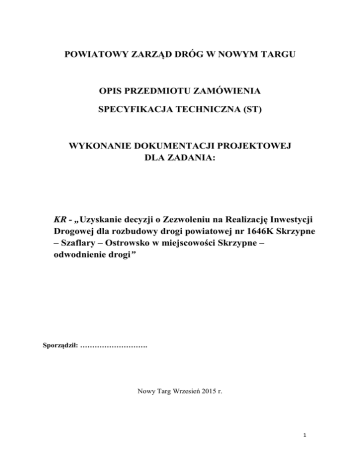POWIATOWY ZARZĄD DRÓG W NOWYM TARGU OPIS PRZEDMIOTU ZAMÓWIENIA SPECYFIKACJA TECHNICZNA (ST) WYKONANIE DOKUMENTACJI PROJEKTOWEJ DLA ZADANIA: KR - „Uzyskanie decyzji o Zezwoleniu na Realizację Inwestycji Drogowej dla rozbudowy drogi powiatowej nr 1646K Skrzypne – Szaflary – Ostrowsko w miejscowości Skrzypne – odwodnienie drogi” Sporządził: ………………………. Nowy Targ Wrzesień 2015 r. 1 SPIS TREŚCI 1 PRZEDMIOT SPECYFIKACJI (ZADANIE) .............................................................3 2 ZAKRES ZASTOSOWANIA.....................................................................................4 3 PRZEDMIOT OPRACOWANIA. ..............................................................................5 3.1 Ogólny opis zakresu .................................................................................................5 3.2 Parametry drogi........................................................................................................5 4 TERMIN OPRACOWANIA CAŁOŚCI DOKUMENTACJI ......................................6 5 ZAKRES OPRACOWANIA (Wykonanie opracowań projektowych) .........................7 5.1 Projekt wstępny........................................................................................................7 5.2 Uzyskanie decyzji o środowiskowych uwarunkowaniach realizacji przedsięwzięcia.8 5.3 Dokumentacja projektowa ......................................................................................10 5.4 Uzyskanie decyzji o zezwoleniu na realizację inwestycji drogowej (ZRID) oraz dokumentacja geodezyjno-prawna ....................................................................................12 5.5 6 Dokumentacja przetargowa i kosztorysowa ............................................................14 OGÓLNE WYMAGANIA, KONTROLA I ODBIÓR ROBÓT ................................16 6.1 Nadzór Zamawiającego nad procesem projektowym ..............................................16 6.2 wymagania ogólne..................................................................................................19 6.3 WYMAGANIA DOTYCZĄCE PRZEKAZANIA DOKUMENTACJI...................20 6.4 Odbiór zadania ......................................................................................................22 7 PŁATNOŚCI ............................................................................................................23 8 PRZEPISY PRAWNE, WYTYCZNE, NORMY.......................................................24 2 1 PRZEDMIOT SPECYFIKACJI (ZADANIE) Przedmiotem niniejszej ST są wymagania dotyczące wykonania i odbioru opracowań projektowych, opracowań geodezyjno-prawnych oraz uzyskania stosownych decyzji, uzgodnień i zezwoleń w ramach zadania projektowego pn.: „Uzyskanie decyzji o Zezwoleniu na Realizację Inwestycji Drogowej (ZRID) dla rozbudowy drogi powiatowej nr 1646K Skrzypne – Szaflary – Ostrowsko w miejscowości Skrzypne – odwodnienie drogi”. Opracowania projektowe będące przedmiotem powyższego zadania stanowić będą opis przedmiotu zamówienia w postępowaniu o udzielenie zamówienia publicznego na wykonanie robot wykonawczych/budowlanych. Zakres rzeczowy zadania: Rozbudowa drogi powiatowej nr 1646K w miejscowości(ach). Skrzypne w zakresie: Rozbudowa przepustu w km ok. 3+750 wraz z rozbudową odwodnienia drogi. Szczegółowy zakres zostanie określony przez Zamawiającego po dokonaniu analizy na etapie wykonywania projektu wstępnego, o którym mowa w pkt. 5.1 Analiza obejmować będzie w szczególności rozbudowę drogi w zakresie rozbudowy przepustu, rozbudowy odwodnienia drogi w tym kanalizacji deszczowej, chodników dla pieszych i nawierzchni drogi w obrębie przepustu. W przypadku lokalizacji chodnika na przepuście należy zachować wymagane parametry chodnika a w razie konieczności zaprojektować stosowną zmianę parametrów przepustu. 3 2 ZAKRES ZASTOSOWANIA Niniejsza Specyfikacja Techniczna stanowi dokument przetargowy i umowny przy zlecaniu zadania określonego w pkt. 1. i określa wymagania dotyczące wykonania i odbioru opracowań projektowych, robót geodezyjnych oraz uzyskania stosownych decyzji, uzgodnień i zezwoleń przewidzianych do wykonania i uzyskania w ramach tego zadania. 4 3 PRZEDMIOT OPRACOWANIA. 3.1 OGÓLNY OPIS ZAKRESU W ramach zadania należy wykonać dla wyznaczonego odcinka kompleksową dokumentację: niezbędną dla uzyskania stosownych decyzji administracyjnych w tym: o środowiskowych uwarunkowaniach i o zezwoleniu na realizację inwestycji niezbędną w postępowaniu o udzielenie zamówienia publicznego na wykonanie robót wykonawczych/budowlanych oraz na etapie wykonywania tych robót Dokumentacja projektowa składa się, z co najmniej następujących elementów (dla wyznaczonego odcinka): 1. 2. 3. 4. 5. 6. 7. projekt wstępny, opracowania z zakresu ochrony środowiska, projekt budowlany, projekt wykonawczy, dokumentacja niezbędna do złożenia wniosku o zezwolenie na realizację inwestycji drogowej, dokumentacja geodezyjno-prawna, dokumentacja przetargowa, Należy uzyskać wszelkie niezbędne do realizacji robót decyzje (ostateczne, prawomocne), uzgodnienia i zezwolenia przewidziane do wykonania i uzyskania w ramach tego zadania. Uwaga: Decyzji ZRID ma zostać nadany rygor natychmiastowej wykonalności!!! Wykonawca opracuje dokumentację na potrzeby udzielenia zamówienia publicznego zgodnie z przepisami dotyczącymi udzielania zamówień publicznych, w tym w szczególności w opisie przedmiotu zamówienia nie będzie posługiwał się nazwami własnymi producenta oraz produktu. Wykonawca zapewnia uzyskanie wszelkich decyzji, uzgodnień, opinii itp. niezbędnych do realizacji zadania na własny koszt. 3.2 PARAMETRY DROGI Klasa techniczna drogi: Z Dopuszczalne obciążenie nawierzchni: 100 KN/oś Kategoria Natężenia Ruchu: KR 3 5 4 TERMIN OPRACOWANIA CAŁOŚCI DOKUMENTACJI Termin opracowania całości dokumentacji to 30.04.2018 r. W przypadku wcześniejszego wykona