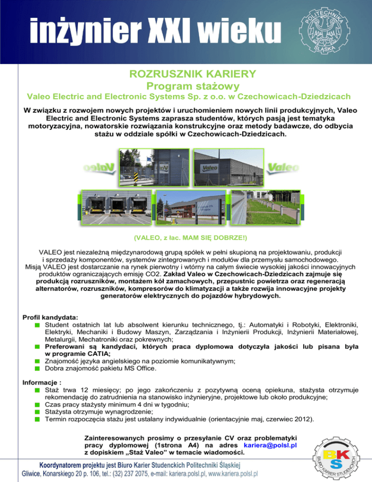 ROZRUSZNIK KARIERY Program stażowy Valeo Electric and Electronic Systems Sp. z o.o. w Czechowicach-Dziedzicach W związku z rozwojem nowych projektów i uruchomieniem nowych linii produkcyjnych, Valeo Electric and Electronic Systems zaprasza studentów, których pasją jest tematyka motoryzacyjna, nowatorskie rozwiązania konstrukcyjne oraz metody badawcze, do odbycia stażu w oddziale spółki w Czechowicach-Dziedzicach. (VALEO, z łac. MAM SIĘ DOBRZE!) VALEO jest niezależną międzynarodową grupą spółek w pełni skupioną na projektowaniu, produkcji i sprzedaży komponentów, systemów zintegrowanych i modułów dla przemysłu samochodowego. Misją VALEO jest dostarczanie na rynek pierwotny i wtórny na całym świecie wysokiej jakości innowacyjnych produktów ograniczających emisję CO2. Zakład Valeo w Czechowicach-Dziedzicach zajmuje się produkcją rozruszników, montażem kół zamachowych, przepustnic powietrza oraz regeneracją alternatorów, rozruszników, kompresorów do klimatyzacji a także rozwija innowacyjne projekty generatorów elektrycznych do pojazdów hybrydowych. Profil kandydata: Student ostatnich lat lub absolwent kierunku technicznego, tj.: Automatyki i Robotyki, Elektroniki, Elektryki, Mechaniki i Budowy Maszyn, Zarządzania i Inżynierii Produkcji, Inżynierii Materiałowej, Metalurgii, Mechatroniki oraz pokrewnych; Preferowani są kandydaci, których praca dyplomowa dotyczyła jakości lub pisana była w programie CATIA; Znajomość języka angielskiego na poziomie komunikatywnym; Dobra znajomość pakietu MS Office. Informacje : Staż trwa 12 miesięcy; po jego zakończeniu z pozytywną oceną opiekuna, stażysta otrzymuje rekomendację do zatrudnienia na stanowisko inżynieryjne, projektowe lub około produkcyjne; Czas pracy stażysty minimum 4 dni w tygodniu; Stażysta otrzymuje wynagrodzenie; Termin rozpoczęcia stażu jest ustalany indywidualnie (orientacyjnie maj, czerwiec 2012). Zainteresowanych prosimy o przesyłanie CV oraz problematyki pracy dyplomowej (1strona A4) na adres [email protected] z dopiskiem „Staż Valeo” w temacie wiadomości.