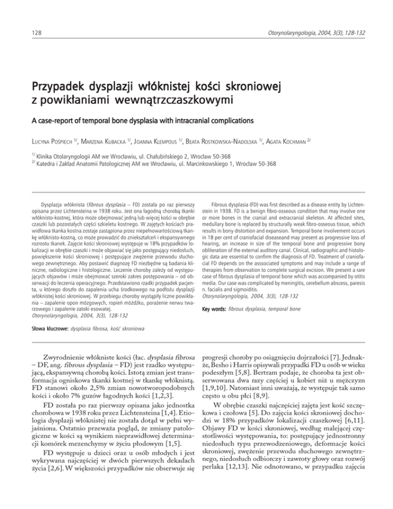 Otorynolaryngologia, 2004, 3(3), 128-132 128 Pr zypadek dysplazji w³óknistej koœci skroniowej Przypadek z powik³aniami wewn¹tr zczaszkowymi wewn¹trzczaszkowymi A case-report of temporal bone dysplasia with intracranial complications LUCYNA POŒPIECH 1/, MARZENA KUBACKA 1/, J OANNA KLEMPOUS 1/, BEATA ROSTKOWSKA-NADOLSKA 1/, AGATA KOCHMAN 2/ 1/ 2/ Klinika Otolaryngologii AM we Wroc³awiu, ul. Cha³ubiñskiego 2, Wroc³aw 50-368 Katedra i Zak³ad Anatomii Patologicznej AM we Wroc³awiu, ul. Marcinkowskiego 1, Wroc³aw 50-368 Dysplazja w³óknista (fibrous dysplasia – FD) zosta³a po raz pierwszy opisana przez Lichtensteina w 1938 roku. Jest ona ³agodn¹ chorob¹ tkanki w³óknisto-kostnej, która mo¿e obejmowaæ jedn¹ lub wiêcej koœci w obrêbie czaszki lub pozosta³ych czêœci szkieletu kostnego. W zajêtych koœciach prawid³owa tkanka kostna zostaje zast¹piona przez niepe³nowartoœciow¹ tkankê w³óknisto-kostn¹, co mo¿e prowadziæ do zniekszta³ceñ i ekspansywnego rozrostu tkanek. Zajêcie koœci skroniowej wystêpuje w 18% przypadków lokalizacji w obrêbie czaszki i mo¿e objawiaæ siê jako postêpuj¹cy niedos³uch, powiêkszenie koœci skroniowej i postêpuj¹ce zwê¿enie przewodu s³uchowego zewnêtrznego. Aby postawiæ diagnozê FD niezbêdne s¹ badania kliniczne, radiologiczne i histologiczne. Leczenie choroby zale¿y od wystêpuj¹cych objawów i mo¿e obejmowaæ szeroki zakres postêpowania – od obserwacji do leczenia operacyjnego. Przedstawiono rzadki przypadek pacjenta, u którego dosz³o do zapalenia ucha œrodkowego na pod³o¿u dysplazji w³óknistej koœci skroniowej. W przebiegu choroby wyst¹pi³y liczne powik³ania – zapalenie opon mózgowych, ropieñ mó¿d¿ku, pora¿enie nerwu twarzowego i zapalenie zatoki esowatej. Otorynolaryngologia, 2004, 3(3), 128-132 Fibrous dysplasia (FD) was first described as a disease entity by Lichtenstein in 1938. FD is a benign fibro-osseous condition that may involve one or more bones in the cranial and extracranial skeleton. At affected sites, medullary bone is replaced by structurally weak fibro-osseous tissue, which results in bony distortion and expansion. Temporal bone involvement occurs in 18 per cent of craniofacial diseaseand may present as progressive loss of hearing, an increase in size of the temporal bone and progressive bony obliteration of the external auditory canal. Clinical, radiographic and histologic data are essential to confirm the diagnosis of FD. Treatment of craniofacial FD depends on the asssociated symptoms and may include a range of therapies from observation to complete surgical excision. We present a rare case of fibrous dysplasia of temporal bone which was accompanied by otitis media. Our case was complicated by meningitis, cerebellum abscess, paresis n. facialis and sigmoiditis. Otorynolaryngologia, 2004, 3(3), 128-132 Key words: fibrous dysplasia, temporal bone S³owa kluczowe: dysplasia fibrosa, koœæ skroniowa Zwyrodnienie w³ókniste koœci (³ac. dysplasia fibrosa – DF, ang. fibrous dysplasia – FD) jest rzadko wystêpuj¹c¹, ekspansywn¹ chorob¹ koœci. Istot¹ zmian jest transformacja ogniskowa tkanki kostnej w tkankê w³óknist¹. FD stanowi oko³o 2,5% zmian nowotworopodobnych koœci i oko³o 7% guzów ³agodnych koœci [1,2,3]. FD zosta³a po raz pierwszy opisana jako jednostka chorobowa w 1938 roku przez Lichtensteina [1,4]. Etiologia dysplazji w³óknistej nie zosta³a dot¹d w pe³ni wyjaœniona. Ostatnio przewa¿a pogl¹d, ¿e zmiany patologiczne w koœci s¹ wynikiem nieprawid³owej determinacji komórek mezenchymy w ¿yciu p³odowym [1,5]. FD wystêpuje u dzieci oraz u osób m³odych i jest wykrywana najczêœciej w dwóch pierwszych dekadach ¿ycia [2,6]. W wiêkszoœci przypadków nie obserwuje siê progresji choroby po osi¹gniêciu dojrza³oœci [7]. Jednak¿e, Besho i Harris opisywali przypadki FD u osób w wieku podesz³ym [5,8]. Bertram podaje, ¿e choroba ta jest obserwowana dwa razy czêœciej u kobiet ni¿ u mê¿czyzn [1,9,10]. Natomiast inni uwa¿aj¹, ¿e wystêpuje tak samo czêsto u obu p³ci [8,9]. W obrêbie czaszki najczêœciej zajêta jest koœæ szczêkowa i czo³owa [5]. Do zajêcia koœci skroniowej dochodzi w 18% przypadków lokalizacji czaszkowej [6,11]. Objawy FD w koœci skroniowej, wed³ug malej¹cej czêstotliwoœci wystêpowania, to: postêpuj¹cy jednostronny niedos³uch typu przewodzeniowego, deformacje koœci skroniowej, zwê¿enie przewodu s³uchowego zewnêtrznego, niedos³uch odbiorczy i zawroty g³owy oraz rozwój perlaka [12,13]. Nie odnotowano, w przypadku zajêcia Poœpiech L., Kubacka M., Klempous J. i wsp.: Przypadek dysplazji w³óknistej koœci skroniowej z powik³aniami wewn¹trzczaszkowymi 129 przez FD koœci skroniowej, transformacji nowotworowej [6]. Dysplazja w³óknista koœci skroniowej jest rzadko spotykan¹ chorob¹. W literaturze œwiatowej opisywanych jest oko³o 75 przypadków, wg innych Ÿróde³ 53 przypadki FD koœci skroniowej [14,15]. OPIS PRZYPADKU Pacjent S.K. lat 25 zosta³ przyjêty do Kliniki Otolaryngologii we Wroc³awiu z powodu dolegliwoœci bólowych w okolicy lewej koœci skroniowej oraz niedos³uchu po tej stronie. W wywiadzie zg³asza³ narastaj¹c¹ od 6 lat asymetriê twarzy na niekorzyœæ strony lewej, szczególnie w okolicy ¿uchwy i stawu skroniowo-¿uchwowego. Badaniem przedmiotowym stwierdzono szczelinowato przewê¿ony przewód s³uchowy zewnêtrzny po stronie lewej, powiêkszenie lewej po³owy twarzy w zakresie koœci skroniowej oraz ga³êzi ¿uchwy, w badaniu audiometrycznym: obni¿enie krzywej powietrznej do 40 dB, krzywa kostna na poziomie 20 dB. W wykonanym zdjêciu rtg czaszki AP i bocznym opisano w obrêbie czêœci skalistej koœci skroniowej i wyrostka sutkowatego po stronie lewej intensywne, nieregularne zagêszczenia utkania kostnego o charakterze dysplazji w³óknistej. W badaniu tomografii komputerowej (TK) g³owy: zniekszta³cenie lewej czêœci trzonu ¿uchwy
