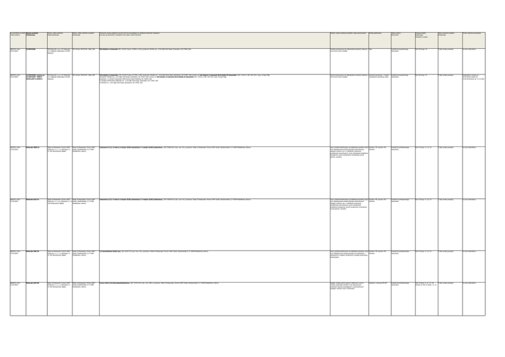 Nr pozwolenia na obrót Nazwa produktu i data wydania biobójczego Nazwa i adres podmiotu odpowiedzialnego Nazwa i adres wytwórcy produktu biobójczego Chemiczna nazwa substancji czynnej (lub inna pozwalająca na ustalenie tożsamości substancji czynnej), jej zawartość w produkcie oraz nazwa i adres wytwórcy Rodzaj i postać użytkowa produktu i jego przeznaczenie Rodzaj opakowania Zakres obrotu i stosowania Rodzaj produktu biobójczego (Kategoria i grupa) Okres ważności produktu biobójczego Termin ważności pozwolenia 0001/03 z dnia 25.03.2004r ULTRATHON 3M Poland Sp. z o.o., Al. Katowicka 117, Kajetany k/Warszawy, 05-830 Nadarzyn 3M, St.Paul, MN 55144 -1000, USA N,N-diethyl m-toluamide CAS: 134-62-3 [zaw. 31,58%+/-2%]; producent: Morflex Inc., 2110 High Point Road, Greensboro, NC 27403, USA emulsja przeznaczona do odstraszania komarów, kleszczy, much oraz innych owadów tuba produkt do powszechnego stosowania Kat: III Grupy: 19 3 lata od daty produkcji na czas nieokreślony 0002/03 z dnia 25.03.2004r ULTRATHON / zmiana na: ULTRATHON™ INSECT REPELLENT 8 (SPRAY) 3M Poland Sp. z o.o., Al. Katowicka 117, Kajetany k/Warszawy, 05-830 Nadarzyn 3M, St.Paul, MN 55144 -1000, USA N,N-diethyl m-toluamide CAS: 134-62-3 [zaw. 23,75%+/-2%]; producent: Morflex Inc., 2110 High Point Road, Greensboro, NC 27403, USA /zmiana na N,N-dietylo-m-toluamid (N,N-diethyl M-toluamide) CAS: 134-62-3, WE: 205-149-7, [zaw. 42,5g/170g] producent: Morflex Inc., 2110 High Point Road, Greensboro, NC 27403, USA / zmiana na: N,N-dietylo-m-toluamid (N,N-diethyl M-toluamide) CAS: 134-62-3, WE: 205-149-7 [zaw. 42,5g/170g]; aerozol przeznaczony do odstraszania: komarów, kleszczy, pojemnik aerozolowy / zmiana much oraz innych owadów na pojemnik aerozolowy (stal) produkt do powszechnego stosowania Kat: III Grupy: 19 3 lata od daty produkcji nieokreślony/ zmiana na: 14.05.2010/ zmiana na: 14.05.2014/zmina na: 31.12.2024 0003/03 z dnia 15.09.2003r Waterdos MKB 16 Water & Wastewater Technic WWT Polska Sp. z o. o., ul. Katowicka 17, 41-100 Siemianowice Śląskie Water & Wastewater Technic WWT GmbH, Staufenstraße 5, D 74385 Pleidelsheim, Niemcy mieszanina (3:1): 5-chloro-2-metylo-3(2H)-izotiazolonu i 2-metylo-3(2H)-izotiazolonu , CAS: 55965-84-9 (zaw. max 1%); producent: Water & Wastewater Technic WWT GmbH, Staufenstraße 5, D 74385 Pleidelsheim, Niemcy ciecz, produkt kombinowany do stabilizacji twardości wody kanister z PE; beczka z PE; kontener oraz zabezpieczenia antykorozyjnego przemysłowych obiegów wodnych (np. w chłodniach wieżowych, nawilżaczach aerozolowych), przez wbudowane dodatkowo biologicznie czynne komponenty minimalizuje wzrost glonów i grzybów produkt do profesjonalnego stosowania Kat: II Grupy: 11, 12, 13 2 lata od daty produkcji na czas nieokreślony 0004/03 z dnia 15.09.2003r Waterdos KAZ 16 Water & Wastewater Technic WWT Water & Wastewater Technic WWT Polska Sp. z o. o.,ul. Katowicka 17, 41- GmbH, Staufenstraße 5, D 74385 100 Siemianowice Śląskie Pleidelsheim, Niemcy mieszanina (3:1): 5-chloro-2-metylo-3(2H)-izotiazolonu i 2-metylo-3(2H)-izotiazolonu, CAS: 55965-84-9 (zaw. max 1%); producent: Water & Wastewater Technic WWT GmbH, Staufenstraße 5, D 74385 Pleidelsheim, Niemcy ciecz, produkt kombinowany do stabilizacji twardości wody kanister z PE; beczka z PE; oraz zabezpieczania antykorozyjnego przemysłowych kontener obiegów wodnych (np. w chłodniach wieżowych, nawilżaczach aerozolowych), przez wbudowanie dodatkowo biologicznie czynne komponenty minimalizuje wzrost glonów i grzybów produkt do profesjonalnego stosowania Kat: II Grupy: 11, 12, 13 2 lata od daty produkcji na czas nieokreślony 0005/03 z dnia 15.09.2003r Waterdos SIM 28 Water & Wastewater Technic WWT Polska Sp. z o. o., ul. Katowicka 17, 41-100 Siemianowice Śląskie Water & Wastewater Technic WWT GmbH, Staufenstraße 5, D 74385 Pleidelsheim, Niemcy 1,2-benisothiazol-3(2H)-one, CAS: 2634-33-5 (zaw. max. 3%); producent: Water & Wastewater Technic WWT GmbH, Staufenstraße 5, D 74385 Pleidelsheim, Niemcy ciecz, produkt kombinowany do stabilizacji twardości wody kanister z PE; beczka z PE; oraz zabezpieczenia antykorozyjnego do zamkniętych i kontener półotwartych urządzeń chłodniczych, posiada komponenty dyspergujące produkt do profesjonalnego stosowania Kat: II Grupy: 11, 12, 13 2 lata od daty produkcji na czas nieokreślony 0006/03 z dnia 15.09.2003r Waterdos BCH 08 Water & Wastewater Technic WWT Polska Sp. z o. o., ul. Katowicka 17, 41-100 Siemianowice Śląskie Water & Wastewater Technic WWT GmbH, Staufenstraße 5, D 74385 Pleidelsheim, Niemcy bromo-chloro-5,5-dwumetylohydantoina, CAS: 32718-18-6 (zaw. max. 98%); producent: Water & Wastewater Technic WWT GmbH, Staufenstraße 5, D 74385 Pleidelsheim, Niemcy tabletki, środek przeciw glonom, bakteriom (w tym z rodzaju Legionella), grzybom oraz ograniczonym warstwom szlamów powstających w przemysłowych obiegach wodnych oraz w fontannach produkt do profesjonalnego stosowania Kat: II Grupy: 6, 11, 12, 13 / 2 lata od daty produkcji na czas nieokreślony producenci: 1) Clariant Corporation 4000 Monroe Road Charlotte, NC, 28205, USA 2) Vertellus Performance Materials Inc., 2110 High Point Road, Greensboro, NC 27403, USA 3) Morflex Inc., 2110 High Point Road, Greensboro, NC 27403, USA wiaderko z tworzywa PE-HD zmiana na: Kat: II Grupy: 11, 12 0007/03 z dnia 15.09.2003r Waterdos CIT 48 Water & Wastewater Technic WWT Polska Sp. z o. o., ul. Katowicka 17, 41-100 Siemianowice Śląskie Water & Wastewater Technic WWT GmbH, Staufenstraße 5, D 74385 Pleidelsheim, Niemcy 0009/03 z dnia 15.09.2003r Waterdos PST 08 Water & Wastewater Technic WWT Water & Wastewater Technic WWT GmbH, Staufenstraße 5, D 74385 Polska Sp. z o. o. ul. Katowicka 17, 41-100 Siemianowice Śląskie / zmiana Pleidelsheim, Niemcy mieszanina (3:1): 5-chloro-2-metylo-3(2H)-izotiazolonu i 2-metylo-3(2H)-izotiazolonu CAS: 55965-84-9 (zaw. max 1%); producent: Water & Wastewater Technic WWT GmbH, Staufenstr