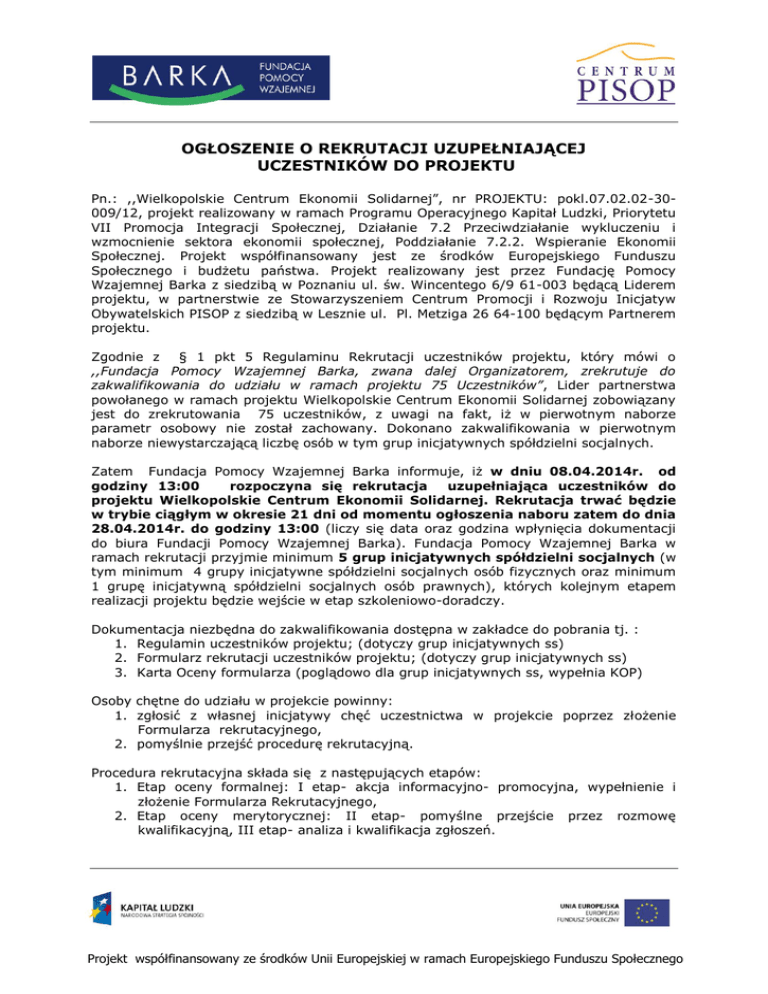 OGŁOSZENIE O REKRUTACJI UZUPEŁNIAJĄCEJ UCZESTNIKÓW DO PROJEKTU Pn.: ,,Wielkopolskie Centrum Ekonomii Solidarnej”, nr PROJEKTU: pokl.07.02.02-30009/12, projekt realizowany w ramach Programu Operacyjnego Kapitał Ludzki, Priorytetu VII Promocja Integracji Społecznej, Działanie 7.2 Przeciwdziałanie wykluczeniu i wzmocnienie sektora ekonomii społecznej, Poddziałanie 7.2.2. Wspieranie Ekonomii Społecznej. Projekt współfinansowany jest ze środków Europejskiego Funduszu Społecznego i budżetu państwa. Projekt realizowany jest przez Fundację Pomocy Wzajemnej Barka z siedzibą w Poznaniu ul. św. Wincentego 6/9 61-003 będącą Liderem projektu, w partnerstwie ze Stowarzyszeniem Centrum Promocji i Rozwoju Inicjatyw Obywatelskich PISOP z siedzibą w Lesznie ul. Pl. Metziga 26 64-100 będącym Partnerem projektu. Zgodnie z § 1 pkt 5 Regulaminu Rekrutacji uczestników projektu, który mówi o ,,Fundacja Pomocy Wzajemnej Barka, zwana dalej Organizatorem, zrekrutuje do zakwalifikowania do udziału w ramach projektu 75 Uczestników”, Lider partnerstwa powołanego w ramach projektu Wielkopolskie Centrum Ekonomii Solidarnej zobowiązany jest do zrekrutowania 75 uczestników, z uwagi na fakt, iż w pierwotnym naborze parametr osobowy nie został zachowany. Dokonano zakwalifikowania w pierwotnym naborze niewystarczającą liczbę osób w tym grup inicjatywnych spółdzielni socjalnych. Zatem Fundacja Pomocy Wzajemnej Barka informuje, iż w dniu 08.04.2014r. od godziny 13:00 rozpoczyna się rekrutacja uzupełniająca uczestników do projektu Wielkopolskie Centrum Ekonomii Solidarnej. Rekrutacja trwać będzie w trybie ciągłym w okresie 21 dni od momentu ogłoszenia naboru zatem do dnia 28.04.2014r. do godziny 13:00 (liczy się data oraz godzina wpłynięcia dokumentacji do biura Fundacji Pomocy Wzajemnej Barka). Fundacja Pomocy Wzajemnej Barka w ramach rekrutacji przyjmie minimum 5 grup inicjatywnych spółdzielni socjalnych (w tym minimum 4 grupy inicjatywne spółdzielni socjalnych osób fizycznych oraz minimum 1 grupę inicjatywną spółdzielni socjalnych osób prawnych), których kolejnym etapem realizacji projektu będzie wejście w etap szkoleniowo-doradczy. Dokumentacja niezbędna do zakwalifikowania dostępna w zakładce do pobrania tj. : 1. Regulamin uczestników projektu; (dotyczy grup inicjatywnych ss) 2. Formularz rekrutacji uczestników projektu; (dotyczy grup inicjatywnych ss) 3. Karta Oceny formularza (poglądowo dla grup inicjatywnych ss, wypełnia KOP) Osoby chętne do udziału w projekcie powinny: 1. zgłosić z własnej inicjatywy chęć uczestnictwa w projekcie poprzez złożenie Formularza rekrutacyjnego, 2. pomyślnie przejść procedurę rekrutacyjną. Procedura rekrutacyjna składa się z następujących etapów: 1. Etap oceny formalnej: I etap- akcja informacyjno- promocyjna, wypełnienie i złożenie Formularza Rekrutacyjnego, 2. Etap oceny merytorycznej: II etap- pomyślne przejście przez rozmowę kwalifikacyjną, III etap- analiza i kwalifikacja zgłoszeń. Projekt współfinansowany ze środków Unii Europejskiej w ramach Europejskiego Funduszu Społecznego W razie pytań prosimy o kontakt z biurem projektu Wielkopolskie Centrum Ekonomii Solidarnej pod numerem telefonu +48 61 668 24 08 lub/i +48 530 43 48 44 mail [email protected] Spec. ds. monitoringu i sprawozdawczości p. Jakub Kotnarowski lub w celu uzyskania informacji bezpośrednio w siedzibie Fundacji Pomocy Wzajemnej Barka w biurze projektu WCES przy ul. św. Wincentego 6/9, 61-003 Poznań po uprzednim kontakcie telefonicznym pod numerami telefonów wskazanymi powyżej. Dokumentacja powinna wpłynąć w zaklejonej kopercie oznaczonej w następujący sposób: przód koperty Fundacja Pomocy Wzajemnej Barka Biuro projektu: pn.: Wielkopolskie Centrum Ekonomii Solidarnej nr POKL.07.02.02-30-009/12 ul. św. Wincentego 6/9 61-003 Poznań Koordynator projektu p. Katarzyna Kokot-Małach Rekrutacja Uzupełniająca -------------------------------------------------------------------------tył koperty Grupa inicjatywna spółdzielni socjalnej ……………(nazwa) w składzie (nazwisko i imię członków): 1. …………………… 2. …………………… 3. …………………… 4. …………………… 5. …………………… 6. itd. Adres do korespondencji: ulica numer domu/numer lokalu, miasto/miejscowość, kod pocztowy Projekt współfinansowany ze środków Unii Europejskiej w ramach Europejskiego Funduszu Społecznego