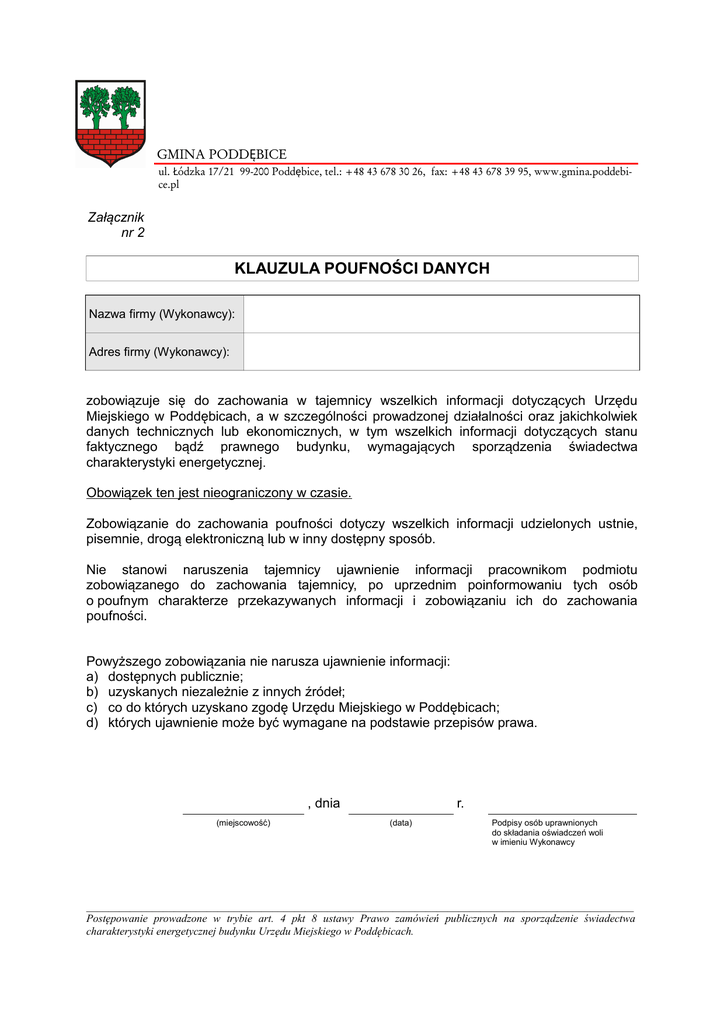 GMINA PODDĘBICE ul. Łódzka 17/21 99-200 Poddębice, tel.: +48 43 678 30 26, fax: +48 43 678 39 95, www.gmina.poddebice.pl Załącznik nr 2 KLAUZULA POUFNOŚCI DANYCH Nazwa firmy (Wykonawcy): Adres firmy (Wykonawcy): zobowiązuje się do zachowania w tajemnicy wszelkich informacji dotyczących Urzędu Miejskiego w Poddębicach, a w szczególności prowadzonej działalności oraz jakichkolwiek danych technicznych lub ekonomicznych, w tym wszelkich informacji dotyczących stanu faktycznego bądź prawnego budynku, wymagających sporządzenia świadectwa charakterystyki energetycznej. Obowiązek ten jest nieograniczony w czasie. Zobowiązanie do zachowania poufności dotyczy wszelkich informacji udzielonych ustnie, pisemnie, drogą elektroniczną lub w inny dostępny sposób. Nie stanowi naruszenia tajemnicy ujawnienie informacji pracownikom podmiotu zobowiązanego do zachowania tajemnicy, po uprzednim poinformowaniu tych osób o poufnym charakterze przekazywanych informacji i zobowiązaniu ich do zachowania poufności. Powyższego zobowiązania nie narusza ujawnienie informacji: a) dostępnych publicznie; b) uzyskanych niezależnie z innych źródeł; c) co do których uzyskano zgodę Urzędu Miejskiego w Poddębicach; d) których ujawnienie może być wymagane na podstawie przepisów prawa. , dnia (miejscowość) r. (data) Podpisy osób uprawnionych do składania oświadczeń woli w imieniu Wykonawcy ____________________________________________________________________________________________________ Postępowanie prowadzone w trybie art. 4 pkt 8 ustawy Prawo zamówień publicznych na sporządzenie świadectwa charakterystyki energetycznej budynku Urzędu Miejskiego w Poddębicach.