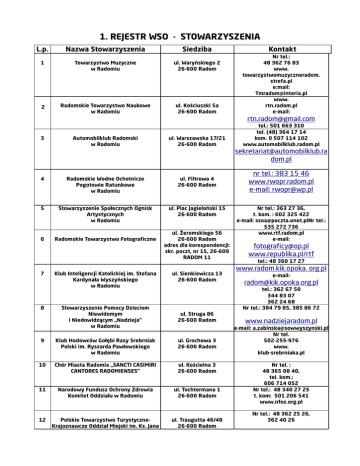 1. REJESTR WSO - STOWARZYSZENIA L.p. Nazwa Stowarzyszenia Siedziba 1 Towarzystwo Muzyczne w Radomiu ul. Waryńskiego 2 26-600 Radom 2 Radomskie Towarzystwo Naukowe w Radomiu ul. Kościuszki 5a 26-600 Radom Kontakt Nr tel.: 48 362 76 83 www. towarzystwomuzyczneradom. strefa.pl e:mail: [email protected] www. rtn.radom.pl e-mail: [email protected] 3 Automobilklub Radomski w Radomiu ul. Warszawska 17/21 26-600 Radom tel.: 501 663 310 tel. (48) 364 17 14 kom. 0 507 114 102 www.automobilklub.radom.pl [email protected] dom.pl 4 Radomskie Wodne Ochotnicze Pogotowie Ratunkowe w Radomiu ul. Filtrowa 4 26-600 Radom 5 Stowarzyszenie Społecznych Ognisk Artystycznych w Radomiu ul. Plac Jagieloński 15 26-600 Radom 6 Radomskie Towarzystwo Fotograficzne 7 8 Klub Inteligencji Katolickiej im. Stefana Kardynała Wyszyńskiego w Radomiu Stowarzyszenie Pomocy Dzieciom Niewidomym i Niedowidzącym „Nadzieja” w Radomiu ul. Żeromskiego 56 26-600 Radom adres dla korespondencji: skr. poczt, nr 15, 26-609 RADOM 11 ul. Sienkiewicza 13 26-600 Radom nr tel.: 383 15 46 www.rwopr.radom.pl e-mail: [email protected] Nr tel.: 363 27 36, t. kom. : 602 325 422 e-mail: [email protected] tel.: 535 272 736 www.rtf.radom.pl e-mail: [email protected] www.republika.pl/rtf tel.: 48 360 17 27 www.radom.kik.opoka. org.pl e-mail: [email protected] tel.: 362 67 50 344 83 07 362 24 68 Nr tel.: 384 79 85, 385 86 72 ul. Struga 86 26-600 Radom 9 Klub Hodowców Gołębi Rasy Srebrniak Polski im. Ryszarda Pawłowskiego w Radomiu ul. Grochowa 3 26-606 Radom 10 Chór Miasta Radomia „SANCTI CASIMIRI CANTORES RADOMIENSES” ul. Kościelna 3 26-600 Radom 11 Narodowy Fundusz Ochrony Zdrowia Komitet Oddziału w Radomiu ul. Tochtermana 1 26-600 Radom 12 Polskie Towarzystwo TurystycznoKrajoznawcze Oddział Miejski im. Ks. Jana ul. Traugutta 46/48 26-600 Radom www.nadziejaradom.pl e-mail: [email protected] Nr tel. 502-255-976 www. klub-srebrniaka.pl Nr tel. : 48 365 08 40, tel. kom.: 606 714 052 Nr tel.: 48 340 27 25 t. kom: 501 206 541 www.nfoz.org.pl Nr tel.: 48 362 25 26, 362 40 26 Wiśniewskiego w Radomiu tel. kom.: 794 510 017 www.pttkradom.prv.pl e:mail: [email protected] 13 Stowarzyszenie Inżynierów i Techników Komunikacji R. P. Oddział w Radomiu ul. Struga 7a 26-600 Radom 14 Stowarzyszenie Katolicki Ruch Antynarkotyczny „KARAN” w Radomiu ul. Żeromskiego 27 26-600 Radom Siedziba główna ul. Reja 5/1 15 Polskie Stowarzyszenie Na Rzecz Osób Z Upośledzeniem Umysłowym ul. Spółdzielcza 8/9 26-600 Radom 16 Stowarzyszenie Grupa Literacka „ŁUCZYWO” w Radomiu ul. Spółdzielcza 10/37 26-600 Radom 17 Stowarzyszenie Osób Na Rzecz Dzieci Niepełnosprawnych ul. Zamoyskiego 2 m.2 26-600 Radom Krajowe Towarzystwo Autyzmu Oddział w Radomiu ul. Główna 3 26-600 Radom Nr tel.: 48 384 53 54 www.sitkrpradom.pl e-mail: [email protected] Nr tel.: 48 362 20 46 www.karan.pl e-mail: [email protected] Nr tel./fax: 48 366 26 11 www.psouu.org.pl e-mail: [email protected] Nr tel.: 385 80 80, 368 29 63 e-mail: [email protected] 18 Nr tel. : 48 345 14 92; 344 87 83 www. forumaytyzmu.pl; www.synapsis.waw.pl e-mail: 2jackster@gmail. com 19 Stowarzyszenie Rodzina Katyńska w Radomiu ul. 25 Czerwca 68 26-600 Radom 20 Centrum Edukacji Ekologicznej ul. Wośnicka 125 26-600 Radom 21 Radomskie Towarzystwo Opieki Nad Zwierzętami ul. Witosa 96 26-600 Radom 22 23 24 25 Samodzielne Koło Terenowe Społecznego ul. Sandomierska 20 Towarzystwa Oświatowego Nr 158 26-600 Radom w Radomiu Polskie Towarzystwo ul. Czachowskiego 21a pok. Walki z Kalectwem Oddział w Radomiu 02 26-600 Radom Polskie Stowarzyszenie Ubezpieczenia ul. Czachowskiego 21a Społecznego Oddział w Radomiu 26-600 Radom Stowarzyszenie Ochrony Zdrowia Psychicznego „Wzajemna Pomoc” w Radomiu ul. Niedziałkowskiego 25/27 lok.12 26-600 Radom Nr tel.: 48 362 20 67, 362 70 70 www.federacja-katyn.org.pl Nr tel.: 48 340 22 84 www.cee_radom.republika.pl e-mail: [email protected] Nr tel.: 48 384 77 73 www.schronisko.radom.pl e-mail: [email protected] www.sto.org.pl Nr tel.: 48 385 64 56 www.twk.org.pl Nr tel.: 48 385 63 93 www.psus.pl Tel/fax: 048 36 90 154 tel. kom.: 501 066 492 www.wzajemnapomoc.republika.pl Email: wzajemna.pomoc@neostrada. pl 26 27 Radomskie Towarzystwo Dobroczynności Stowarzyszenie „Radomskie Centrum Przedsiębiorczości” ul. Plac Jagielloński 15 wejście „B”, lok. 324, III piętro 26-600 Radom ul. Kościuszki 1 26-600 Radom Nr tel.: 48 384 78 76 www.rtd.radom.pl e-mail: [email protected] Nr tel.: 48 360 00 45 www.srcp.radom.pl e-mail: [email protected] 28 Społeczny Komitet Ochrony Zabytkowego Cmentarza Rzymsko-Katolickiego w Radomiu ul. Malczewskiego 16 26-600 Radom www.zabytkicmentarza. radom.pl e:mail: [email protected] tel.: 362 42 63 29 Okręg Polskiego Związku Wędkarskiego ul. Bławatna 10 26-600 Radom 30 Stowarzyszenie Polskich Energetyków w Radomiu ul. Krakowska 5/7 m 1a 26-600 Radom 31 Stowarzyszenie – Klub Kobiet po Mastektomii „Amazonki – Dana” w Radomiu ul. Sandomierska 14 26-600 Radom Radomski Związek Hodowców Gołębi Rasowych i Drobiu Ozdobnego w Radomiu Stowarzyszenie Naukowo – Techniczne Inżynierów i Techników Rolnictwa Oddział w Radomiu ul.Góralska 17/1 26-600 Radom 32 33 ul. Chorzowska 16/18 26-600 Radom www.pzwokregradom.strefa. pl [email protected] nr tel.: 48 363 42 52 48 363 04 66 tel.: 48 345 52 31, fax 48 345 52 73 www.radom.spe.org.pl e-mail: [email protected] tel. 385 74 15 www.amazonki.com.pl tel.: 606 40 33 92, tel. 048 366 39 78 www.rzhgrido.radom.pl tel. 48 365-69-00 605 442 155 fax. 48 36-54-970 [email protected] www.sitr.pl tel.: 48 363 23 53, 363 29 06 t. kom.: 662 648 905 tel.: 48 362 20 88 34 Stowarzyszenie Charytatywne „Radesta” w Radomiu ul. Partyzantów 24/25 26-600 Radom 35 Radomska Rada Federacji Stowarzyszeń Naukowo – Technicznych NOT ul. Struga 7a 26-600 Radom Stowarzyszenie Osób Internowanych I Represjonowanych W Stanie Wojennym w Radomiu Stowarzyszenie Polskich Energetyków Oddział w Radomiu ul