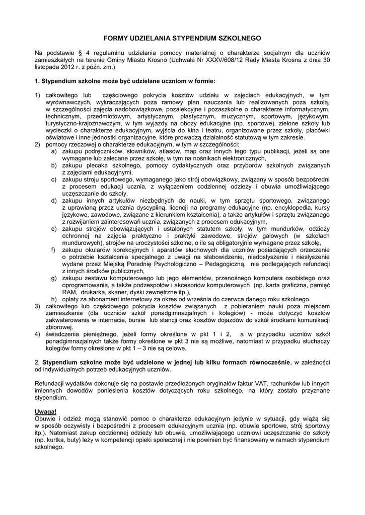 FORMY UDZIELANIA STYPENDIUM SZKOLNEGO Na podstawie § 4 regulaminu udzielania pomocy materialnej o charakterze socjalnym dla uczniów zamieszkałych na terenie Gminy Miasto Krosno (Uchwała Nr XXXV/608/12 Rady Miasta Krosna z dnia 30 listopada 2012 r. z późn. zm.) 1. Stypendium szkolne może być udzielane uczniom w formie: 1) całkowitego lub częściowego pokrycia kosztów udziału w zajęciach edukacyjnych, w tym wyrównawczych, wykraczających poza ramowy plan nauczania lub realizowanych poza szkołą, w szczególności zajęcia nadobowiązkowe, pozalekcyjne i pozaszkolne o charakterze informatycznym, technicznym, przedmiotowym, artystycznym, plastycznym, muzycznym, sportowym, językowym, turystyczno-krajoznawczym, w tym wyjazdy na obozy edukacyjne (np. sportowe), zielone szkoły lub wycieczki o charakterze edukacyjnym, wyjścia do kina i teatru, organizowane przez szkoły, placówki oświatowe i inne jednostki organizacyjne, które prowadzą działalność statutową w tym zakresie. 2) pomocy rzeczowej o charakterze edukacyjnym, w tym w szczególności: a) zakupu podręczników, słowników, atlasów, map oraz innych tego typu publikacji, jeżeli są one wymagane lub zalecane przez szkołę, w tym na nośnikach elektronicznych, b) zakupu plecaka szkolnego, pomocy dydaktycznych oraz przyborów szkolnych związanych z zajęciami edukacyjnymi, c) zakupu stroju sportowego, wymaganego jako strój obowiązkowy, związany w sposób bezpośredni z procesem edukacji ucznia, z wyłączeniem codziennej odzieży i obuwia umożliwiającego uczęszczanie do szkoły, d) zakupu innych artykułów niezbędnych do nauki, w tym sprzętu sportowego, związanego z uprawianą przez ucznia dyscypliną, licencji na programy edukacyjne (np. encyklopedia, kursy językowe, zawodowe, związane z kierunkiem kształcenia), a także artykułów i sprzętu związanego z rozwijaniem zainteresowań ucznia, związanych z procesem edukacyjnym, e) zakupu strojów obowiązujących i ustalonych statutem szkoły, w tym mundurków, odzieży ochronnej na zajęcia praktyczne i praktyki zawodowe, strojów galowych (w szkołach mundurowych), strojów na uroczystości szkolne, o ile są obligatoryjnie wymagane przez szkołę, f) zakupu okularów korekcyjnych i aparatów słuchowych dla uczniów posiadających orzeczenie o potrzebie kształcenia specjalnego z uwagi na słabowidzenie, niedosłyszenie i niesłyszenie wydane przez Miejską Poradnię Psychologiczno – Pedagogiczną, nie podlegających refundacji z innych środków publicznych, g) zakupu zestawu komputerowego lub jego elementów, przenośnego komputera osobistego oraz oprogramowania, a także podzespołów i akcesoriów komputerowych (np. karta graficzna, pamięć RAM, drukarka, skaner, dyski zewnętrzne itp.), h) opłaty za abonament internetowy za okres od września do czerwca danego roku szkolnego. 3) całkowitego lub częściowego pokrycia kosztów związanych z pobieraniem nauki poza miejscem zamieszkania (dla uczniów szkół ponadgimnazjalnych i kolegiów) - może dotyczyć kosztów zakwaterowania w internacie, bursie lub stancji oraz kosztów dojazdów do szkół środkami komunikacji zbiorowej. 4) świadczenia pieniężnego, jeżeli formy określone w pkt 1 i 2, a w przypadku uczniów szkół ponadgimnazjalnych także formy określone w pkt 3 nie są możliwe, natomiast w przypadku słuchaczy kolegiów formy określone w pkt 1 – 3 nie są celowe. 2. Stypendium szkolne może być udzielone w jednej lub kilku formach równocześnie, w zależności od indywidualnych potrzeb edukacyjnych uczniów. Refundacji wydatków dokonuje się na postawie przedłożonych oryginałów faktur VAT, rachunków lub innych imiennych dowodów poniesienia kosztów dotyczących roku szkolnego, na który zostało przyznane stypendium. Uwaga! Obuwie i odzież mogą stanowić pomoc o charakterze edukacyjnym jedynie w sytuacji, gdy wiążą się w sposób oczywisty i bezpośredni z procesem edukacyjnym ucznia (np. obuwie sportowe, strój sportowy itp.). Natomiast zakup codziennej odzieży lub obuwia, umożliwiającego uczniowi uczęszczanie do szkoły (np. kurtka, buty) leży w kompetencji opieki społecznej i nie powinien być finansowany w ramach stypendium szkolnego.