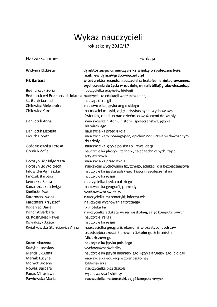 Nauczyciele zespołu w roku szkolnym 2016/2017