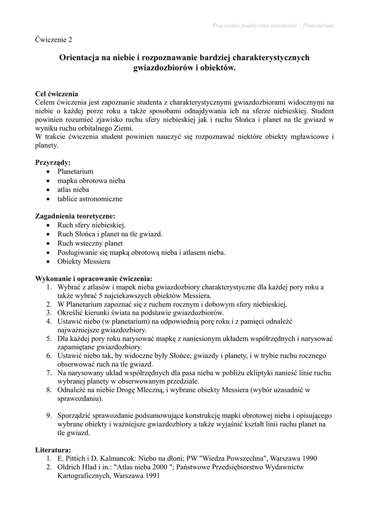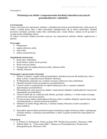 Pracownia praktyczna astronomii – Planetarium Ćwiczenie 2 Orientacja na niebie i rozpoznawanie bardziej charakterystycznych gwiazdozbiorów i obiektów. Cel ćwiczenia Celem ćwiczenia jest zapoznanie studenta z charakterystycznymi gwiazdozbiorami widocznymi na niebie o każdej porze roku a także sposobami odnajdywania ich na sferze niebieskiej. Student powinien rozumieć zjawisko ruchu sfery niebieskiej jak i ruchu Słońca i planet na tle gwiazd w wyniku ruchu orbitalnego Ziemi. W trakcie ćwiczenia student powinien nauczyć się rozpoznawać niektóre obiekty mgławicowe i planety. Przyrządy: • Planetarium • mapka obrotowa nieba • atlas nieba • tablice astronomiczne Zagadnienia teoretyczne: • Ruch sfery niebieskiej. • Ruch Słońca i planet na tle gwiazd. • Ruch wsteczny planet • Posługiwanie się mapką obrotową nieba i atlasem nieba. • Obiekty Messiera Wykonanie i opracowanie ćwiczenia: 1. Wybrać z atlasów i mapek nieba gwiazdozbiory charakterystyczne dla każdej pory roku a także wybrać 5 najciekawszych obiektów Messiera. 2. W Planetarium zapoznać się z ruchem rocznym i dobowym sfery niebieskiej. 3. Określić kierunki świata na podstawie gwiazdozbiorów. 4. Ustawić niebo (w planetarium) na odpowiednią porę roku i z pamięci odnaleźć najważniejsze gwiazdozbiory. 5. Dla każdej pory roku narysować mapkę z naniesionym układem współrzędnych i narysować zapamiętane gwiazdozbiory. 6. Ustawić niebo tak, by widoczne były Słońce, gwiazdy i planety, i w trybie ruchu rocznego obserwować ruch na tle gwiazd. 7. Na narysowany układ współrzędnych dla pasa nieba w pobliżu ekliptyki nanieść linie ruchu wybranej planety w obserwowanym przedziale. 8. Odnaleźć na niebie Drogę Mleczną, i wybrane obiekty Messiera (wybór uzasadnić w sprawozdaniu). 9. Sporządzić sprawozdanie podsumowujące konstrukcję mapki obrotowej nieba i opisującego wybrane obiekty i ważniejsze gwiazdozbiory a także wyjaśnić kształt linii ruchu planet na tle gwiazd. Literatura: 1. E. Pittich i D. Kalmancok: Niebo na dłoni; PW "Wiedza Powszechna", Warszawa 1990 2. Oldrich Hlad i in.: "Atlas nieba 2000 "; Państwowe Przedsiębiorstwo Wydawnictw Kartograficznych, Warszawa 1991