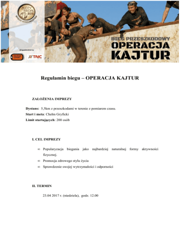 Regulamin biegu – OPERACJA KAJTUR ZAŁOŻENIA IMPREZY Dystans: 5,5km z przeszkodami w terenie z pomiarem czasu. Start i meta: Chełm Gryficki Limit startujących: 200 osób I. CEL IMPREZY • Popularyzacja biegania jako najbardziej naturalnej formy aktywności fizycznej. • Promocja zdrowego stylu życia • Sprawdzenie swojej wytrzymałości i odporności II. TERMIN 23.04 2017 r. (niedziela), godz. 12.00 III. MIEJSCE Chełm Gryficki baza Kajtur Event IV. ORGANIZATOR • TNC Sp. z o.o. • Kajtur Event, V. WSPÓŁORGANIZATOR • GRH Nałęcz • Klub Wojskowy 7 Brygada Obrony Wybrzeża im gen. bryg. Stanisława Grzmota – Skotnickiego. VI. TRASA, DYSTANS ORAZ PRZESZKODY • 5,5 kilometrów teren krosowy z 15+ przeszkodami ( rowy z wodą, bagno, opony, palety, tor wojskowy osf, siatka maskująca, okopy wojskowe oraz samochody wojskowe plus niespodzianki ) • Organizator zastrzega sobie możliwość podania pełnej listy przeszkód i trasy w dniu imprezy. • Trasa biegu zostanie oznakowana taśmą oraz znakami poziomymi. • Przekroczenie linii wyznaczonych przez taśmę, ominięcie lub niepokonanie którejś z przeszkód skutkuje zadaniem dodatkowym burpree. • Średnia szerokość trasy: trzy metry. • Punkt pomocy medycznej znajduje się na linii startu i mety. • W przypadku kontuzji uczestnik powiadamia obsługę trasy, która przekazuje informacje do punktu pomocy medycznej. • Plan trasy z zaznaczonym punktem pomocy medycznej znajduje się w biurze imprezy. VII. PROGRAM 9:00 - Otwarcie biura zawodów 11:30 - Zamknięcie biura zawodów 11.50 - Odprawa zawodników 12:00 - Start biegu ( w przypadku dużej liczby startujących możliwy start w grupach 20 osobowych co 3 min) 13.30 - Zakończenie biegu 14.00 - Dekoracja i losowanie nagród VIII. ZGŁOSZENIA I OPŁATA STARTOWA W celu zgłoszenia do biegu należy dokonać rejestracji na stronie organizatora biegu www.TNCsport.pl/ OPŁATY • Opłata w I terminie do 31.03.2017 ) wynosi 40 zł • Opłata w II terminie od (01.04.2017 ) wynosi 50 zł • Opłata w dniu zawodów wynosi 70 zł W ramach opłaty startowej każdy z uczestników biegów głównych otrzyma: medal okolicznościowy, wodę, posiłek regeneracyjny. 1. Wniesiona opłata nie podlega zwrotowi. 2. Opłata nie może być scedowana na innego zawodnika. 3. Wniesienie opłaty startowej jest równoznaczne z akceptacją regulaminu zawodów. 4. Uczestnicy, którzy nie ukończyli 18 roku życia nie mogą uczestniczyć w biegu. 5. Po biegu odbędzie się losowanie nagród, na podstawie posiadanych numerów startowych. IX. KLASYFIKACJE Prowadzona będzie klasyfikacja OPEN dla kobiet i mężczyzn, na podstawie czasu brutto. Każdy z uczestników na mecie otrzyma medal okolicznościowy. X. UBEZPIECZENIE Organizator posiada ubezpieczenie OC i NW. XI. POSTANOWIENIA KOŃCOWE 1. Wszelkie kwestie sporne rozstrzyga organizator zawodów. 2. Należy przestrzegać zasad bezpieczeństwa przeciwpożarowego oraz ochrony przyrody, jak również dbać o porządek w miejscu zawodów. 3. Wiążąca i ostateczna interpretacja niniejszego regulaminu należy do dyrektora biegu. 4. Informacje pod numerami telefonu: 661 926 636 Piotr, 603 325 862 Marek oraz na stronie www.TNCsport.pl/ Formularz rejestracyjny Operacja Kajtur Trzebiatów (Chełm Gryficki) 23.04.2017 r. DANE OSOBOWE: Nr startowy ........................ Imię i Nazwisko ............................................................................................................................... Data urodzenia ................................................................................................................................ OŚWIADCZENIE ZAWODNIKA PEŁNOLETNIEGO *Oświadczam, że biorę udział w Operacji Kajurna własną odpowiedzialność i nie będę wnosić żadnych roszczeń w stosunku do organizatorów imprezy w razie zaistnienia zdarzeń losowych podczas trwania imprezy. Jednocześnie oświadczam, że znane są mi postanowienia REGULAMINU BIEGU, które to postanowienia w pełni akceptuję i zobowiązuję się do ich bezwzględnego przestrzegania. *Wyrażam zgodę na rozpowszechnienie mojego wizerunku, w tym do publikacji, pokazywania i wykorzystywania w zależności od wyboru zdjęć, portretu, jak również do rozpowszechniania nazwiska. *Niniejszym oświadczam, że stan mojego zdrowia zezwala na udział w biegu. Podpis zawodnika .............................................................. POWODZENIA