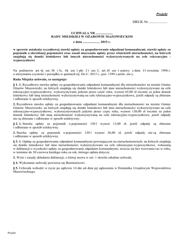 Projekt DRUK Nr .................... UCHWAŁA NR .................... RADY MIEJSKIEJ W OŻAROWIE MAZOWIECKIM z dnia .................... 2015 r. w sprawie ustalenia ryczałtowej stawki opłaty za gospodarowanie odpadami komunalnymi, stawki opłaty za pojemnik o określonej pojemności oraz zasad uiszczania opłaty przez właścicieli nieruchomości, na których znajdują się domki letniskowe lub innych nieruchomości wykorzystywanych na cele rekreacyjno wypoczynkowe Na podstawie art. 6j ust. 3b i 3c, 6k ust. 1 pkt 2 i ust. 3, art. 6l ust. 1 ustawy z dnia 13 września 1996 r. o utrzymaniu czystości i porządku w gminach (tj. Dz.U. 2013 r., poz. 1399 z późn. zm.), Rada Miejska uchwala, co następuje: § 1. 1. Ryczałtowa stawka opłaty za gospodarowanie odpadami komunalnymi dla nieruchomości na terenie Gminy Ożarów Mazowiecki, na których znajdują się domki letniskowe lub inne nieruchomości wykorzystywane na cele rekreacyjno-wypoczynkowe, wykorzystywane jedynie przez część roku, wynosi 65,00 zł rocznie za jeden domek letniskowy lub inną nieruchomość wykorzystywaną na cele rekreacyjno-wypoczynkowe, jeżeli odpady są zbierane i odbierane w sposób selektywny. 2. Ryczałtowa stawka opłaty za gospodarowanie odpadami komunalnymi dla nieruchomości na terenie Gminy Ożarów Mazowiecki, na których znajdują się domki letniskowe lub inne nieruchomości wykorzystywane na cele rekreacyjno-wypoczynkowe, wykorzystywanych jedynie przez częśc roku, wynosi 130,00 zł rocznie za jeden domek letniskowy lub inną nieruchomość wykorzystywaną na cele rekreacyjno-wypoczynkowe, jeżeli odpady nie są zbierane i odbierane w sposób selektywny. § 2. 1. Stawka opłaty za pojemnik o pojemności 120 l wynosi 13,00 zł, jeżeli odpady są zbierane i odbierane w sposób selektywny. 2. Stawka opłaty za pojemnik o pojemności 120 l wynosi 26,00 zł, jeżeli odpady nie są zbierane i odbierane w sposób selektywny. § 3. 1. Opłatę za gospodarowanie odpadami komunalnymi powstającymi na nieruchomościach, na których znajdują się domki letniskowe lub inne nieruchomości wykorzystywane na cele rekreacyjno-wypoczynkowe, wskazaną w deklaracji o wysokości opłaty za gospodarowanie odpadami komunalnymi, uiszcza się bez wezwania raz w roku, w terminie do 30 czerwca każdego roku za rok, którego opłata dotyczy. 2. Wzór i zasady składania deklaracji, o której mowa w ust. 1 określa odrębna uchwała. § 4. Wykonanie uchwały powierza się Burmistrzowi. § 5. Uchwała wchodzi w życie po upływie 14 dni od dnia jej ogłoszenia w Dzienniku Urzędowym Województwa Mazowieckiego. Projekt Uzasadnienie Nowelizacja ustawy o utrzymaniu czystości i porządku w gminach z dnia 28 listopada 2014 r. (Dz.U.2015.87) wskazała, że zgodnie z art. 6j ust. 3b ww ustawy, w przypadku nieruchomości, na których znajdują się domki letniskowe lub innych nieruchomości wykorzystywanych na cele rekreacyjno-wypoczynkowe, wykorzystywanych jedynie przez część roku, rada miejska uchwala ryczałtową stawkę opłaty za gospodarowanie odpadami komunalnymi za rok od domku letniskowego lub od innej nieruchomości wykorzystywanej na cele rekreacyjnowypoczynkowe. Ryczałtowa stawka opłaty ustalana jest jako iloczyn średniej ilości odpadów powstających na nieruchomościach, na których znajdują się domki letniskowe lub innych nieruchomości o charakterze rekreacyjno-wypoczynkowym, wyrażonej w liczbie pojemników oraz stawki opłaty za gospodarowanie odpadami komunalnymi za pojemnik o określonej pojemności. Na terenie Gminy Ożarów Mazowiecki występują jedynie nieruchomości o charakterze rekreacyjnowypoczynkowym tj. ogródki działkowe. Według informacji uzyskanych z zarządu ogródków działkowych średnia ilość odpadów powstająca na nieruchomościach, o których mowa w art. 6j ust. 3b ustawy o utrzymaniu czystości i porządku w gminach, wynosi w skali roku 570 l, co przekłada się na 5 pojemników o pojemności 120 l. Stawkę za pojemnik 120 l ustalono w wysokości 13 zł w przypadku gromadzenia i odbioru odpadów w sposób selektywny oraz 26 zł w przypadku braku segregacji. Kalkulacja tej stawki wynika ze średniej ceny usługi wywozu odpadów komunalnych świadczonych przez podmioty na terenie gminy Ożarów Mazowiecki, kosztów funkcjonowania systemu gospodarowania odpadami komunalnymi oraz sezonowego charakteru nieruchomości. W związku z powyższym roczną ryczałtową stawkę opłaty dla nieruchomości, na których znajdują się domki letniskowe lub inne nieruchomości wykorzystywane na cele rekreacyjno-wypoczynkowe ustala się w wysokości 65,00 zł dla nieruchomości, na których odpady gromadzone są i odbierane w spośob selektywny oraz 130,00 zł dla nieruchomości, na których odpady nie są gromadzone i odbierane w sposób selektywny. Projekt