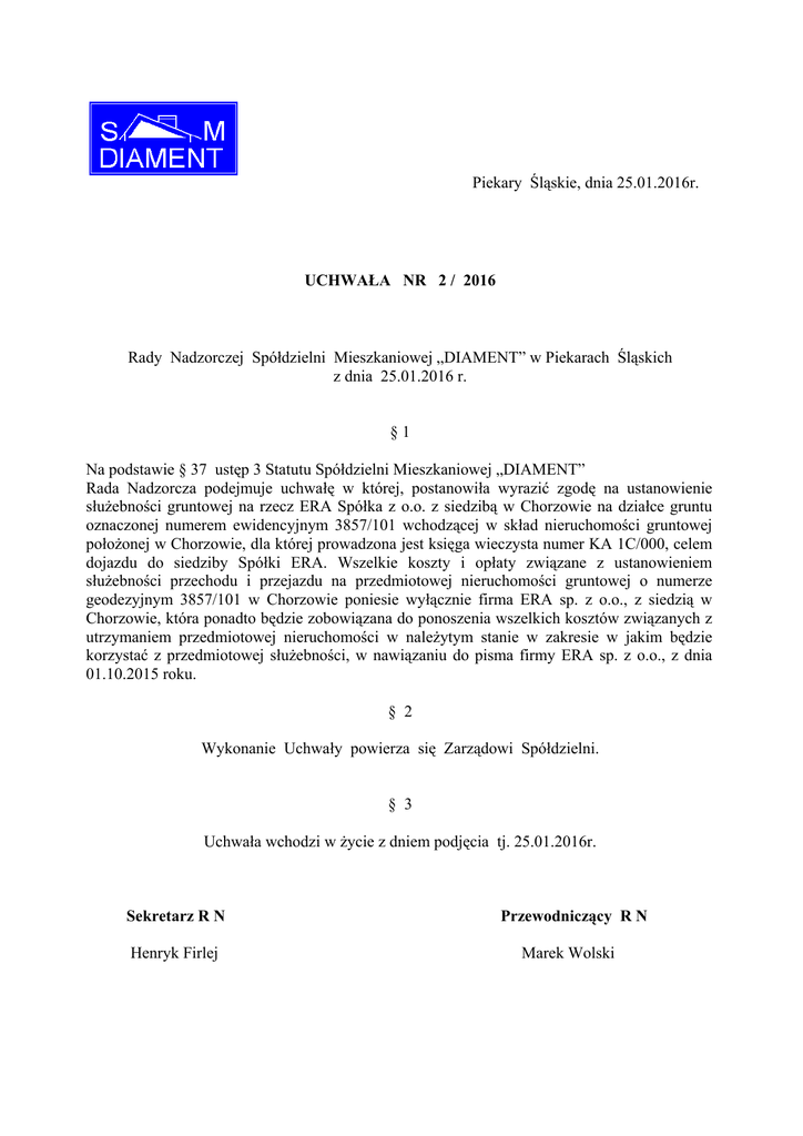 Piekary Śląskie, dnia 25.01.2016r. UCHWAŁA NR 2 / 2016 Rady Nadzorczej Spółdzielni Mieszkaniowej „DIAMENT” w Piekarach Śląskich z dnia 25.01.2016 r. §1 Na podstawie § 37 ustęp 3 Statutu Spółdzielni Mieszkaniowej „DIAMENT” Rada Nadzorcza podejmuje uchwałę w której, postanowiła wyrazić zgodę na ustanowienie służebności gruntowej na rzecz ERA Spółka z o.o. z siedzibą w Chorzowie na działce gruntu oznaczonej numerem ewidencyjnym 3857/101 wchodzącej w skład nieruchomości gruntowej położonej w Chorzowie, dla której prowadzona jest księga wieczysta numer KA 1C/000, celem dojazdu do siedziby Spółki ERA. Wszelkie koszty i opłaty związane z ustanowieniem służebności przechodu i przejazdu na przedmiotowej nieruchomości gruntowej o numerze geodezyjnym 3857/101 w Chorzowie poniesie wyłącznie firma ERA sp. z o.o., z siedzią w Chorzowie, która ponadto będzie zobowiązana do ponoszenia wszelkich kosztów związanych z utrzymaniem przedmiotowej nieruchomości w należytym stanie w zakresie w jakim będzie korzystać z przedmiotowej służebności, w nawiązaniu do pisma firmy ERA sp. z o.o., z dnia 01.10.2015 roku. § 2 Wykonanie Uchwały powierza się Zarządowi Spółdzielni. § 3 Uchwała wchodzi w życie z dniem podjęcia tj. 25.01.2016r. Sekretarz R N Henryk Firlej Przewodniczący R N Marek Wolski