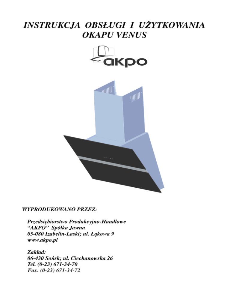INSTRUKCJA OBSŁUGI I UŻYTKOWANIA OKAPU VENUS WYPRODUKOWANO PRZEZ: Przedsiębiorstwo Produkcyjno-Handlowe “AKPO” Spółka Jawna 05-080 Izabelin-Laski; ul. Łąkowa 9 www.akpo.pl Zakład: 06-430 Sońsk; ul. Ciechanowska 26 Tel. (0-23) 671-34-70 Fax. (0-23) 671-34-72 SZANOWNI PAŃSTWO Serdecznie gratulujemy Państwu dokonania trafnego wyboru. Nasze urządzenia projektowane i wykonywane są z myślą o spełnieniu Państwa oczekiwań i z pewnością będą stanowić część nowocześnie wyposażonego gospodarstwa domowego. Jesteśmy przekonani, że nowoczesne, funkcjonalne i praktyczne urządzenia, wyprodukowane z najwyższej jakości materiałów, spełnią wszystkie Państwa wymagania. Przed przystąpieniem do montażu i użytkowania zakupionego okapu prosimy o dokładne zapoznanie się z treścią niniejszej instrukcji, a także zawartych w niej reguł bezpieczeństwa użytkowania. Życzymy satysfakcji i zadowolenia z wyboru okapu naszej firmy. 1. INFORMACJE OGÓLNE Okap kuchenny Venus został zaprojektowany do usuwania oparów kuchennych w trybie wyciągowym (przewody poprowadzone na zewnątrz) lub w trybie pochłaniacza (obieg wewnętrzny). Jest przeznaczony do mocowania nad gazową lub elektryczną płytą grzewczą. Posiada niezależne oświetlenie oraz turbinę wyciągową z możliwością ustawienia jednej z pięciu prędkości obrotowych. UWAGA: Prosimy zachować dowód zakupu wraz z podstemplowaną kartą gwarancyjną w celu ewentualnej reklamacji. Bez tych dokumentów gwarancja jest nieważna. Producent zrzeka się odpowiedzialności za uszkodzenia i obrażenia powstałe wskutek montażu i użytkowania niezgodnego z instrukcją obsługi zawartą w niniejszym tekście. 2. PARAMETRY TECHNICZNE CECHY CHARAKTRYSTYCZNE VENUS Napięcie znamionowe 230V-50Hz Moc ogólna 143,6W / 253,6 W Moc silnika 140 W / 250 W Moc oświetlenia 2 x1,8 W Wydajność max. 650 m3/h / 800 m3/h Sprzęt klasy drugiej Rodzaj pracy ciągła pod nadzorem 3. INSTALACJA 3.1 USTAWIENIE TRYBU PRACY OKAPU Okap VENUS może pracować w dwóch trybach: 1)Wyciągu (Rys.2a) - odprowadzenie powietrza na zewnątrz budynku poprzez połączenie okapu sztywną rurą z tworzywa sztucznego Ø150mm z kanałem wentylacyjnym lub Ø120mm z zastosowaniem redukcji. 2)Pochłaniacza (Rys.2b) - obieg wewnętrzny powietrza, przy użyciu filtrów węglowych (Rys.1). Rys.1 Przy obiegu wewnętrznym konieczne jest zamontowanie filtrów węglowych (Rys.1). Oczyszczone powietrze przez filtry powraca do obiegu otworem wylotowym. Filtry węglowe należy wymieniać nie rzadziej niż raz na 3 miesiące (w zależności od intensywności gotowania). a) WYCIĄG b) POCHŁANIACZ Rys.2 UWAGA: Powietrze z okapu nie powinno być odprowadzane do kanału kominowego służącego do odprowadzania spalin z przyrządów spalających gaz lub inne paliwa. 3.2 PODŁĄCZENIE ELEKTRYCZNE Przed podłączeniem okapu do prądu należy sprawdzić, czy napięcie i częstotliwość prądu zasilającego odpowiada danym podanym na tabliczce znamionowej urządzenia. Okap musi być podłączony do łatwo dostępnego gniazdka. Niedopuszczalne jest usuwanie wtyczki i podłączanie na stałe okapu do zasilania. Okap należy podłączyć do zasilania po niniejszym montażu. 4. MONTAŻ Odległość „A” pomiędzy najniższą częścią okapu nadkuchennego a powierzchnią podtrzymującą naczynia do przyrządzania potraw powinna wynosić min. 65 cm dla kuchni gazowej (Rys.3). W czasie prac montażowych należy przestrzegać obowiązujących przepisów dotyczących odprowadzania powietrza. Gdy okap nadkuchenny jest używany w tym samym czasie co przyrządy spalające gaz lub inne paliwa, pomieszczenie powinno być odpowiednio wentylowane. W celu uzyskania optymalnego odprowadzenia powietrza należy stosować sztywny przewód z tworzywa sztucznego o przekroju Ø150 mm lub Ø120mm po zastosowaniu redukcji. Rys. 3 4.1 CZĘŚCI SKŁADOWE DO MONTAŻU 1- korpus okapu 2- maskownica dolna 3- maskownica teleskopowa górna 4- listwa montażowa do maskownicy 5- dwa kołki rozporowe 10x50 mm z wkrętami 6- dwa kołki rozporowe 5x25 mm z wkrętami 7- dwa wkręty 3,9x6,5 mm 5 6 7 Rys.4 4.2 MONTAŻ KORPUSU OKAPU •Otworzyć szybę pociągając do siebie za dolną krawędź (rys.5). •Zdemontować aluminiowy filtr tłuszczowy (rys.9) •Przyłożyć obudowę okapu do ściany zachowując minimalną odległość 65 cm od dolnej krawędzi okapu do powierzchni podtrzymującej naczynia do przyrządzania potraw na płycie kuchennej (rys.3), •Zaznaczyć na ścianie rozstaw otworów montażowych korpusu okapu, •Wywiercić zaznaczone na ścianie otwory używając wiertła o średnicy odpowiadającej załączonym kołkom rozporowym wraz z wkrętami (5) (rys.4), wbić kołki, a następnie przykręcić do ściany obudowę okapu. •Zamontować filtr tłuszczowy (rys.9). •Zamknąć szybę Rys.5 Rys.6 4.3 MONTAŻ RUR OSŁANIAJĄCYCH •Na przymocowany do ściany okap włożyć rury osłonowe (2) i (3) (rys.4), •Wysunąć wewnętrzną rurę (3) na żądaną wysokość, •Zaznaczyć na ścianie położenie otworów znajdujących się w wewnętrznej rurze osłonowej (3) w celu właściwego usytuowania wysokości montażu wspornika (4), •Przyłożyć wspornik (4) na zaznaczonej wysokości i zaznaczyć otwory do montażu, •Wywiercić na ścianie otwory używając wiertła o średnicy odpowiadającej załączonym kołkom rozporowym (6). Zamocować na ścianie wspornik (4) na zaznaczonej wysokości, •Wysunąć wewnętrzną maskownicę (3) i połączyć wkrętami (7) ze wspornikiem (4). (Rys.6) 5. OBSŁUGA 5.1 PANEL STEROWANIA Okap VENUS jest wyposażony w sterowanie elektroniczne dotykowe z wyświetlaczem (Rys.7) A B C D E Rys.7 Sterowanie (Rys.7): A – timer B – minus C – wyświetlacz D – plus E – oświetlenie 1. Sterowanie pracy turbiny •Przycisk PLUS umożliwia ustawianie kolejnych prędkości wyciągu (5biegów), •Przytrzymanie przycisku PLUS powoduje ustawienie ostatniego bie