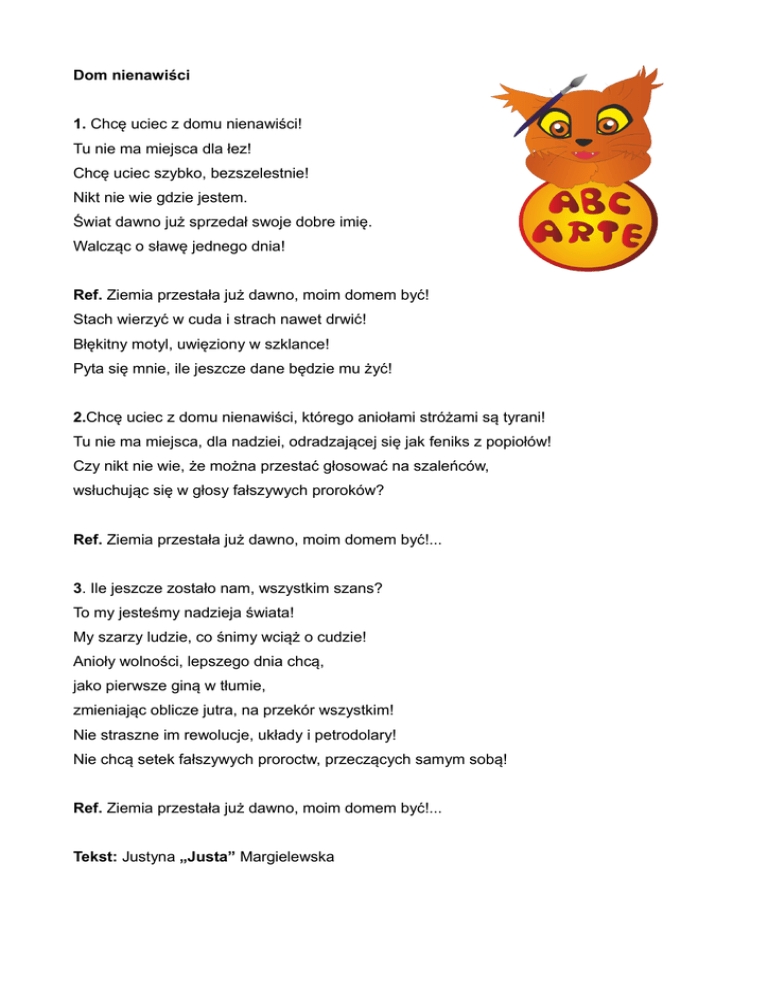 Dom nienawiści 1. Chcę uciec z domu nienawiści! Tu nie ma miejsca dla łez! Chcę uciec szybko, bezszelestnie! Nikt nie wie gdzie jestem. Świat dawno już sprzedał swoje dobre imię. Walcząc o sławę jednego dnia! Ref. Ziemia przestała już dawno, moim domem być! Stach wierzyć w cuda i strach nawet drwić! Błękitny motyl, uwięziony w szklance! Pyta się mnie, ile jeszcze dane będzie mu żyć! 2.Chcę uciec z domu nienawiści, którego aniołami stróżami są tyrani! Tu nie ma miejsca, dla nadziei, odradzającej się jak feniks z popiołów! Czy nikt nie wie, że można przestać głosować na szaleńców, wsłuchując się w głosy fałszywych proroków? Ref. Ziemia przestała już dawno, moim domem być!... 3. Ile jeszcze zostało nam, wszystkim szans? To my jesteśmy nadzieja świata! My szarzy ludzie, co śnimy wciąż o cudzie! Anioły wolności, lepszego dnia chcą, jako pierwsze giną w tłumie, zmieniając oblicze jutra, na przekór wszystkim! Nie straszne im rewolucje, układy i petrodolary! Nie chcą setek fałszywych proroctw, przeczących samym sobą! Ref. Ziemia przestała już dawno, moim domem być!... Tekst: Justyna „Justa” Margielewska