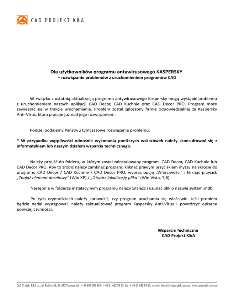 Dla użytkowników programu antywirusowego KASPERSKY – rozwiązanie problemów z uruchomieniem programów CAD W związku z ostatnią aktualizacją programu antywirusowego Kaspersky mogą wystąpić problemu z uruchomieniem naszych aplikacji CAD Decor, CAD Kuchnie oraz CAD Decor PRO. Program może zawieszać się w trakcie uruchamiania. Problem został zgłoszony firmie odpowiedzialnej za Kaspersky Anti-Virus, która pracuje już nad jego rozwiązaniem. Poniżej podajemy Państwu tymczasowe rozwiązanie problemu: * W przypadku wątpliwości odnośnie wykonania poniższych wskazówek należy skonsultować się z informatykiem lub naszym działem wsparcia technicznego. Należy przejść do folderu, w którym został zainstalowany program CAD Decor, CAD Kuchnie lub CAD Decor PRO. Aby to zrobić należy zamknąć program, kliknąć prawym przyciskiem myszy na skrócie do programu CAD Decor / CAD Kuchnie / CAD Decor PRO, wybrać opcję „Właściwości” i kliknąć przycisk „Znajdź element docelowy” (Win XP) / „Otwórz lokalizację pliku” (Win Vista, 7,8). Następnie w folderze instalacyjnym programu należy znaleźć i usunąć plik o nazwie system.mdb. Po tych czynnościach należy sprawdzić, czy program uruchamia się właściwie. Jeśli problem będzie nadal występował, należy zaktualizować program Kaspersky Anti-Virus i powtórzyć opisane powyżej czynności. Wsparcie Techniczne CAD Projekt K&A