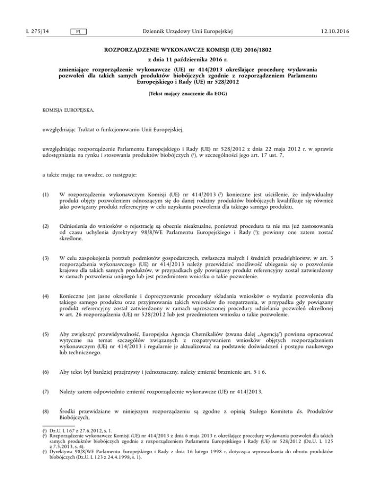 L 275/34 Dziennik Urzędowy Unii Europejskiej PL 12.10.2016 ROZPORZĄDZENIE WYKONAWCZE KOMISJI (UE) 2016/1802 z dnia 11 października 2016 r. zmieniające rozporządzenie wykonawcze (UE) nr 414/2013 określające procedurę wydawania pozwoleń dla takich samych produktów biobójczych zgodnie z rozporządzeniem Parlamentu Europejskiego i Rady (UE) nr 528/2012 (Tekst mający znaczenie dla EOG) KOMISJA EUROPEJSKA, uwzględniając Traktat o funkcjonowaniu Unii Europejskiej, uwzględniając rozporządzenie Parlamentu Europejskiego i Rady (UE) nr 528/2012 z dnia 22 maja 2012 r. w sprawie udostępniania na rynku i stosowania produktów biobójczych (1), w szczególności jego art. 17 ust. 7, a także mając na uwadze, co następuje: (1) W rozporządzeniu wykonawczym Komisji (UE) nr 414/2013 (2) konieczne jest uściślenie, że indywidualny produkt objęty pozwoleniem odnoszącym się do danej rodziny produktów biobójczych kwalifikuje się również jako powiązany produkt referencyjny w celu uzyskania pozwolenia dla takiego samego produktu. (2) Odniesienia do wniosków o rejestrację są obecnie nieaktualne, ponieważ procedura ta nie ma już zastosowania od czasu uchylenia dyrektywy 98/8/WE Parlamentu Europejskiego i Rady (3); powinny one zatem zostać skreślone. (3) W celu zaspokojenia potrzeb podmiotów gospodarczych, zwłaszcza małych i średnich przedsiębiorstw, w art. 3 rozporządzenia wykonawczego (UE) nr 414/2013 należy przewidzieć możliwość ubiegania się o pozwolenie krajowe dla takich samych produktów, w przypadkach gdy powiązany produkt referencyjny został zatwierdzony w ramach pozwolenia unijnego lub jest przedmiotem wniosku o takie pozwolenie. (4) Konieczne jest jasne określenie i doprecyzowanie procedury składania wniosków o wydanie pozwolenia dla takiego samego produktu oraz przyjmowania takich wniosków do rozpatrzenia, w przypadku gdy powiązany produkt referencyjny został zatwierdzony w ramach uproszczonej procedury udzielania pozwoleń określonej w art. 26 rozporządzenia (UE) nr 528/2012 lub jest przedmiotem wniosku o takie pozwolenie. (5) Aby zwiększyć przewidywalność, Europejska Agencja Chemikaliów (zwana dalej „Agencją”) powinna opracować wytyczne na temat szczegółów związanych z rozpatrywaniem wniosków objętych rozporządzeniem wykonawczym (UE) nr 414/2013 i regularnie je aktualizować na podstawie doświadczeń i postępu naukowego lub technicznego. (6) Aby tekst był bardziej przejrzysty i jednoznaczny, należy zmienić brzmienie art. 5 i 6. (7) Należy zatem odpowiednio zmienić rozporządzenie wykonawcze (UE) nr 414/2013. (8) Środki przewidziane w niniejszym rozporządzeniu są zgodne z opinią Stałego Komitetu ds. Produktów Biobójczych, (1) Dz.U. L 167 z 27.6.2012, s. 1. (2) Rozporządzenie wykonawcze Komisji (UE) nr 414/2013 z dnia 6 maja 2013 r. określające procedurę wydawania pozwoleń dla takich samych produktów biobójczych zgodnie z rozporządzeniem Parlamentu Europejskiego i Rady (UE) nr 528/2012 (Dz.U. L 125 z 7.5.2013, s. 4). (3) Dyrektywa 98/8/WE Parlamentu Europejskiego i Rady z dnia 16 lutego 1998 r. dotycząca wprowadzania do obrotu produktów biobójczych (Dz.U. L 123 z 24.4.1998, s. 1). 12.10.2016 PL Dziennik Urzędowy Unii Europejskiej L 275/35 PRZYJMUJE NINIEJSZE ROZPORZĄDZENIE: Artykuł 1 W rozporządzeniu wykonawczym (UE) nr 414/2013 wprowadza się następujące zmiany: 1) art. 1 otrzymuje brzmienie: „Artykuł 1 Przedmiot Niniejsze rozporządzenie ustanawia procedurę mającą zastosowanie w przypadku składania wniosku o pozwolenie dla produktu (»taki sam produkt«) identycznego z innym pojedynczym produktem biobójczym, rodziną produktów biobójczych lub indywidualnym produktem z rodziny produktów biobójczych, które zostały zatwierdzone lub zarejestrowane zgodnie z dyrektywą 98/8/WE Parlamentu Europejskiego i Rady (*) lub rozporządzeniem (UE) nr 528/2012 lub w odniesieniu do których złożono wniosek o pozwolenie (»powiązany produkt referencyjny«) w zakresie wszystkich najnowszych informacji przedłożonych w związku z zatwierdzeniem lub rejestracją, z wyjątkiem informacji, które mogą być przedmiotem zmian administracyjnych zgodnie z rozporządzeniem wykonawczym Komisji (UE) nr 354/2013 (**). (*) Dyrektywa 98/8/WE Parlamentu Europejskiego i Rady z dnia 16 lutego 1998 r. dotycząca wprowadzania do obrotu produktów biobójczych (Dz.U. L 123 z 24.4.1998, s. 1). (**) Rozporządzenie wykonawcze Komisji (UE) nr 354/2013 z dnia 18 kwietnia 2013 r. w sprawie zmian produktów biobójczych, na które udzielono pozwolenia zgodnie z rozporządzeniem Parlamentu Europejskiego i Rady (UE) nr 528/2012 (Dz.U. L 109 z 19.4.2013, s. 4).”; 2) w art. 3 dodaje się ust. 1a w brzmieniu: „1a. W przypadku gdy powiązany produkt referencyjny został zatwierdzony w ramach pozwolenia unijnego lub jest przedmiotem wniosku o takie pozwolenie, wnioski o udzielenie pozwolenia krajowego dla takiego samego produktu składa się zgodnie z art. 29 ust. 1 rozporządzenia (UE) nr 528/2012 do właściwego organu w państwie członkowskim, w którym złożono wniosek o udzielenie pozwolenia krajowego.”; 3) dodaje się art. 4a i 4b w brzmieniu: „Artykuł 4a Składanie i przyjmowanie wniosków do rozpatrzenia w ramach procedury uproszczonej 1. W przypadku gdy powiązany produkt referencyjny został zatwierdzony zgodnie z art. 26 ust. 3 rozporządzenia (UE) nr 528/2012 lub jest przedmiotem wniosku o takie pozwolenie, wnioski o udzielenie pozwolenia dla takiego samego produktu składa się zgodnie z art. 26 ust. 1 tego rozporządzenia do właściwego organu, który wydał pozwolenie lub do którego złożono wniosek o przyznanie takiego pozwolenia dla powiązanego produktu referen cyjnego. 2. Właściwy organ przyjmuje wniosek do rozpatrzenia zgodnie z art. 26 ust. 2 rozporządzenia (UE) nr 528/2012. Artykuł 4b Wytyczne dotyczące rozpatrywania wniosków o pozwolenie dla takich samych produktów 1. Po konsultacji