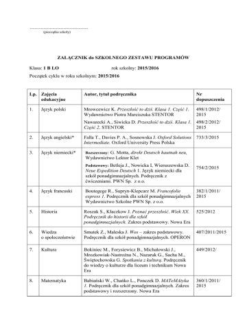 ............................................... (pieczątka szkoły) ZAŁĄCZNIK do SZKOLNEGO ZESTAWU PROGRAMÓW Klasa: 1 B LO rok szkolny: 2015/2016 Początek cyklu w roku szkolnym: 2015/2016 Lp. Zajęcia edukacyjne 1. Język polski Autor, tytuł podręcznika Nr dopuszczenia Mrowcewicz K. Przeszłość to dziś. Klasa 1. Część 1. Wydawnictwo Piotra Marciszuka STENTOR 498/1/2012/ 2015 Nawarecki A., Siwicka D. Przeszłość to dziś. Klasa 1. 498/2/2012/ Część 2. STENTOR 2015 2. Język angielski* 3. Język niemiecki* Falla T., Davies P. A., Sosnowska J. Oxford Solutions 733/3/2015 Intermediate. Oxford University Press Polska Rozszerzony: G. Motta, direkt Deutsch hautnah neu, Wydawnictwo Lektor Klet Podstawowy: Betleja J., Nowicka I, Wieruszewska D. Neue Expedition Deutsch 1. Język niemiecki dla szkół ponadgimnazjalnych. Podręcznik z ćwiczeniami. PWN Sp. z o.o. 754/2/2015 4. Język francuski Boutegege R., Supryn-Klepcarz M. Francofolie express 1. Podręcznik dla szkół ponadgimnazjalnych Wydawnictwo Szkolne PWN Sp. z o.o. 382/1/2011/ 2015 5. Historia Roszak S., Kłaczkow J. Poznać przeszłość. Wiek XX. Podręcznik do historii dla szkół ponadgimnazjalnych. Zakres podstawowy. Nowa Era 525/2012 6. Wiedza o społeczeństwie Smutek Z., Maleska J. Wos – zakres podstawowy. Podręcznik dla szkół ponadgimnazjalnych. OPERON 407/2011/2015 7. Kultura Bokiniec M., Forysiewicz B., Michałowski J., Mrozkowiak-Nastrożna N., Nazaruk G., Sacha M., Świętochowska G. Spotkania z kulturą. Podręcznik do wiedzy o kulturze dla liceum i technikum Nowa Era 449/2012/ 8. Matematyka Babiański W., Chańko L., Ponczek D. MATeMAtyka 1. Podręcznik dla szkół ponadgimnazjalnych. Zakres podstawowy i rozszerzony. Nowa Era 360/1/2011/ 2015 9. Fizyka Braun M., Śliwa W., Odkryć fizykę. Podręcznik dla szkół ponadgimnazjalnych. Kształcenie ogólne w zakresie podstawowym. Nowa Era 447/2012/2015 10. Chemia Hassa R., Mrzigod A., Mrzigod J. To jest chemia. Podręcznik dla szkół ponadgimnazjalnych. Zakres podstawowy. Nowa Era 438/2012/2015 11. Biologia Bonar E., Krzeszowiec-Jeleń W., Czachorowski S. Biologia na czasie. Podręcznik dla szkół ponadgimazjalnych. Zakres podstawowy. Nowa Era 450/2012/2015 12. Geografia Uliszak R., Wiedermann K. Oblicza geografii. Podręcznik dla szkół ponadgimnazjalnych. Zakres podstawowy. Nowa Era 433/2012/2014 13. Przedsiębiorczość Makieła Z., Rachwał T. Krok w przedsiębiorczość. Podręcznik dla szkół ponadgimnazjalnych. Nowa Era 467/2012/2015 14. Informatyka Koba G. Informatyka dla szkół ponadgimnazjalnych. Zakres podstawowy. MIGRA Sp. z o. o. 536/2012 15. Edukacja dla bezpieczeństwa Słoma J. Żyję i działam bezpiecznie. Podręcznik do edukacji dla bezpieczeństwa dla szkół ponadgimnazjalnych. Nowa Era 426/2012/2015 16. W-f Brak podręcznika 17. Religia Szpet J., Jachowiak D. Moje miejsce w Kościele AZ 41-01/10PO1/1 *Prosimy wstrzymać się z zakupem podręcznika do języka angielskiego i niemieckiego do września, kiedy zostaną przeprowadzone testy sprawdzające kompetencje językowe uczniów. Uczeń obowiązany jest posiadać wyposażenie szkolne: zeszyty, materiały piśmienne, kalkulator, przyrządy geometryczne itp. Na zajęciach z wychowania fizycznego obowiązuje strój sportowy: spodenki gimnastyczne, koszulka, obuwie sportowe inne na salę gimnastyczną i na boisko, skarpetki oraz dres. Zalecane jest korzystanie przez ucznia z pomocy dydaktycznych poszerzających wiedzę z danego przedmiotu, na przykład zbiory zadań, zeszyty ćwiczeń, słowniki, atlasy itp, wskazane przez uczących nauczycieli. ................................................................. (data, pieczęć i podpis dyrektora szkoły)