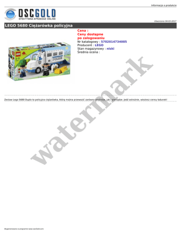 Informacje o produkcie Utworzono 04-03-2017 LEGO 5680 Ciężarówka policyjna Cena : Ceny dostępne po zalogowaniu er m ar k Nr katalogowy : 5702014734005 Producent : LEGO Stan magazynowy : niski Średnia ocena : w at Zestaw Lego 5680 Duplo to policyjna ciężarówka, którą można przewozić zarówno więźniów, jak i pieniądze. Jedź ostrożnie, wieziesz cenny ładunek! Wygenerowano w programie www.oscGold.com