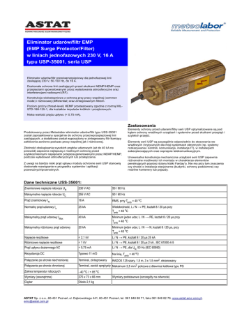 Eliminator udarów/filtr EMP (EMP Surge Protector/Filter) w liniach jednofazowych 230 V, 16 A typu USP-35001, seria USP Eliminator udarów/filtr przeciwprzepięciowy dla jednofazowej linii zasilającej 230 V, 50 / 60 Hz, do 16 A. Doskonała ochrona linii zasilających przed skutkami NEMP/HEMP oraz przepięciami spowodowanymi przez wyładowania atmosferyczne oraz interferencjami radiowymi (RF). Konstrukcja wielostopniowa z ochroną przy pracy wspólnej (common mode) i róŜnicowej (differential) oraz zintegrowanym filtrem. Poziom groźny (threat-level) HEMP przetestowany zgodnie z normą MILSTD-188-125-1, dla kształtów impulsów krótkich i przejściowych. Niska wartość prądu upływu (< 0,75 mA). Zastosowania Produkowany przez Meteolabor eliminator udarów/filtr typu USS-35001 został zaprojektowany specjalnie do ochrony przeciwprzepięciowej linii zasilających, a dodatkowo został wyposaŜony w zintegrowany filtr tłumiący zakłócenia zarówno podczas pracy wspólnej jak i róŜnicowej. Zdolność obsługiwania wysokich prądów udarowych (aŜ do 40 kA na przewód) zapewnia najlepszą z moŜliwych ochronę przed szybkozmiennymi napięciami przejścia generowanymi przez NEMP/HEMP, podczas wyładowań atmosferycznych lub przełączania. Z uwagi na bardzo niski prąd upływu moduły ochronne serii USP stanowią doskonałe rozwiązanie w przypadku systemów i aplikacji przewoźnych/przenośnych. Elementy ochrony przed udarami/filtry serii USP optymalizowane są pod kątem ochrony wraŜliwych urządzeń i systemów przed skutkami przepięć i szybkich przejść. Elementy serii USP są szczególnie odpowiednie do stosowania we wraŜliwych i krytycznych dla misji systemach obronnych (np. systemy rozkazywania i kontroli, komunikacja, instalacje IT), w instalacjach zabezpieczających oraz osprzęcie telekomunikacyjnym. Uniwersalna konstrukcja mechaniczna urządzeń serii USP zapewnia róŜnorodne moŜliwości ich montaŜu w charakterze elementów penetrujących poprzez ściany klatki Farday’a. Nie ma przy tym znaczenia czy chodzi o instalacje stacjonarne (budynki, schrony podziemne) czy mobilne kontenery lub pojazdy. Dane techniczne USS-35001: Znamionowe napięcie robocze UN 230 V AC 50 / 60 Hz Maksymalne napięcie robocze UC 255 V AC 50 / 60 Hz Prąd znamionowy IN 16 A RMS, przy Tamb = 40 oC Normalny prąd udarowy In 25 kA Wielokrotność, L / N → PE, kształt 8 / 20 µs przy Tamb = 40 oC Maksymalny prąd udarowy IMax 40 kA Minimum jeden udar, L / N → PE, kształt 8 / 20 µs przy Tamb = 40 oC Maksymalny róŜnicowy prąd udarowy 20 kA Minimum jeden udar, L / N → N, kształt 8 / 20 µs, przy Tamb = 40 oC Napięcie resztkowe < 2,1 kV L / N → PE, kształt 8 / 20 µs 25 kA RóŜnicowe napięcie resztkowe < 1 kV L / N → PE, kształt 8 / 20 µs 2 kA , IEC 61000-4-5 Prąd upływu doziemnego AC < 0,75 mA L / N → PE, dla UN, 50 Hz (IEC 60950) Rezystancja DC Typowo 11 mΏ Na linię, Tamb = 40 oC Połączenie po stronie niechronionej Terminal, zintegrowany RADOX 125 szary, 1,5 m, 3 x 1,5 mm2, ekranowany Połączenie po stronie chronionej Terminal, zacisk spręŜysty Maksimum 2,5 mm2, pokrywa z dławnica kablowa typu PG Zakres temperatur roboczych - 40 oC / + 85 oC Wymiary (zewnętrzne) 275 x 73 x 66 mm CięŜar Około 2,1 kg Wymiary podstawowe (szczegóły na odwrocie) ASTAT Sp. z o.o., 60-451 Poznań, ul. Dąbrowskiego 441, 60-451 Poznań, tel. 061 848 88 71, faks 061 848 82 76, www.astat-emc.com.pl, [email protected] Wymiary Zalecenia montaŜowe • Eliminator udarów/filtr EMP moŜe być montowany jedynie przez wykwalifikowanego elektryka. • Okablowanie elektryczne połoŜyć naleŜy zgodnie z normami państwowymi i przepisami bezpieczeństwa. • Od strony obudowy eliminatora udarów/filtra EMP naleŜy wykonać zabezpieczone, niskonapięciowe połączenie z ziemią, by zapewnić prawidłowe odprowadzanie prądów powstałych w wyniku rozładowań udarowych. • W przypadku zaistnienia przepięcia, nawet przy wyraźnych uszkodzeniach po stronie chronionej czy niechronionej, zespół eliminatora / filtra naleŜy poddać testom. Informacje dotyczące zamawiania: Instrukcje dotyczące bezpieczeństwa • Urządzenie nie zawiera jakichkolwiek elementów wymagających obsługi serwisowej. Stanowczo zakazane są jakiekolwiek próby otwierania urządzenia. Zdejmować wolno jedynie pokrywę puszki terminali w celu wykonania połączeń. • Nieautoryzowane manipulacje i stosowanie zespołu prowadzić moŜe do złej pracy zespołu eliminatora udarów/filtra EMP, a w konsekwencji spowodować zagroŜenie dla Ŝycia i/lub urządzenia. • W przypadku uszkodzenia etykiet gwarancyjnych i/lub nieprofesjonalnego posługiwania się urządzeniem gwarancja ulega uniewaŜnieniu, a producent nie odpowiada za sprawne funkcjonowanie urządzenia. Strefa terminali – strona chroniona (zdjęta pokrywa z dławnicą) Numer katalogowy: USP-35001 Numer typu: USP-LNPE-230V-16A-CT001-AA ASTAT Sp. z o.o., 60-451 Poznań, ul. Dąbrowskiego 441, 60-451 Poznań, tel. 061 848 88 71, faks 061 848 82 76, www.astat-emc.com.pl, [email protected]