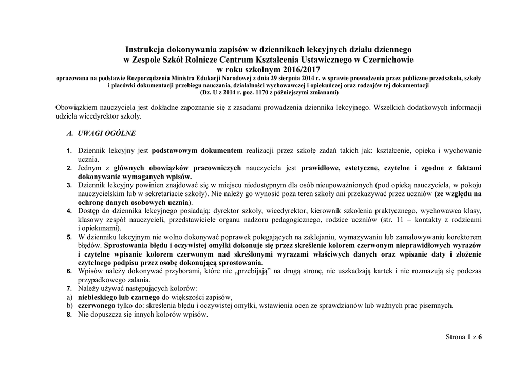 Instrukcja dokonywania zapisów w dziennikach lekcyjnych działu dziennego w Zespole Szkół Rolnicze Centrum Kształcenia Ustawicznego w Czernichowie w roku szkolnym 2016/2017 opracowana na podstawie Rozporządzenia Ministra Edukacji Narodowej z dnia 29 sierpnia 2014 r. w sprawie prowadzenia przez publiczne przedszkola, szkoły i placówki dokumentacji przebiegu nauczania, działalności wychowawczej i opiekuńczej oraz rodzajów tej dokumentacji (Dz. U z 2014 r. poz. 1170 z późniejszymi zmianami) Obowiązkiem nauczyciela jest dokładne zapoznanie się z zasadami prowadzenia dziennika lekcyjnego. Wszelkich dodatkowych informacji udziela wicedyrektor szkoły. A. UWAGI OGÓLNE 1. Dziennik lekcyjny jest podstawowym dokumentem realizacji przez szkołę zadań takich jak: kształcenie, opieka i wychowanie 2. 3. 4. 5. 6. 7. a) b) 8. ucznia. Jednym z głównych obowiązków pracowniczych nauczyciela jest prawidłowe, estetyczne, czytelne i zgodne z faktami dokonywanie wymaganych wpisów. Dziennik lekcyjny powinien znajdować się w miejscu niedostępnym dla osób nieupoważnionych (pod opieką nauczyciela, w pokoju nauczycielskim lub w sekretariacie szkoły). Nie należy go wynosić poza teren szkoły ani przekazywać przez uczniów (ze względu na ochronę danych osobowych ucznia). Dostęp do dziennika lekcyjnego posiadają: dyrektor szkoły, wicedyrektor, kierownik szkolenia praktycznego, wychowawca klasy, klasowy zespół nauczycieli, przedstawiciele organu nadzoru pedagogicznego, rodzice uczniów (str. 11 – kontakty z rodzicami i opiekunami). W dzienniku lekcyjnym nie wolno dokonywać poprawek polegających na zaklejaniu, wymazywaniu lub zamalowywaniu korektorem błędów. Sprostowania błędu i oczywistej omyłki dokonuje się przez skreślenie kolorem czerwonym nieprawidłowych wyrazów i czytelne wpisanie kolorem czerwonym nad skreślonymi wyrazami właściwych danych oraz wpisanie daty i złożenie czytelnego podpisu przez osobę dokonującą sprostowania. Wpisów należy dokonywać przyborami, które nie „przebijają” na drugą stronę, nie uszkadzają kartek i nie rozmazują się podczas przypadkowego zalania. Należy używać następujących kolorów: niebieskiego lub czarnego do większości zapisów, czerwonego tylko do: skreślenia błędu i oczywistej omyłki, wstawienia ocen ze sprawdzianów lub ważnych prac pisemnych. Nie dopuszcza się innych kolorów wpisów. Strona 1 z 6 B. UWAGI SZCZEGÓŁOWE Okładka Na zewnętrznej stronie okładki wychowawca wpisuje klasę i rok szkolny. Na wewnętrznej stronie okładki wychowawca wpisuje w porządku alfabetycznym listę uczniów, która zawiera nazwisko i imię ucznia (jeżeli uczeń ma dwa imiona muszą one zostać wpisane w arkusze ocen, a w dzienniku wpisujemy tylko jedno imię). Wewnętrzna część dziennika Treść 1. Strona Strona tytułowa Odpowiedzialny wychowawca Zasady Nazwę i adres szkoły, województwo, gmina, zawód, numer obowiązującego planu nauczania, imię i nazwisko wychowawcy należy wpisać najpóźniej 1 września. Skład samorządu klasowego i rady klasowej rodziców powinny być wpisane niezwłocznie po wyborach. Każda zmiana planu zajęć musi być niezwłocznie odnotowana z zapisem, od kiedy obowiązuje. 3. Tygodniowy rozkład zajęć edukacyjnych wychowawca 4. Obserwacje zespół kierowniczy Zapis dokonywany jest w trakcie obserwacji. 4. Wycieczki organizator 5. Ważniejsze wydarzenia z życia klasy wychowawca 6. – 7. Dane osobowe wychowawca 8. Inne informacje o uczniu wychowawca Kierownik lub opiekun wycieczki dokonuje wpisu następnego dnia po wycieczce. Wpisy powinny być dokonywane najpóźniej następnego dnia po zaistniałym wydarzeniu Wpisy muszą być dokonane najpóźniej w drugim tygodniu zajęć oraz w ciągu 2 dni od przyjęcia nowego ucznia. Należy odnotować numer ewidencyjny ucznia, datę i miejsce urodzenia, miejsce zamieszkania ucznia, imiona i nazwiska rodziców (opiekunów prawnych), numery telefonu rodziców i adresy e-mail (jeśli je posiadają). Adres zamieszkania rodziców (opiekunów prawnych) należy wpisać tylko wtedy, kiedy jest inny niż ucznia. Wpisy powinny być dokonane: - „Który rok w klasie” w pierwszym tygodniu zajęć, - „Indywidualny tok nauki” niezwłocznie po otrzymaniu informacji 9. Informacje o programach edukacyjnych wychowawca, nauczyciele z poradni. Wychowawca wpisuje nazwy przedmiotów w pierwszym tygodniu nauki. Nauczyciele dokonują wpisu do końca drugiego tygodnia zajęć. 10. Informacje o podręcznikach wychowawca, nauczyciele Wychowawca wpisuje nazwy przedmiotów w pierwszym tygodniu nauki. Nauczyciele dokonują wpisu do końca drugiego tygodnia zajęć. 11. Kontakty w rodzicami i opiekunami wychowawca 12. i dalej Wykaz uczęszczania uczniów na zajęcia nauczyciele, wychowawca Wychowawca wpisuje daty spotkań. Rodzice przy wychowawcy podpisują się w wyznaczonym miejscu. 1. Wychowawca wpisuje miesiąc (słownie). 2. Bezwzględnym obowiązkiem prowadzącego zajęcia nauczyciela jest rzetelne dokonywanie zapisów dotyczących obecności uczniów przy czym pusta kratka oznacza, że uczeń jest obecny natomiast nieobecność ucznia oznacza się poziomą kreską „-”, a spóźnienie przez „S”. Uczniom zwolnionym z zajęć (w przypadku uczestniczenia ucznia w zawodach, konkursach, itp.). wpisujemy „K”. 3. Usprawiedliwienia nieobecności dokonuje wychowawca zgodnie z zapisem w statucie szkoły. Godziny usprawiedliwione oznacza literą „U”, a nieusprawiedliwione „N”. 4. Wpisu dotyczącego liczby opuszczonych lekcji (usprawiedliwionych, nieusprawiedliwionych) oraz spóźnień dokonuje wychowawca. 13. i dalej Realizacja programu nauczania nauczyciele, wychowawca 1. 2. 3. 4. 5. 6. Wychowawca wpisuje miesiąc (słownie), datę przy dniu tygodnia i plan zajęć. W przypadku nieobecności wychowawcy wpisów tych dokona osoba wyznaczona przez dyrektora szkoły Nauczyciele nie wpisują planu zajęć, robią to wychowawcy (nauczyc
