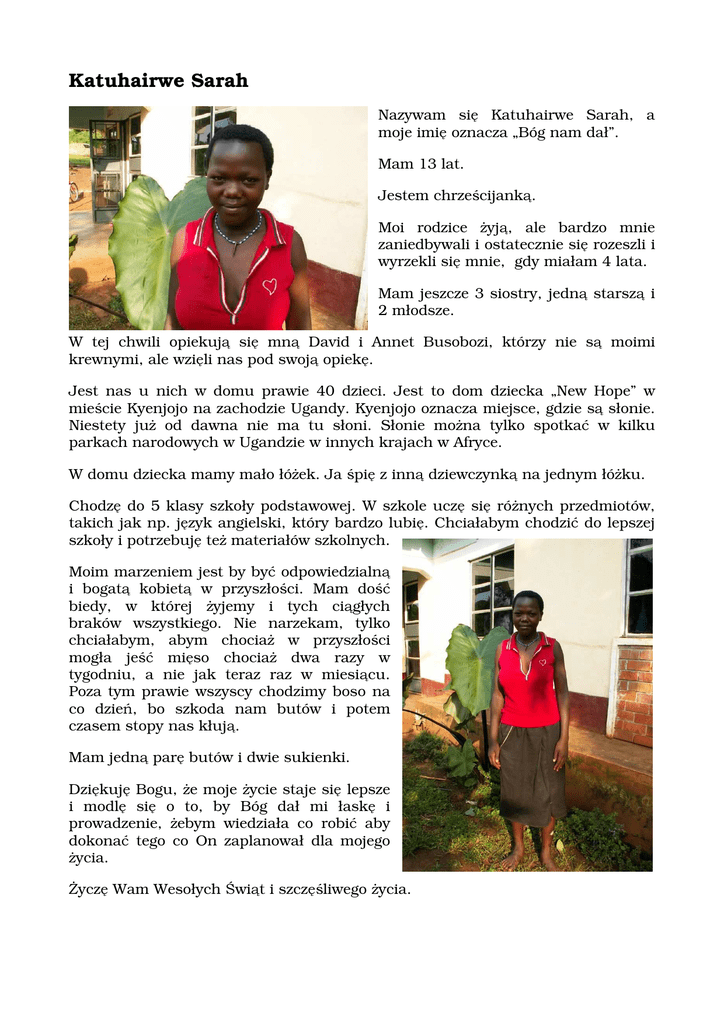 Katuhairwe Sarah Nazywam się Katuhairwe Sarah, a moje imię oznacza „Bóg nam dał”. Mam 13 lat. Jestem chrześcijanką. Moi rodzice żyją, ale bardzo mnie zaniedbywali i ostatecznie się rozeszli i wyrzekli się mnie, gdy miałam 4 lata. Mam jeszcze 3 siostry, jedną starszą i 2 młodsze. W tej chwili opiekują się mną David i Annet Busobozi, którzy nie są moimi krewnymi, ale wzięli nas pod swoją opiekę. Jest nas u nich w domu prawie 40 dzieci. Jest to dom dziecka „New Hope” w mieście Kyenjojo na zachodzie Ugandy. Kyenjojo oznacza miejsce, gdzie są słonie. Niestety już od dawna nie ma tu słoni. Słonie można tylko spotkać w kilku parkach narodowych w Ugandzie w innych krajach w Afryce. W domu dziecka mamy mało łóżek. Ja śpię z inną dziewczynką na jednym łóżku. Chodzę do 5 klasy szkoły podstawowej. W szkole uczę się różnych przedmiotów, takich jak np. język angielski, który bardzo lubię. Chciałabym chodzić do lepszej szkoły i potrzebuję też materiałów szkolnych. Moim marzeniem jest by być odpowiedzialną i bogatą kobietą w przyszłości. Mam dość biedy, w której żyjemy i tych ciągłych braków wszystkiego. Nie narzekam, tylko chciałabym, abym chociaż w przyszłości mogła jeść mięso chociaż dwa razy w tygodniu, a nie jak teraz raz w miesiącu. Poza tym prawie wszyscy chodzimy boso na co dzień, bo szkoda nam butów i potem czasem stopy nas kłują. Mam jedną parę butów i dwie sukienki. Dziękuję Bogu, że moje życie staje się lepsze i modlę się o to, by Bóg dał mi łaskę i prowadzenie, żebym wiedziała co robić aby dokonać tego co On zaplanował dla mojego życia. Życzę Wam Wesołych Świąt i szczęśliwego życia.