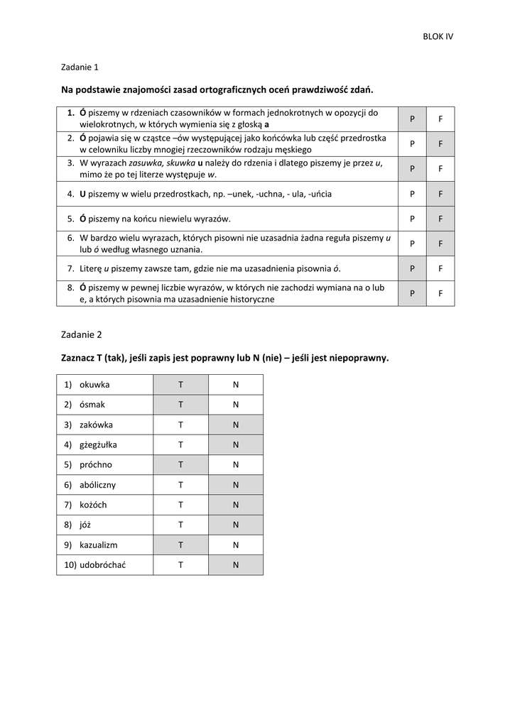BLOK IV Zadanie 1 Na podstawie znajomości zasad ortograficznych oceń prawdziwość zdań. 1. Ó piszemy w rdzeniach czasowników w formach jednokrotnych w opozycji do wielokrotnych, w których wymienia się z głoską a 2. Ó pojawia się w cząstce –ów występującej jako końcówka lub część przedrostka w celowniku liczby mnogiej rzeczowników rodzaju męskiego 3. W wyrazach zasuwka, skuwka u należy do rdzenia i dlatego piszemy je przez u, mimo że po tej literze występuje w. P F P F P F 4. U piszemy w wielu przedrostkach, np. –unek, -uchna, - ula, -uńcia P F 5. Ó piszemy na końcu niewielu wyrazów. P F 6. W bardzo wielu wyrazach, których pisowni nie uzasadnia żadna reguła piszemy u lub ó według własnego uznania. P F 7. Literę u piszemy zawsze tam, gdzie nie ma uzasadnienia pisownia ó. P F 8. Ó piszemy w pewnej liczbie wyrazów, w których nie zachodzi wymiana na o lub e, a których pisownia ma uzasadnienie historyczne P F Zadanie 2 Zaznacz T (tak), jeśli zapis jest poprawny lub N (nie) – jeśli jest niepoprawny. 1) okuwka T N 2) ósmak T N 3) zakówka T N 4) gżegżułka T N 5) próchno T N 6) abóliczny T N 7) kożóch T N 8) jóż T N 9) kazualizm T N 10) udobróchać T N BLOK IV Zadanie 1 Na podstawie znajomości zasad ortograficznych oceń prawdziwość zdań. 1. Ó piszemy w rdzeniach czasowników w formach jednokrotnych w opozycji do wielokrotnych, w których wymienia się z głoską a 2. Ó pojawia się w cząstce –ów występującej jako końcówka lub część przedrostka w celowniku liczby mnogiej rzeczowników rodzaju męskiego 3. W wyrazach zasuwka, skuwka u należy do rdzenia i dlatego piszemy je przez u, mimo że po tej literze występuje w. P F P F P F 4. U piszemy w wielu przedrostkach, np. –unek, -uchna, - ula, -uńcia P F 5. Ó piszemy na końcu niewielu wyrazów. P F 6. W bardzo wielu wyrazach, których pisowni nie uzasadnia żadna reguła piszemy u lub ó według własnego uznania. P F 7. Literę u piszemy zawsze tam, gdzie nie ma uzasadnienia pisownia ó. P F 8. Ó piszemy w pewnej liczbie wyrazów, w których nie zachodzi wymiana na o lub e, a których pisownia ma uzasadnienie historyczne P F Zadanie 2 Zaznacz T (tak), jeśli zapis jest poprawny lub N (nie) – jeśli jest niepoprawny. 1) okuwka T N 2) ósmak T N 3) zakówka T N 4) gżegżułka T N 5) próchno T N 6) abóliczny T N 7) kożóch T N 8) jóż T N 9) kazualizm T N 10) udobróchać T N BLOK IV Zadanie 3 W każdej grupie zaznacz poprawnie zapisany szereg wyrazów. 1. A) tchórz, rabuś, czółno B) tchórz, rabuś, czułno C) tchurz, rabuś, czółno 2. A) brawóra, Kórnik, fózja B) brawura, Kórnik, fuzja C) brawura, Kurnik, fuzja 3. A) włókno, żerzucha, kłótka B) włókno, rzeżucha, kłódka C) włókno, rzeżucha, kłudka 4. A) ażurowy, kułak, halucynacje B) ażurowy, kółak, halucynacje C) ażórowy, kułak, halucynacje 5. A) trucht, drużba, kubrak B) trucht, drużba, kóbrak C) trócht, dróżba, kubrak BLOK IV Zadanie 4 Z list wyrazów wykreśl te, które zawierają ó niewymienne (jest ich 26). POKÓJ STARÓWKA ZBIÓR STÓŁ SZCZEGÓŁ SURÓWKA KRÓWKA OGÓŁ MRÓZ GÓRA PRÓBA MAKÓWKA SKRÓCIĆ ÓWDZIE SOKÓŁ PÓŹNO JASKÓŁKA WRÓCIĆ OGÓREK OGRÓDEK GŁÓD ŻARÓWKA MOTORÓWKA KŁÓTNIA MÓZG WIÓRY BAWÓŁ WŁÓKNO SÓJKA COKÓŁ TWÓJ WŁÓCZNIA KRÓLOWA SZÓSTKA ÓSEMKA CHÓR PIÓRO WÓJT ŁAMIGŁÓWKA SPÓŁDZIELNIA NIÓSŁ POMÓC RÓWNY GŁÓWEK KŁÓDKA WYSZCZEGÓLNIĆ WÓZ PRZYWÓDCA WIEWIÓRKA CÓRKA TCHÓRZ FASOLÓWKA LÓD DRÓB DOPÓKI MALINÓWKA OZÓR DOPÓTY ÓWCZESNY PAPIERÓWKA PLÓTŁ UPIÓR ŁUCZAKÓWNA KRAKÓW WŁÓCZKA ROSÓŁ BORÓWKI WSCHÓD PÓŁKA ŻÓŁW TWARÓG WĘDRÓWKA BLOK IV Zadanie 5 Uzupełnijcie tytuły książek literazmi ó lub u. Aby poznać autora każdej książki stojącej na półce, dopasuj reguły dotyczące pisowni wyrazów w tytułach i ponumeruj książki. BLOK IV Zadanie 6 Wykorzystując znane Wam zasady regulujące pisownię u i ó, pogrupujcie według nich wyrazy z ramki. Dopiszcie do litery symbolizującej worek zasadę, którą się kierowaliście. pokój, ziółka, Kraków, rysuję, ówczesny, buduję, budulec, wiózł, skromniutki, piórko, chłopców, ósmy, obserwuje, matula, klasówka, ówdzie Worek A - __________________________________________ Worek B - __________________________________________ Worek C - __________________________________________ Worek D - __________________________________________ Worek E - __________________________________________