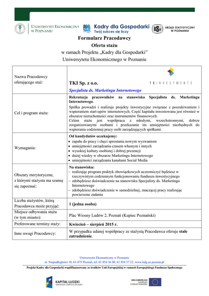 Formularz Pracodawcy Oferta stażu w ramach Projektu „Kadry dla Gospodarki” Uniwersytetu Ekonomicznego w Poznaniu Nazwa Pracodawcy oferującego staż: TKI Sp. z o.o. Specjalista ds. Marketingu Internetowego Cel i program stażu: Rekrutacja pracowników na stanowisko Specjalista ds. Marketingu Internetowego. Spółka prowadzi i realizuje projekty inwestycyjne związane z poszukiwaniem i wspieraniem start-upów internetowych. Część kapitału inwestowana jest również w obszarze nieruchomości oraz instrumentów finansowych. Celem stażu jest współpraca z młodymi, wszechstronnymi, dobrze zorganizowanymi osobami i przekazanie im umiejętności niezbędnych do wspierania codziennej pracy osób zarządzających spółkami. Wymagania: Od kandydatów oczekujemy: zapału do pracy i chęci sprostania nowym wyzwaniom umiejętności zarządzania czasem własnym i innych wysokiej kultury osobistej i dobrej prezencji dużej wiedzy w obszarze Marketingu Internetowego umiejętności zarządzania kanałami Social Media Obszary merytoryczne, z którymi stażysta ma szansę się zapoznać: Na stanowisku: realizując program praktyk obowiązkowych uczestniczyć będziesz w rzeczywistym codziennym funkcjonowaniu funduszu inwestycyjnego zdobędziesz doświadczenie na stanowisku Specjalisty ds. Marketingu Internetowego zdobędziesz doświadczenie w samodzielnej, znaczącej pracy realizując powierzone zadania Liczba stażystów, którą Pracodawca może przyjąć: Miejsce odbywania stażu (w tym miasto): 1 (jedna osoba) Plac Wiosny Ludów 2, Poznań (Kupiec Poznański) Preferowane terminy staży: Kwiecień – sierpień 2015 r. Inne uwagi Pracodawcy: W przypadku udanej współpracy ze stażystą Pracodawca oferuje stałe zatrudnienie. Uniwersytet Ekonomiczny w Poznaniu al. Niepodległości 10, 61-875 Poznań, tel. 61 854 36 80, 61 854 37 22, www.kdg.ue.poznan.pl Projekt Kadry dla Gospodarki współfinansowany ze środków Unii Europejskiej w ramach Europejskiego Funduszu Społecznego