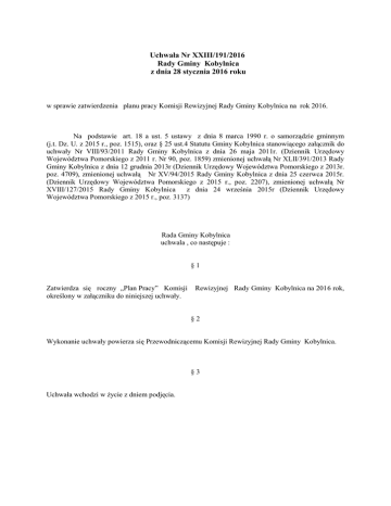 Uchwała Nr XXIII/191/2016 Rady Gminy Kobylnica z dnia 28 stycznia 2016 roku w sprawie zatwierdzenia planu pracy Komisji Rewizyjnej Rady Gminy Kobylnica na rok 2016. Na podstawie art. 18 a ust. 5 ustawy z dnia 8 marca 1990 r. o samorządzie gminnym (j.t. Dz. U. z 2015 r., poz. 1515), oraz § 25 ust.4 Statutu Gminy Kobylnica stanowiącego załącznik do uchwały Nr VIII/93/2011 Rady Gminy Kobylnica z dnia 26 maja 2011r. (Dziennik Urzędowy Województwa Pomorskiego z 2011 r. Nr 90, poz. 1859) zmienionej uchwałą Nr XLII/391/2013 Rady Gminy Kobylnica z dnia 12 grudnia 2013r (Dziennik Urzędowy Województwa Pomorskiego z 2013r. poz. 4709), zmienionej uchwałą Nr XV/94/2015 Rady Gminy Kobylnica z dnia 25 czerwca 2015r. (Dziennik Urzędowy Województwa Pomorskiego z 2015 r., poz. 2207), zmienionej uchwałą Nr XVIII/127/2015 Rady Gminy Kobylnica z dnia 24 września 2015r (Dziennik Urzędowy Województwa Pomorskiego z 2015 r., poz. 3137) Rada Gminy Kobylnica uchwala , co następuje : §1 Zatwierdza się roczny „Plan Pracy” Komisji określony w załączniku do niniejszej uchwały. Rewizyjnej Rady Gminy Kobylnica na 2016 rok, §2 Wykonanie uchwały powierza się Przewodniczącemu Komisji Rewizyjnej Rady Gminy Kobylnica. §3 Uchwała wchodzi w życie z dniem podjęcia. Plan pracy Komisji Rewizyjnej Rady Gminy Kobylnica na rok 2016 L.p. Miejsce Sposób realizacji Temat -zagadnienie Termin 1. GZEAGS w Kobylnicy Kontrola problemowa Zasady dowozu dzieci do szkół- poniesione wydatki na transport szkolny za 2015r. Luty 2016r. 2. Urząd Gminy Kobylnica Kontrola problemowa Analiza wydatków poniesionych w 2015r. w ramach funduszu sołeckiego w sołectwach Bolesławice i Reblino. Marzec 2016r. 3. Urząd Gminy Kobylnica Kontrola problemowa Wykorzystanie dofinansowania celowego udzielonego z budżetu gminy w roku 2015 dla organizacji pozarządowych działających na terenie gminy. Kwiecień 2016r. 4. Urząd Gminy Kobylnica Kontrola problemowa, opracowanie pisemne Ocena realizacji budżetu gminy za rok 2015, opracowanie wniosku w sprawie absolutorium dla Wójta Gminy. Maj 2016r. 5. Urząd Gminy Kobylnica Kontrola problemowa Kontrola wydatków poniesionych na zimowe utrzymanie dróg (2015-2016). Czerwiec 2016r. 6. Urząd Gminy Kobylnica Kontrola problemowa Ocena realizacji budżetu oraz zakończonych i rozliczonych inwestycji za I półrocze ze szczególnym uwzględnieniem budowy dróg na osiedlu Kwiatowym w Kobylnicy. Wrzesień 2016r. 7. Szkoła Podstawowa Kontrola w Słonowicach problemowa Kontrola dot. prowadzonych pozalekcyjnych – poniesione wydatki. 8. Urząd Gminy Kobylnica Opracowanie pisemne Prace nad projektem budżetu gminy Kobylnica na 2017r. Listopad 2016r. 9. Urząd Gminy Kobylnica Opracowanie pisemne Sporządzenie rocznego sprawozdania z pracy komisji. Grudzień 2016r. zajęć Październik 2016r. Poza planem Komisja będzie realizowała inne kontrole zlecone przez Radę Gminy.