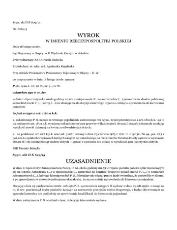 Sygn. akt II K 629/15 Ds. 866/15 WYROK W IMIENIU RZECZYPOSPOLITEJ POLSKIEJ Dnia 18 lutego 2016r. Sąd Rejonowy w Słupcy, w II Wydziale Karnym w składzie: Przewodniczący: SSR Urszula Bożęcka Protokolant: st. sekr. sąd. Agnieszka Karpińska Przy udziale Prokuratora Prokuratury Rejonowej w Słupcy – E. W. po rozpoznaniu w dniu 18 lutego 2016r. sprawy P. S., syna J. i F. zd. P., ur. (...) w W. oskarżon ego o to, że: w dniu 11 lipca 2015 roku około godziny 00.02 w miejscowości L. na autostradzie (...) prowadził na drodze publicznej samochód marki F. (...) nr rej. (...) nie stosując się do decyzji właściwego organu o cofnięciu uprawnienia do kierowania pojazdem to jest o czyn z art. 1 80 a k.k. 1. oskarżonego P. S. uznaje za winnego popełnienia zarzucanego mu czynu, to jest przestępstwa z art. 180a k.k. i za to na podstawie art. 180a k.k. wymierza oskarżonemu karę grzywny w liczbie 200 ( dwustu ) stawek dziennych ustalając wysokość stawki dziennej na kwotę 20 (dwudziestu) złotych; 2. na podstawie art. 627 k.p.k. oraz art. 3 ust.1 ustawy z dnia 23 czerwca 1973 r. (Dz. U. z 1983r., Nr 49, poz. 223 z póź.zm.) o opłatach w sprawach karnych zasądza od oskarżonego na rzecz Skarbu Państwa koszty sądowe w wysokości 187,01 zł ( sto osiemdziesiąt siedem złotych i 1 grosz) i wymierza mu opłatę w wysokości 400 (czterystu) złotych . SSR Urszula Bożęcka Sygn. akt II K 629/15 UZASADNIENIE W dniu 11 lipca 2015r. funkcjonariusz Policji D. M. około godziny 00.55 w rejonie punktu poboru opłat mieszczącym się na terenie Autostrady (...) w miejscowości L. zatrzymał do kontroli drogowej pojazd marki F. (...) o numerach rejestracyjnych (...), którego kierującym był P. S.. Kierujący nie okazał prawa jazdy twierdząc, że zostawił je w domu , a po sprawdzeniu w systemie policyjnym okazało się , że ma on cofnie uprawnienia do kierowania pojazdem. Decyzją z dnia 25 października 2006r. cofnięto P. S. uprawnienia kategorii B wydane w dniu 29.08.1996r. z uwagi na to, iż ww. przekroczył liczbę punktów karnych za naruszenie przepisów ruchu drogowego, a będąc skierowanym na egzamin kontrolny nie poddał się on sprawdzeniu kwalifikacji do kierowania pojazdami. W dniu zatrzymania P. S. wiedział o tym, iż decyzja taka została wydana. P. S., jest żonaty, na utrzymaniu posiada żonę i dwoje dzieci, ma wykształcenie średnie, z zawodu jest elektronikiem samochodowym , prowadzi własną działalność gospodarczą, uzyskuje miesięczne dochody w wysokości około 3.000 zł, jest właścicielem działki budowlanej w miejscowości D. i trzech samochodów, był on wcześniej karany. Powyższy stan faktyczny Sąd ustalił w oparciu o następujące dowody: wyjaśnienia oskarżonego ( k. 47), zeznania świadka D. M. ( k. 47, 16-17) oraz dokumentów i protokołów dołączonych do akt niniejszej sprawy, które Sąd zaliczając w poczet dowodów uznał za ujawnione w całości bez ich odczytywania w postaci: decyzji ( k. 4), informacji z K. ( k. 12-13), informacji US ( k. 14), informacji ( k. 37) . Oskarżony P. S. wprawdzie nie przyznał się do popełnienia zarzucanego mu czynu, jednak składając wyjaśnienia potwierdził, iż w dniu 11 lipca 2015r. został zatrzymany do kontroli, prowadził wtedy samochód, wiedział, iż ma cofnięte uprawnienia do prowadzenia pojazdów, jednak podał, iż miał prawo jazdy angielskie, jednak policjantowi go nie okazał, bo w Anglii jeździ się bez dokumentów. Sąd dał wiarę wyjaśnieniom oskarżonego, które w świetle materiału dowodowego okazały się logiczne i znajdują potwierdzenie w zeznaniach świadka D. M.. Sąd również uznał za wiarygodne zeznania świadka D. M., bowiem korespondują one nie tylko z wyjaśnieniami oskarżonego, ale również i z pozostałym materiałem dowodowym zebranym w przedmiotowej sprawie. Sąd uznał za wiarygodne dokumenty dołączone do akt niniejszej sprawy, albowiem ich moc dowodowa nie budziła wątpliwości Sądu, a także nie były one kwestionowane przez żadną ze stron. Mając powyższe na uwadze Sąd uznał oskarżonego P. S. za winnego popełnienia zarzucanego mu czynu, tj. przestępstwa z art. 180 a k.k. Zgodnie z art. 180 a k.k. odpowiedzialność karną na zasadach wskazanych w powołanym przepisie ponosi osoba, która na drodze publicznej, w strefie zamieszkania lub w strefie ruchu, prowadzi pojazd mechaniczny, nie stosując się do decyzji właściwego organu o cofnięciu uprawnienia do kierowania pojazdami. Jest to przestępstwo powszechne, które może popełnić każda zdolna do ponoszenia odpowiedzialności karnej osoba fizyczna, w tym również oskarżony. Do znamion strony przedmiotowej należy prowadzenie pojazdu mechanicznego miedzy innymi na drodze publicznej. Nie budzi wątpliwości, iż samochód marki F. (...) należy do pojazdów mechanicznych, a autostrada stanowi drogę publiczną. Oskarżony nie zastosował się do decyzji z dnia 25 października 2006r., którą cofnięto mu uprawnienia do prowadzenia pojazdów kategorii B, a w dniu popełnienia czynu wiedział o tym, iż decyzja taka została wydana. Dokonując wymiaru kary Sąd kierował się dyrektywami wymiaru kary wskazanymi w art. 53 k.k., tj. dyrektywą prewencji ogólnej oraz dyrektywą prewencji szczególnej, uwzględnił także stopień winy i stopień społecznej szkodliwości czynu przypisanego oskarżonemu. Przestępstwo z art. 180 a k.k. zagrożone jest karą grzywny, ograniczenia wolności i pozbawienia wolności do lat dwóch. Sankcja karna wskazana w powołanym przepisie wskazuje na gradacje kar grożących za popełnione przestępstwo. O wyborze konkretnej kary decyduje całokształt okoliczności stwierdzonych w toku postępowania. Kara pozbawienia wolności stanowi swoistego rodzaju ostateczność orzekaną dopiero wówczas, gdy inna kara lub środek karny nie spełni celów kary. W niniejszej sprawie Sąd uznał, biorąc pod uwagę przede wszystkim to, iż oskarżony po raz pierws