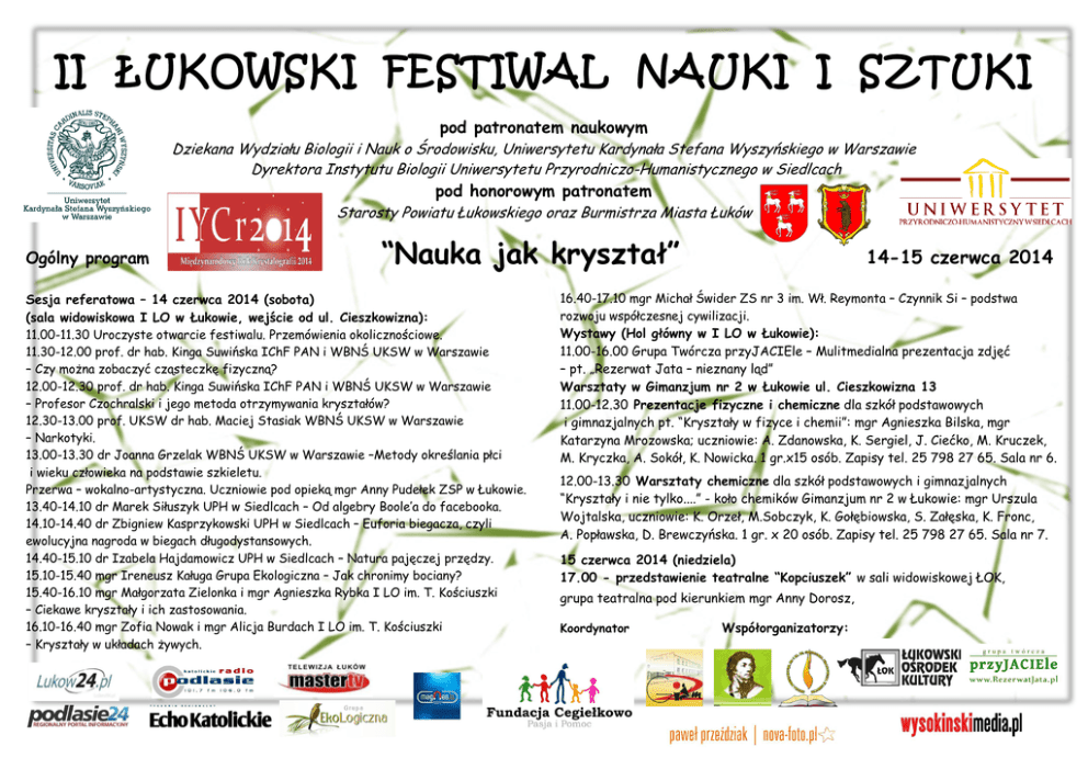 II ŁUKOWSKI FESTIWAL NAUKI I SZTUKI pod patronatem naukowym Dziekana Wydziału Biologii i Nauk o Środowisku, Uniwersytetu Kardynała Stefana Wyszyńskiego w Warszawie Dyrektora Instytutu Biologii Uniwersytetu Przyrodniczo-Humanistycznego w Siedlcach pod honorowym patronatem Starosty Powiatu Łukowskiego oraz Burmistrza Miasta Łuków Ogólny program “Nauka jak kryształ” Sesja referatowa – 14 czerwca 2014 (sobota) (sala widowiskowa I LO w Łukowie, wejście od ul. Cieszkowizna): 11.00-11.30 Uroczyste otwarcie festiwalu. Przemówienia okolicznościowe. 11.30-12.00 prof. dr hab. Kinga Suwińska IChF PAN i WBNŚ UKSW w Warszawie – Czy można zobaczyć cząsteczkę fizyczną? 12.00-12.30 prof. dr hab. Kinga Suwińska IChF PAN i WBNŚ UKSW w Warszawie – Profesor Czochralski i jego metoda otrzymywania kryształów? 12.30-13.00 prof. UKSW dr hab. Maciej Stasiak WBNŚ UKSW w Warszawie – Narkotyki. 13.00-13.30 dr Joanna Grzelak WBNŚ UKSW w Warszawie –Metody określania płci i wieku człowieka na podstawie szkieletu. Przerwa – wokalno-artystyczna. Uczniowie pod opieką mgr Anny Pudełek ZSP w Łukowie. 13.40-14.10 dr Marek Siłuszyk UPH w Siedlcach – Od algebry Boole’a do facebooka. 14.10-14.40 dr Zbigniew Kasprzykowski UPH w Siedlcach – Euforia biegacza, czyli ewolucyjna nagroda w biegach długodystansowych. 14.40-15.10 dr Izabela Hajdamowicz UPH w Siedlcach – Natura pajęczej przędzy. 15.10-15.40 mgr Ireneusz Kaługa Grupa Ekologiczna – Jak chronimy bociany? 15.40-16.10 mgr Małgorzata Zielonka i mgr Agnieszka Rybka I LO im. T. Kościuszki – Ciekawe kryształy i ich zastosowania. 16.10-16.40 mgr Zofia Nowak i mgr Alicja Burdach I LO im. T. Kościuszki – Kryształy w układach żywych. 14-15 czerwca 2014 16.40-17.10 mgr Michał Świder ZS nr 3 im. Wł. Reymonta – Czynnik Si – podstwa rozwoju współczesnej cywilizacji. Wystawy (Hol główny w I LO w Łukowie): 11.00-16.00 Grupa Twórcza przyJACIEle – Mulitmedialna prezentacja zdjęć – pt. „Rezerwat Jata – nieznany ląd” Warsztaty w Gimanzjum nr 2 w Łukowie ul. Cieszkowizna 13 11.00-12.30 Prezentacje fizyczne i chemiczne dla szkół podstawowych i gimnazjalnych pt. “Kryształy w fizyce i chemii”: mgr Agnieszka Bilska, mgr Katarzyna Mrozowska; uczniowie: A. Zdanowska, K. Sergiel, J. Ciećko, M. Kruczek, M. Kryczka, A. Sokół, K. Nowicka. 1 gr.x15 osób. Zapisy tel. 25 798 27 65. Sala nr 6. 12.00-13.30 Warsztaty chemiczne dla szkół podstawowych i gimnazjalnych “Kryształy i nie tylko....” - koło chemików Gimanzjum nr 2 w Łukowie: mgr Urszula Wojtalska, uczniowie: K. Orzeł, M.Sobczyk, K. Gołębiowska, S. Załęska, K. Fronc, A. Popławska, D. Brewczyńska. 1 gr. x 20 osób. Zapisy tel. 25 798 27 65. Sala nr 7. 15 czerwca 2014 (niedziela) 17.00 - przedstawienie teatralne “Kopciuszek” w sali widowiskowej ŁOK, grupa teatralna pod kierunkiem mgr Anny Dorosz, Koordynator Współorganizatorzy: