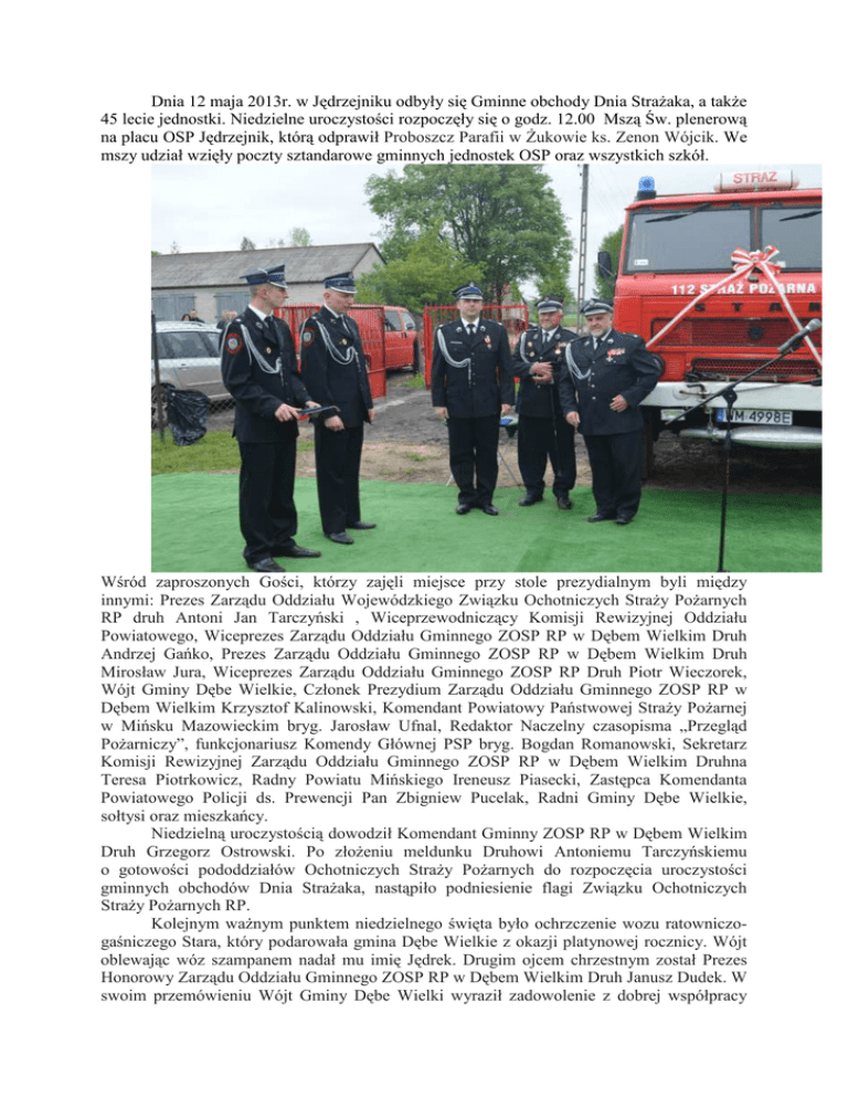 Dnia 12 maja 2013r. w Jędrzejniku odbyły się Gminne obchody Dnia StraŜaka, a takŜe 45 lecie jednostki. Niedzielne uroczystości rozpoczęły się o godz. 12.00 Mszą Św. plenerową na placu OSP Jędrzejnik, którą odprawił Proboszcz Parafii w śukowie ks. Zenon Wójcik. We mszy udział wzięły poczty sztandarowe gminnych jednostek OSP oraz wszystkich szkół. Wśród zaproszonych Gości, którzy zajęli miejsce przy stole prezydialnym byli między innymi: Prezes Zarządu Oddziału Wojewódzkiego Związku Ochotniczych StraŜy PoŜarnych RP druh Antoni Jan Tarczyński , Wiceprzewodniczący Komisji Rewizyjnej Oddziału Powiatowego, Wiceprezes Zarządu Oddziału Gminnego ZOSP RP w Dębem Wielkim Druh Andrzej Gańko, Prezes Zarządu Oddziału Gminnego ZOSP RP w Dębem Wielkim Druh Mirosław Jura, Wiceprezes Zarządu Oddziału Gminnego ZOSP RP Druh Piotr Wieczorek, Wójt Gminy Dębe Wielkie, Członek Prezydium Zarządu Oddziału Gminnego ZOSP RP w Dębem Wielkim Krzysztof Kalinowski, Komendant Powiatowy Państwowej StraŜy PoŜarnej w Mińsku Mazowieckim bryg. Jarosław Ufnal, Redaktor Naczelny czasopisma „Przegląd PoŜarniczy”, funkcjonariusz Komendy Głównej PSP bryg. Bogdan Romanowski, Sekretarz Komisji Rewizyjnej Zarządu Oddziału Gminnego ZOSP RP w Dębem Wielkim Druhna Teresa Piotrkowicz, Radny Powiatu Mińskiego Ireneusz Piasecki, Zastępca Komendanta Powiatowego Policji ds. Prewencji Pan Zbigniew Pucelak, Radni Gminy Dębe Wielkie, sołtysi oraz mieszkańcy. Niedzielną uroczystością dowodził Komendant Gminny ZOSP RP w Dębem Wielkim Druh Grzegorz Ostrowski. Po złoŜeniu meldunku Druhowi Antoniemu Tarczyńskiemu o gotowości pododdziałów Ochotniczych StraŜy PoŜarnych do rozpoczęcia uroczystości gminnych obchodów Dnia StraŜaka, nastąpiło podniesienie flagi Związku Ochotniczych StraŜy PoŜarnych RP. Kolejnym waŜnym punktem niedzielnego święta było ochrzczenie wozu ratowniczogaśniczego Stara, który podarowała gmina Dębe Wielkie z okazji platynowej rocznicy. Wójt oblewając wóz szampanem nadał mu imię Jędrek. Drugim ojcem chrzestnym został Prezes Honorowy Zarządu Oddziału Gminnego ZOSP RP w Dębem Wielkim Druh Janusz Dudek. W swoim przemówieniu Wójt Gminy Dębe Wielki wyraził zadowolenie z dobrej współpracy straŜaków Jędrzejnika ze szkołami, w których starają się zaszczepić ducha pracy na rzecz społeczności lokalnej. Wójt Gminy Dębe Wielkie za wsparcie Ochotniczej StraŜy PoŜarnej, pomoc finansową i zaangaŜowanie otrzymał od Druhów dyplom. Druhowie odwdzięczyli się takŜe dyplomem Adamowi Gierszewskiemu, Adamowi Góras, Damianowi Chlebowskiemu i druhowi Grzegorzowi Pyzie. W dalszej części uroczystości zostały wręczone odznaczenia dla zasłuŜonych dla poŜarnictwa. W pierwszej kolejności medal honorowy za szczególne zasługi z rąk druha Antoniego Jana Tarczyńskiego odebrał Prezes Zarządu Oddziału Gminnego ZOSP RP w Dębem Wielkim druh Mirosław Jura oraz Komendant Gminny Druh Grzegorz Ostrowski. Za wysługę 20 lat odznaczono Mirosława Kamińskiego, za 15 lecie w straŜy medal otrzymał Grzegorz Pyza. Za 5 letni staŜ straŜacki uhonorowano takŜe: Adama Wilamowskiego, Jarosława Grzegolca, Macieja Krześniaka, Mariusza Cacko i Sebastiana Chlebowicza. Na zakończenie apelu został odegrany hymn „Związku Ochotniczych StraŜy PoŜarnych RP”, po czym nastąpiła defilada pod dowództwem Druha Grzegorza Ostrowskiego. Na zakończenie straŜacy przygotowali biesiadę przy grochówce serwowanej przez najlepszego gminnego kucharza druha Tadeusza Wójcika.