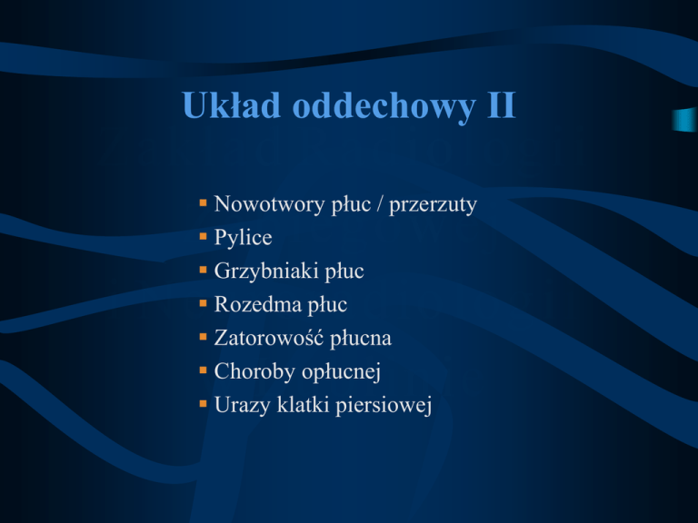 Układ oddechowy II Nowotwory płuc / przerzuty Pylice Grzybniaki płuc Rozedma płuc Zatorowość płucna Choroby opłucnej Urazy klatki piersiowej Rak płuca nowotwór z komórek błony śluzowej oskrzeli • Histologicznie: rak płaskonabłonkowy, rak drobnokomórkowy, gruczolakorak • Klinicznie: niecharakterystyczny obraz (kaszel, krwioplucie, utrata masy ciała, gorączka, ból, nawracające zapalenie płuc) • Radiologicznie: - objawy bezpośrednie (cień guza) - objawy pośrednie (niedodma, wysięk opłucnowy, zapalenie płatowe płuc) Rak płuca - postać wnękowa 90% przypadków raka płuc z oskrzela głównego, płatowego lub segmentalnego Objawy radiologiczne: • Cień guza we wnęce • Rozedma wentylowa (prześwietlenie – w wydechu ruch śródpiersia na stronę zdrową) • Zapalenie płuc (zwężenie oskrzela i zaleganie wydzieliny) • Odczyn płynowy w jamie opłucnej • Niedodma (całkowite zamknięcie oskrzela, sąsiednie płaty - zastępcza rozedma) Rak płuca niedodma płata górnego P płuca Rak płuca niedrożne oskrzele pośrednie Rak płuca 6-miesięczna progresja zmian Rak płuca - wnękowy niedodma lewego płuca Pojedynczy guzek płuca radiografia cyfrowa RTG klasyczne Cyfrowa technika warstwowa Rak płuca - wnękowy, nie operacyjny - zespół żyły głównej górnej - porażenie kopuły przepony Rak płuc - postać obwodowa 10% przypadków raka płuc z małego oskrzela obwodowego Objawy radiologiczne: • Cień okrągły, owalny, rzadziej nieregularny • Trudna diagnostyka różnicowa rtg (biopsja przez ścianę klp lub odcinkowa resekcja płuca) • Guz Pancoasta – rak szczytu płuca (zacienienie w szczycie płuca, niszczenie przyległych odcinków żeber, zanik mięśni ramienia, naciek splotu barkowego – zespół Hornera) Rak płuc - postać obwodowa Rak płuc postać obwodowa Rak płuc postać obwodowa Rak płuca Bronchoskopia – ocena histopatologiczna TK – staging, ocena rozległości i operacyjności Kryteria nieoperacyjności guzów płuc: • Naciek < 2 cm od ostrogi tchawicy • Powiększenie węzłów chłonnych (wnęk / śródpiersia) • Naciek śródpiersia: tętnicy płucnej, VCS, objawy porażenia przepony (naciek nerwu przeponowego) • Naciek ściany klatki piersiowej • Przerzuty odległe (kości) Przerzuty nowotworowe do płuc • Drogą krwionośną lub chłonną • Rak nerki, sutka, kości, tarczycy • Badania obrazowe: rtg klp, TK (małe zmiany, za sercem, kopułami przepony, podopłucnowo) Objawy radiologiczne: • liczne cienie okrągłe w obu płucach, głównie środkowe i dolne płaty, ostre obrysy, różna wielkość • Rzadziej 1 okrągły cień obwodowo • Lymphangitis carcinomatosa: rozsiew chłonny (rak sutka, żołądka) Przerzuty nowotworowe do płuc Osteosarcoma Przerzuty nowotworowe do płuc Carcinosis miliaris – rak nerki Przerzuty do płuc HRCT Przerzuty nowotworowe do płuc Lymphangiosis carcinomatosa Rak płuca - przerzuty Drogą chłonną i krwionośną • • Bliskie: Węzły chłonne wnęk – policykliczne cienie Węzły chłonne przytchawicze – poszerzenie • Odległe: Najczęściej do mózgu, kości i nadnerczy cienia śródpiersia, zespół żyły głównej górnej, porażenie nerwu przeponowego PET/CT – guz wnęki Adenocarcinoma lewego oskrzela, przerzuty do węzłów chłonnych i kręgosłupa Pylice płuc • Długotrwałe wdychanie pyłów organicznych lub nieorganicznych (krzem, węgiel, azbest, talk) • Najczęstsza jest pylica krzemowa • Odkładanie pyłu w zrębie płuc i węzłach chłonnych produkcja kolagenu → guzki krzemicze + zwłóknienie śródmiąższowe • Klinicznie: przewlekły nieżyt oskrzeli, duszność, niewydolność PK (objawy z opóźnieniem) • Rozpoznanie: wywiad + obraz radiologiczny Pylice Rtg – dynamika zmian: • Wzmożenie rysunku okołooskrzelowego, obraz siateczki (zajęcie naczyń chłonnych) • Drobne guzki (2-3mm) symetrycznie w polach środkowych i dolnych obu płuc (niewidoczne pod skopią) • Powiększenie węzłów chłonnych, zwapnienia (objaw „skorupki jajka”) • Guzy pylicze – mocno wysycone, zbite cienie (możliwy wewnętrzny rozpad - obraz jamy) • Wtórnie: rozedma, rozstrzenia oskrzeli, zrosty opłucnej, objawy niewydolności PK – serce płucne Pylica krzemowa silicosis drobnoguzkowa guzkowa guzy pylicze Różnicowanie: sarkoidoza, prosówka, ca miliaris Azbestoza Grzybniak kropidlakowy aspergilloma - w wygojonej jamie gruźliczej - w rozstrzeniach oskrzeli Rozwój grzybni - w przebytym ropniu - w jamie nowotworowej Klinicznie: • krwioplucie o różnym nasileniu (proteolityczne działanie grzybni) Radiologicznie: • owalne lub okrągłe zacienienie z rąbkiem powietrza między ścianą jamy a grzybnią • 1-12cm średnicy • zwykle I-II segment płata górnego lub segment szczytowy dolnego płata • grzybniak jest ruchomy w jamie Aspergilloma Aspergilloma Krwioplucie - aspergilloma po resekcji górnego płata L płuca Rozedma płuc - rozdęcie pęcherzyków płucnych, - zanik przegród - redukcja łożyska naczyniowego • Rozedma w mechanizmie zaporowym: w przewlekłym nieżycie oskrzeli, astmie, śródmiąższowym zapaleniu płuc; obustronna • Rozedma zastępcza: resekcja, marskość, niedodma; może dotyczyć 1 płuca lub płata • Rozedma pęcherzowa: duże, cienkościenne pęcherze położone podopłucnowo → odma • Diagnostyka obrazowa: rtg klp, HRCT Rozedma płuc Objawy radiologiczne: • Wdechowe ustawienie klatki piersiowej • • • • • • • Poziomy przebieg żeber Szerokie międzyżebrza Przepona nisko ustawiona, płaskie kopuły Szerokie kąty przeponowo-żebrowe Nadmierna przejrzystość pól płucnych Redukcja rysunku naczyniowego Szerokie gałęzie tętnicy płucnej (tzw. amputacja wnęk) • Szeroka przestrzeń zamostkowa (zdj. boczne) Rozedma płuc - HRCT mnogie pęcherze rozedmowe Zatorowość płucna stan bezpośredniego zagrożenia życia !!! Dane epidemiologiczne: - rozpoznani