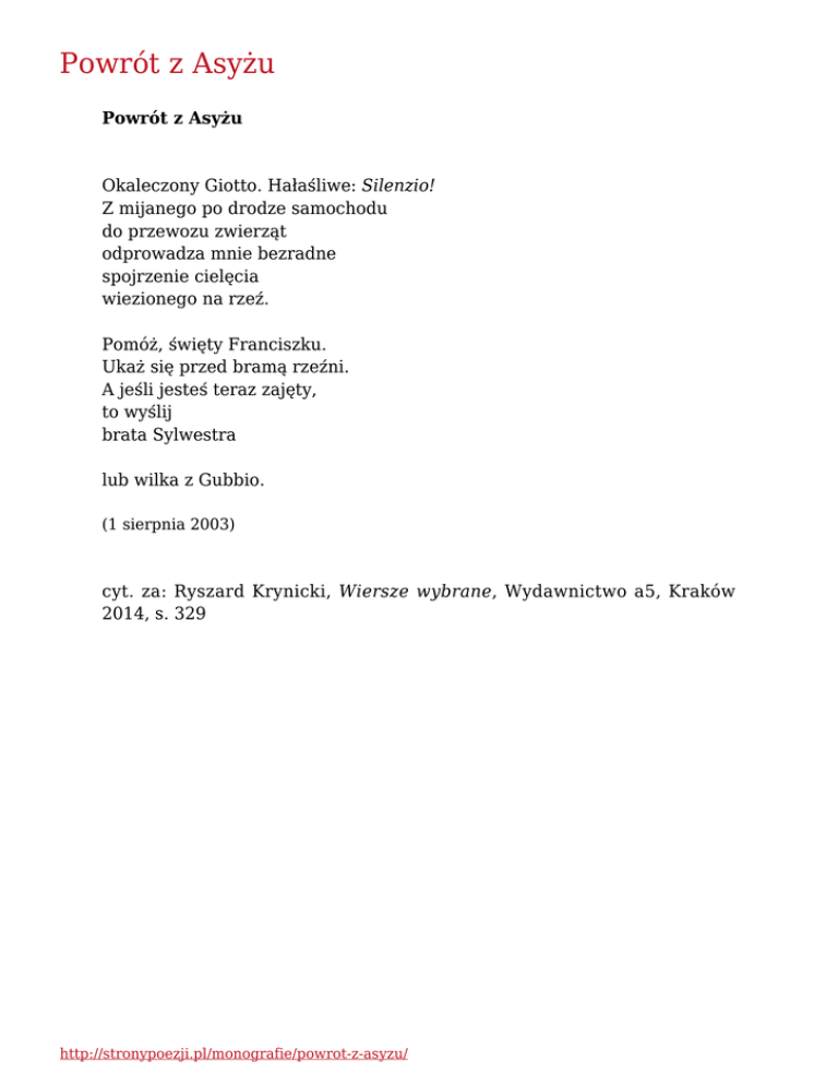 Powrót z Asyżu Powrót z Asyżu Okaleczony Giotto. Hałaśliwe: Silenzio! Z mijanego po drodze samochodu do przewozu zwierząt odprowadza mnie bezradne spojrzenie cielęcia wiezionego na rzeź. Pomóż, święty Franciszku. Ukaż się przed bramą rzeźni. A jeśli jesteś teraz zajęty, to wyślij brata Sylwestra lub wilka z Gubbio. (1 sierpnia 2003) cyt. za: Ryszard Krynicki, Wiersze wybrane, Wydawnictwo a5, Kraków 2014, s. 329 http://stronypoezji.pl/monografie/powrot-z-asyzu/