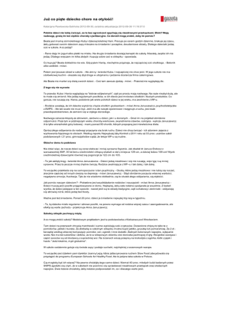 Już co piąte dziecko chore na otyłość! Katarzyna Pawłowska-Salińska 2012-09-30, ostatnia aktualizacja 2012-09-30 11:19:37.0 Polskie dzieci nie lubią ćwiczyć, za to bez ograniczeń opychają się niezdrowymi przekąskami. Efekt? Mają nadwagę, grożą im też ciężkie choroby cywilizacyjne. Co dorośli mogą zrobić, żeby im pomóc? Beata jest mamą oś mioletniego Kuby i dziesięcioletniej Hani. Pracuje po osiem godzin dziennie, brakuje jej czasu, żeby gotować swoim dzieciom zupy mleczne na śniadanie i porządne, dwudaniowe obiady. Dlatego dzieciaki jedzą coś w szkole. A co jedzą? - Rano daję im jogurt albo płatki na mleku. Na drugie śniadanie dostają kanapki do szkoły. Niestety, zwykle ich nie jedzą. Dlatego wręczam im kilka złotych i kupują sobie coś w s klepiku - opowiada. Co kupują? Beata dokładnie nie wie. Gdy pytam Hanię, niechętnie przyznaje, że najczęściej coś słodkiego. - Batonik albo wafelek - mówi. Potem jes t jeszcze obiad w szkole. - Ale zimny - twierdzi Kuba. I najczęściej nie chce jeść. W jego s zkole nie ma s tołówkowej kuchni - okazała się zbyt droga w utrzymaniu i jedzenie dostarcza firma cateringowa. Ale Beata nie martwi się dietą swoich dzieci. - Coś tam zawsze zjedzą - mówi. - Przecież nie wyglądają źle. Z tego się nie wyrasta To prawda: Kuba i Hania wyglądają na "dobrze odżywionych", czyli po prostu mają nadwagę. Na razie niezbyt dużą, ale to może się zmienić. Nie jedzą regularnych posiłków, w ich diecie jest mnóstwo słodkich i tłustych produktów. Co gors za, nie rus zają się. Hania, podobnie jak wiele polskich dzieci w jej wieku, ma zwolnienie z WF-u. - Rodzice uważają, że ich dziecko wyrośnie z bycia słodkim grubaskiem - mówi Anna Januszewicz, psychodietetyczka z SWPS. - Ale tak wcale nie musi być. Jeśli ma złe nawyki żywieniowe i rezygnuje z ruchu, jest duże prawdopodobieństwo, że zamieni się w otyłego dorosłego. Nadwaga oznacza kłopoty ze zdrowiem, zarówno u dzieci, jak i u dorosłych. - Grozi im na przykład obniżenie odporności. Poza tym w późniejszym wieku choroby wieńcowe, zwyrodnienia s tawów, cukrzyca - wylicza Janus zewicz. A to tylko wierzchołek góry lodowej - mamy ponad 80 chorób, których przyczyną jest niewłaściwa dieta. Oprócz złego odżywiania do nadwagi przyczynia się brak ruchu. Dzieci nie chcą ćwiczyć - ich zdaniem zajęcia z wychowania fizycznego to obciach. Według raportu Najwyższej Izby Kontroli z 2011 roku aż 33 proc. uczniów szkół podstawowych i 21 proc. gimnazjalistów sądzi, że lekcje WF-u są nudne. Obiad w domu to podstawa Nie dziwi więc, że nasze dzieci są coraz słabsze i mniej sprawne fizycznie. Jak zbadał dr Janusz Dobosz z warszawskiej AWF, 30 lat temu s iedmioletni chłopcy skakali w dal z miejs ca 129 cm, a dzisiaj ledwo 109 cm! Wynik s iedmioletniej dziewczynki również się pogorszył ze 122 cm do 105. - To jak zaklęty krąg - twierdzi Anna Januszewicz. - Dzieci jedzą niezdrowo i się nie ruszają, więc tyją i s ą mniej s prawne. Przez to jeszcze mniej chętnie ćwiczą. Rodzice zwalniają je z WF--u i tak dalej, i tak dalej. To wszys tko przekłada się na samopoczucie i stan psychiczny. - Osoby, które jedzą niezdrowo i nie lubią się ruszać, znacznie częściej od innych cierpią na depresję - mówi Januszewicz. - Stąd obniżenie poczucia własnej wartości, negatywne emocje, frus tracja. Tyle że nie wiadomo dokładnie, czy to skutek złego odżywiania, czy otyłoś ci. Jak pomóc naszym dzieciom? - Potrzebne jest ws półdziałanie rodziców i nauczycieli - mówi Anna Januszewicz. Dzieci muszą jeś ć posiłki przygotowywane w domu. Najlepiej, żeby cała rodzina spożywała je ws pólnie. Z badań wynika, że dzieci jadające w ten sposób - nawet jeśli są to obiady tradycyjne, czyli s chabowy i ziemniaki - odżywiają s ię zdrowiej niż te, które jedzą fast foody. Ważne jest też śniadanie. Ponad 20 proc. dzieci je śniadanie najwyżej trzy razy w tygodniu. - To, by dziecko miało regularne i zdrowe posiłki, na pewno wymaga od rodzica więcej czasu i zaangażowania, ale efekty są warte zachodu - przekonuje Anna Januszewicz. Szkolny sklepik pachnący miętą A co mogą zrobić szkoły? Modelowym przykładem jest tu podstawówka z Kiełczowa pod Wrocławiem. Tam dzieci na przerwach chrupią marchewki i same wyciskają soki z cytrusów. Dozwolone chipsy to tylko te z pomidorów, jabłek i buraka. Za złotówkę w s zkolnym sklepiku można kupić jabłko, gruszkę lub pomarańczę. Za 2 zł kanapkę według własnej kompozycji: pomidor, ser, ogórek i inne dodatki. Żadnych kolorowych napojów, wyłącznie woda. Nie ma też cukierków i żelków, za to w sklepowym okienku stoi doniczka pachnącej mięty. Wszystkie warzywa i częś ć owoców są od dostawcy z s ąsiedniej wsi. Na ścianach wiszą przepisy na krokodyla z ogórka, łódki z jajek i hasło: "Jedz lokalnie, myśl globalnie". W szkole codziennie gotuje się świeże zupy i podaje surówki, najchętniej z sezonowych warzyw. To wszys tko jest dziełem pani dyrektor Joanny Lejzy, która zafas cynowana ruchem Slow Food zdecydowała się przystąpić do programu European Schools for Healthy Food. Ale to jedyna taka szkoła w Polsce. Czy mogłoby być ich więcej? Na pewno chciałyby tego s ame dzieci. Niemal 40 proc. młodych ludzi badanych przez SWPS zgodziło się z tym, że w szkołach nie powinno się sprzedawać niezdrowych przekąsek oraz słodzonych napojów. Dwie trzecie chciałoby, żeby rodzice podpowiadali im, co i dlaczego warto jeść. A więc dorośli, do roboty! Córka mnie uczy jeść Maciej Owczarek, prezes firmy Enea - Nie wszys cy zdajemy sobie sprawę, że trzeba zadbać o wewnętrzną (tu użyję blis kiego mi słowa) energię, z której czerpiemy siły do życia. Jako firma społecznie odpowiedzialna postanowiliśmy poprzeć zdrowe odżywianie się i w ogóle zdrowy tryb życia ludzi młodych, bo to są 