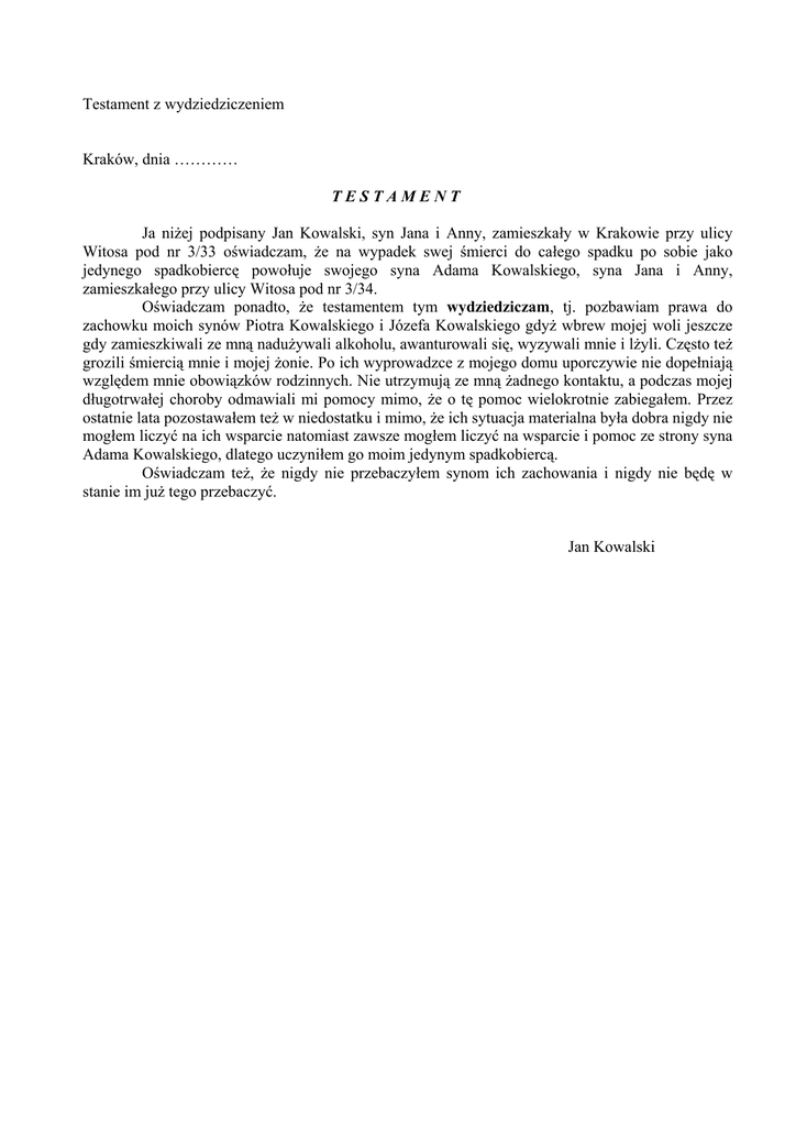 Testament z wydziedziczeniem Kraków, dnia ………… TESTAMENT Ja niżej podpisany Jan Kowalski, syn Jana i Anny, zamieszkały w Krakowie przy ulicy Witosa pod nr 3/33 oświadczam, że na wypadek swej śmierci do całego spadku po sobie jako jedynego spadkobiercę powołuje swojego syna Adama Kowalskiego, syna Jana i Anny, zamieszkałego przy ulicy Witosa pod nr 3/34. Oświadczam ponadto, że testamentem tym wydziedziczam, tj. pozbawiam prawa do zachowku moich synów Piotra Kowalskiego i Józefa Kowalskiego gdyż wbrew mojej woli jeszcze gdy zamieszkiwali ze mną nadużywali alkoholu, awanturowali się, wyzywali mnie i lżyli. Często też grozili śmiercią mnie i mojej żonie. Po ich wyprowadzce z mojego domu uporczywie nie dopełniają względem mnie obowiązków rodzinnych. Nie utrzymują ze mną żadnego kontaktu, a podczas mojej długotrwałej choroby odmawiali mi pomocy mimo, że o tę pomoc wielokrotnie zabiegałem. Przez ostatnie lata pozostawałem też w niedostatku i mimo, że ich sytuacja materialna była dobra nigdy nie mogłem liczyć na ich wsparcie natomiast zawsze mogłem liczyć na wsparcie i pomoc ze strony syna Adama Kowalskiego, dlatego uczyniłem go moim jedynym spadkobiercą. Oświadczam też, że nigdy nie przebaczyłem synom ich zachowania i nigdy nie będę w stanie im już tego przebaczyć. Jan Kowalski