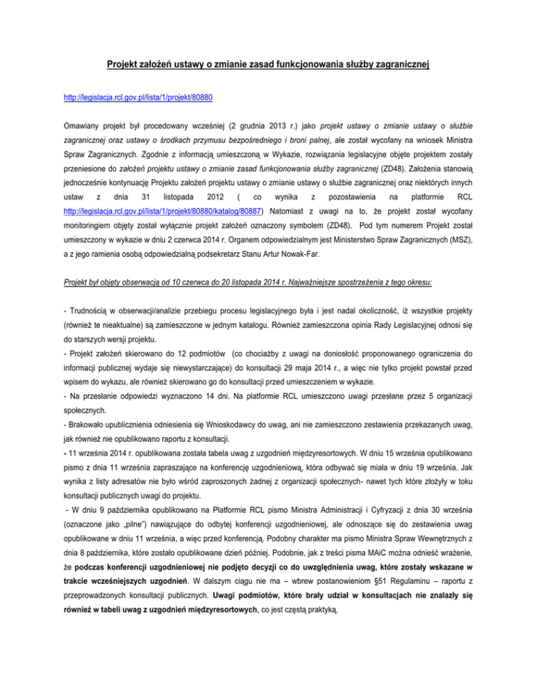Projekt założeń ustawy o zmianie zasad funkcjonowania służby zagranicznej http://legislacja.rcl.gov.pl/lista/1/projekt/80880 Omawiany projekt był procedowany wcześniej (2 grudnia 2013 r.) jako projekt ustawy o zmianie ustawy o służbie zagranicznej oraz ustawy o środkach przymusu bezpośredniego i broni palnej, ale został wycofany na wniosek Ministra Spraw Zagranicznych. Zgodnie z informacją umieszczoną w Wykazie, rozwiązania legislacyjne objęte projektem zostały przeniesione do założeń projektu ustawy o zmianie zasad funkcjonowania służby zagranicznej (ZD48). Założenia stanowią jednocześnie kontynuację Projektu założeń projektu ustawy o zmianie ustawy o służbie zagranicznej oraz niektórych innych ustaw z dnia 31 listopada 2012 ( co wynika z pozostawienia na platformie RCL http://legislacja.rcl.gov.pl/lista/1/projekt/80880/katalog/80887) Natomiast z uwagi na to, że projekt został wycofany monitoringiem objęty został wyłącznie projekt założeń oznaczony symbolem (ZD48). Pod tym numerem Projekt został umieszczony w wykazie w dniu 2 czerwca 2014 r. Organem odpowiedzialnym jest Ministerstwo Spraw Zagranicznych (MSZ), a z jego ramienia osobą odpowiedzialną podsekretarz Stanu Artur Nowak-Far. Projekt był objęty obserwacją od 10 czerwca do 20 listopada 2014 r. Najważniejsze spostrzeżenia z tego okresu: - Trudnością w obserwacji/analizie przebiegu procesu legislacyjnego była i jest nadal okoliczność, iż wszystkie projekty (również te nieaktualne) są zamieszczone w jednym katalogu. Również zamieszczona opinia Rady Legislacyjnej odnosi się do starszych wersji projektu. - Projekt założeń skierowano do 12 podmiotów (co chociażby z uwagi na doniosłość proponowanego ograniczenia do informacji publicznej wydaje się niewystarczające) do konsultacji 29 maja 2014 r., a więc nie tylko projekt powstał przed wpisem do wykazu, ale również skierowano go do konsultacji przed umieszczeniem w wykazie. - Na przesłanie odpowiedzi wyznaczono 14 dni. Na platformie RCL umieszczono uwagi przesłane przez 5 organizacji społecznych. - Brakowało upublicznienia odniesienia się Wnioskodawcy do uwag, ani nie zamieszczono zestawienia przekazanych uwag, jak również nie opublikowano raportu z konsultacji. - 11 września 2014 r. opublikowana została tabela uwag z uzgodnień międzyresortowych. W dniu 15 września opublikowano pismo z dnia 11 września zapraszające na konferencję uzgodnieniową, która odbywać się miała w dniu 19 września. Jak wynika z listy adresatów nie było wśród zaproszonych żadnej z organizacji społecznych- nawet tych które złożyły w toku konsultacji publicznych uwagi do projektu. - W dniu 9 października opublikowano na Platformie RCL pismo Ministra Administracji i Cyfryzacji z dnia 30 września (oznaczone jako „pilne”) nawiązujące do odbytej konferencji uzgodnieniowej, ale odnoszące się do zestawienia uwag opublikowane w dniu 11 września, a więc przed konferencją. Podobny charakter ma pismo Ministra Spraw Wewnętrznych z dnia 8 października, które zostało opublikowane dzień później. Podobnie, jak z treści pisma MAiC można odnieść wrażenie, że podczas konferencji uzgodnieniowej nie podjęto decyzji co do uwzględnienia uwag, które zostały wskazane w trakcie wcześniejszych uzgodnień. W dalszym ciągu nie ma – wbrew postanowieniom §51 Regulaminu – raportu z przeprowadzonych konsultacji publicznych. Uwagi podmiotów, które brały udział w konsultacjach nie znalazły się również w tabeli uwag z uzgodnień międzyresortowych, co jest częstą praktyką. Obserwacje poczynione między 20 listopada 2014 – 15 lutego 2015 r: Nie ujawniono żadnych dalszych działań związany z projektem. Warto jednak zauważyć, że mimo, że nowe dokumenty były umieszczane w latach 2013-2014 na platformie RCL istnieje informacja, że ostatnia modyfikacja miała miejsce w 2012 r. co nie jest prawdą. Krzysztof Izdebski 16 lutego 2015