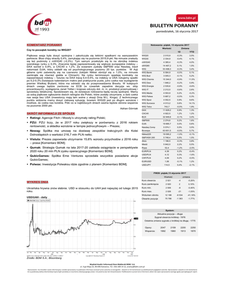 BIULETYN PORANNY poniedziałek, 16 stycznia 2017 KOMENTARZ PORANNY Notowania: piątek, 13 stycznia 2017 Wartość Czy to początek korekty na WIG20? Zmiana 1D YTD Piątkowa sesja była dosyć spokojna i zakończyła się lekkimi spadkami na warszawskim parkiecie. Blue chipy straciły 0,4%, zamykając się na poziomie 2015,9 pkt. Na minusie znalazły się też podmioty z mWIG40 (-0,3%). Tym samym przełożyło się to na obniżkę indeksu szerokiego rynku o 0,3%. Znacznie lepiej zaprezentowały się większe europejskie indeksy – DAX wzrósł o 0,9%, a CAC40 o 1,2%. Za oceanem zyskały S&P500 oraz Nasdaq, tracił natomiast DJIA, który oddalił się od psychologicznego poziomu 20 tys. punktów. W Azji główne rynki zaświeciły się na czerwono (tokijski Nikkei obniżył się o 1,0%, na minusie zamknęła się również giełda w Chinach). Na rynku terminowym spadają kontrakty na najważniejsze indeksy – futures na DAX tracą 0,4-0,5%, na indeksy w USA notujemy spadki po 0,2-0,3%.Dzisiejsze kalendarium makro jest praktycznie puste, jutro czeka nas wystąpienie premier Wielkiej Brytanii, która ma odnieść się do przeprowadzenia Brexitu. W kolejnych dniach uwaga będzie zwrócona na ECB (w czwartek zapadnie decyzja ws. stóp procentowych), wystąpienia Janet Yellen i krajowe odczyty dot. m. in. produkcji przemysłowej i sprzedaży detalicznej. Spodziewam się, że dzisiejsze notowania będą raczej spokojne. Mamy za sobą piątkowe ogłoszenie dwóch ratingów dla Polski, które zostały utrzymane, a dziś czeka nas sesja bez USA (inwestorzy mają tam wolne z okazji Dnia M.L. Kinga). Z technicznego punktu widzenia mamy dosyć ciekawą sytuację, bowiem WIG20 jest po długim wzroście i możliwe, że czeka nas korekta. Póki co w najbliższych dniach ważna będzie obrona wsparcia na poziomie 2000 pkt. Adrian Górniak WIG20 2 015,9 -0,3% 3,5% WIG30 2 334,9 -0,4% 4,1% mWIG40 4 385,4 -0,3% 4,0% sWIG80 14 467,2 0,1% 1,5% WIG 53 498,3 -0,3% 3,4% WIG Banki 6 584,9 -0,5% 5,1% WIG Bud 3 005,3 -0,1% 5,2% WIG Chemia 15 344,0 -0,9% 11,5% WIG Dew 1 846,2 -0,2% 0,9% WIG Energia 2 535,6 -0,9% -0,6% WIG IT 2 212,0 -0,6% 2,6% WIG Media 4 553,9 0,2% -0,2% WIG Paliwa 5 687,2 -0,5% 0,3% WIG Spoż 4 552,5 0,9% 9,6% WIG Surowce 4 013,2 0,6% 14,1% 743,7 -0,5% 1,9% DAX 11 629,2 0,9% 1,3% SKRÓT INFORMACJI ZE SPÓŁEK CAC40 4 922,5 1,2% 1,2% Ratingi: Agencje Fitch i Moody’s utrzymały rating Polski; BUX 32 949,8 -0,1% 3,0% S&P500 2 274,6 0,2% 1,6% DJIA 19 885,7 0,0% 0,6% Nasdaq Comp 5 574,1 0,5% 3,5% Newag: Spółka ma umowę na dostawę zespołów trakcyjnych dla Kolei Dolnośląskich o wartości 216,7 mln PLN netto; Bovespa 63 651,5 -0,5% 5,7% Nikkei225 19 095,2 -1,0% -0,1% Vistula: Prezes zapowiada utrzymanie 15,6% wzrostu przychodów z 2016 roku – prasa [Komentarz BDM]; S&P/ASX 200 5 748,4 0,5% 1,5% Złoto 1 196,5 -0,3% 3,8% Miedź 5 842,0 2,2% 5,5% Ropa 52,4 -1,2% -2,5% EUR/PLN 4,39 0,2% -0,4% USD/PLN 4,12 0,3% -1,6% CHF/PLN 4,09 0,2% -0,5% EUR/USD 1,06 -0,1% 1,2% USD/JPY 114,5 0,4% -2,1% PZU: PZU liczy, że w 2017 roku zwiększy w porównaniu z 2016 rokiem rentowność, a składka wzrośnie w tempie jednocyfrowym – Prezes; Qumak: Strategia Qumak na lata 2017-20 zakłada osiągnięcie w perspektywie 2020 roku 20 mln PLN zysku operacyjnego [Komentarz BDM]; QubicGames: Spółka Erne Ventures sprzedała wszystkie posiadane akcje QubicGames; Polwax: Inwestycja Polwaksu idzie zgodnie z planem [Komentarz BDM]; WIG Telco FW20: piątek,13 stycznia 2017 Wartość WYKRES DNIA Ukraińska hrywna znów słabnie. USD w stosunku do UAH jest najwyżej od lutego 2015 roku. USD/UAH - daily zmiana Kurs otwarcia 2 021 -4 Kurs zamknięcia 2 020 2 0,10% Kurs min. 2 006 -8 -0,40% -0,20% Kurs max. 2 026 -21 -1,03% Wolumen obrotu 12 188 -8 534 -41,18% Otwarte pozycje 75 786 -1 363 -1,77% System: Aktualna pozycja – długa Sygnał otwarcia krótkiej– 1976 Ostatnia zmiana sygnału z krótkiej na długą - 1775 Opory: 2047 2159 2200 2250 Wsparcia: 1992 1960 1913 1870 Źródło: BDM S.A., Bloomberg Wydział Analiz i Informacji Dom Maklerski BDM S.A. ul. 3-go Maja 23, 40-096 Katowice, Tel.: 032 208 14 12, [email protected] Opracowanie ma charakter czysto informacyjny i zostało opracowany na podstawie informacji uznanych przez autorów za wiarygodne . Zawarte w nim komentarze są subiektywnymi poglądami autorów. Opracowanie i zawarte w nim komentarze nie są podstawą żadnej rekomendacji kupna bądź sprzedaży w rozumieniu obowiązującego prawa i nie powinny być tak interpretowane. Publikowanie w prasie lub w Internecie całości lub części opracowania wymaga zgody sporządzających raport. BIULETYN PORANNY poniedziałek, 16 stycznia 2017 GPW – PODSUMOWANIE Indeksy GPW FW20 (2,021.00, 2,026.00, 2,006.00, 2,020.00, +2.00000) 2050 2000 1950 Open Low High Close WIG20 2 023,0 2 007,2 2 027,0 2 015,9 -0,4% 566 WIG30 2 346,2 2 323,4 2 346,7 2 334,9 -0,4% 660 MWIG40 4 402,3 14 401,9 14 504,2 4 385,4 -0,3% 141 SWIG80 14 448,2 4 367,0 4 402,4 14 467,2 0,1% 72 WIG-PL 54 248,7 54 248,7 54 305,5 54 305,5 -0,3% 776 WIG 53 707,8 53 301,9 53 715,5 53 498,3 -0,3% 800 WIG20 Cena Mkt Cap Alior 1800 1750 1700 11 18 25 1 8 August 16 22 29 5 12 19 September 26 3 10 October 17 24 31 7 14 21 November 28 5 12 19 December 27 2 9 2017 16 23 30 WIG20 (2,023.01, 2,027.02, 2,007.24, 2,015.89, -7.05994) 2050 2000 1950 1900 1850 1800 1750 1700 11 18 25 1 8 August 16 22 29 5 12 19 September 26 3 10 October 17 24 31 7 14 21 November 28 5 12 19 December 27 2 9 2017 16 23 30 KOMENTARZ POPOŁUDNIOWY Spółki budowlane znów w centrum uwagi Piątkowa sesja przyniosła kontynuację wczorajszej niewielkiej realizacji zysków na GPW. Indeks WIG20 cofnął się w stronę 2010 punktów, lecz przy spokojnym otoczeniu (wieczorne odbicie w USA ustawiło pozytywne nastroje dziś w Europie) rynek nie miał ochoty na większe cofnięcie. Ostatecznie WIG20 stracił dziś na wartości 0,3%, a w perspektywie całego tygodnia zyskał 0,8%. Liderem dnia jak i ca