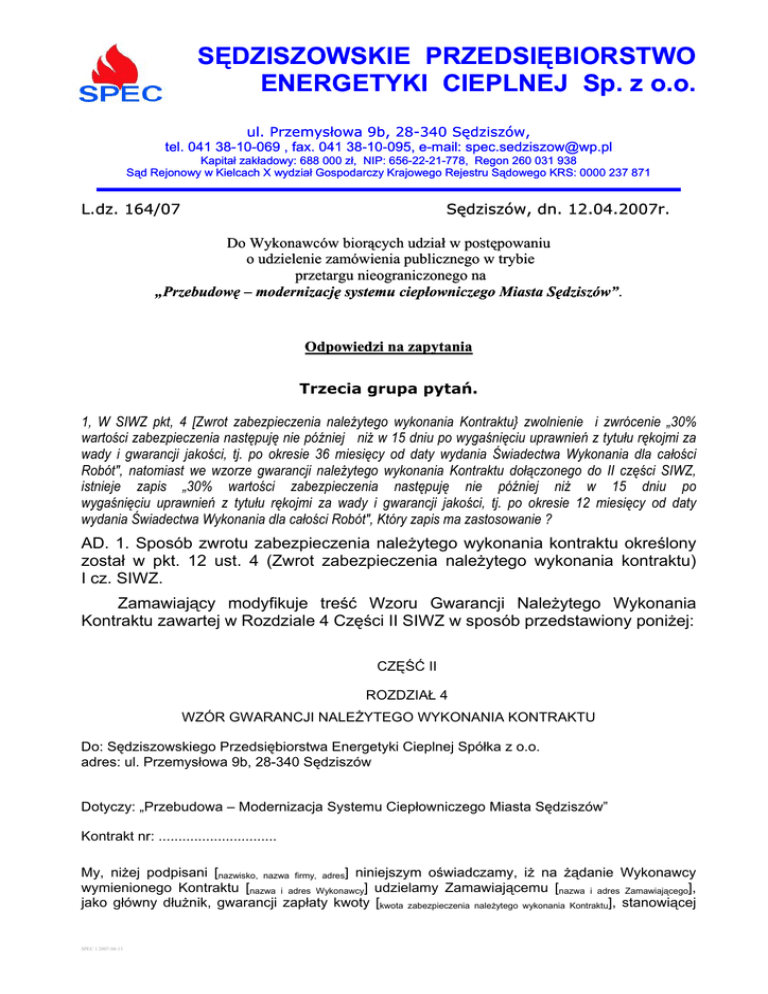 SĘDZISZOWSKIE PRZEDSIĘBIORSTWO ENERGETYKI CIEPLNEJ Sp. z o.o. ul. Przemysłowa 9b, 28-340 Sędziszów, tel. 041 38-10-069 , fax. 041 38-10-095, e-mail: [email protected] Kapitał zakładowy: 688 000 zł, NIP: 656-22-21-778, Regon 260 031 938 Sąd Rejonowy w Kielcach X wydział Gospodarczy Krajowego Rejestru Sądowego KRS: 0000 237 871 L.dz. 164/07 Sędziszów, dn. 12.04.2007r. Do Wykonawców biorących udział w postępowaniu o udzielenie zamówienia publicznego w trybie przetargu nieograniczonego na „Przebudowę – modernizację systemu ciepłowniczego Miasta Sędziszów”. Odpowiedzi na zapytania Trzecia grupa pytań. 1, W SIWZ pkt, 4 [Zwrot zabezpieczenia należytego wykonania Kontraktu} zwolnienie i zwrócenie „30% wartości zabezpieczenia następuję nie później niż w 15 dniu po wygaśnięciu uprawnień z tytułu rękojmi za wady i gwarancji jakości, tj. po okresie 36 miesięcy od daty wydania Świadectwa Wykonania dla całości Robót", natomiast we wzorze gwarancji należytego wykonania Kontraktu dołączonego do II części SIWZ, istnieje zapis „30% wartości zabezpieczenia następuję nie później niż w 15 dniu po wygaśnięciu uprawnień z tytułu rękojmi za wady i gwarancji jakości, tj. po okresie 12 miesięcy od daty wydania Świadectwa Wykonania dla całości Robót", Który zapis ma zastosowanie ? AD. 1. Sposób zwrotu zabezpieczenia należytego wykonania kontraktu określony został w pkt. 12 ust. 4 (Zwrot zabezpieczenia należytego wykonania kontraktu) I cz. SIWZ. Zamawiający modyfikuje treść Wzoru Gwarancji Należytego Wykonania Kontraktu zawartej w Rozdziale 4 Części II SIWZ w sposób przedstawiony poniżej: CZĘŚĆ II ROZDZIAŁ 4 WZÓR GWARANCJI NALEŻYTEGO WYKONANIA KONTRAKTU Do: Sędziszowskiego Przedsiębiorstwa Energetyki Cieplnej Spółka z o.o. adres: ul. Przemysłowa 9b, 28-340 Sędziszów Dotyczy: „Przebudowa – Modernizacja Systemu Ciepłowniczego Miasta Sędziszów” Kontrakt nr: .............................. My, niżej podpisani [nazwisko, nazwa firmy, adres] niniejszym oświadczamy, iż na żądanie Wykonawcy wymienionego Kontraktu [nazwa i adres Wykonawcy] udzielamy Zamawiającemu [nazwa i adres Zamawiającego], jako główny dłużnik, gwarancji zapłaty kwoty [kwota zabezpieczenia należytego wykonania Kontraktu], stanowiącej SPEC 1 2007-04-13 Zabezpieczenie Wykonania wymienione w klauzuli 4.2 Warunków Kontraktu, bezspornie, po otrzymaniu pierwszego wezwania na piśmie od Zamawiającego. Zgadzamy się również, że żadna zmiana ani uzupełnienie lub jakakolwiek modyfikacja Warunków Kontraktu lub Robót, które mają zostać wykonane zgodnie z wymienionym powyżej Kontraktem lub w jakichkolwiek dokumentach stanowiących Kontrakt, jakie mogą zostać sporządzone między Państwem a Wykonawcą, nie zwalnia nas w żaden sposób z odpowiedzialności wynikającej z niniejszej gwarancji. Niniejszym rezygnujemy z konieczności zawiadamiania nas o takiej zmianie, uzupełnieniu lub modyfikacji. Gwarancja należytego wykonania Kontraktu wchodzi w życie i uzyskuje moc obowiązującą od daty podpisania Kontraktu przez obie Strony, tj. przez Wykonawcę i Zamawiającego i będzie ważna w pełnej (100%) wysokości do daty wydania Świadectwa Wykonania dla całości Robót. Gwarancja jest bezwarunkowa i nieodwołalna, płatna na pierwsze żądanie. Gwarancja wykonania musi być wykonalna na terytorium Rzeczypospolitej Polskiej. Gwarancja należytego wykonania Kontraktu będzie zwolniona i zwrócona Wykonawcy w następujący sposób: (a) 70% wartości zabezpieczenia w terminie 30 (trzydziestu) dni od dnia wykonania Kontraktu i uznania go przez Zamawiającego za należycie wykonany, tj. od daty wydania Świadectwa Wykonania dla całości Robót; (b) 30% wartości zabezpieczenia nie później niż w 15 (piętnastym) dniu po wygaśnięciu uprawnień z tytułu rękojmi za wady i gwarancji jakości, tj. po okresie 36 miesięcy od daty wydania Świadectwa Wykonania dla całości Robót. Wszelkie spory dotyczące gwarancji podlegają rozstrzygnięciu zgodnie z prawem Rzeczypospolitej Polskiej i podlegają kompetencji sądu właściwego dla siedziby Zamawiającego. Sporządzono w: _________________________, dnia ________________. Nazwisko i imię: _______________ W imieniu ___________________ Podpis: ____________________ 2, Czy możliwe jest ułożenie światłowodu w rurze osłonowej PE karbowanej w ziemi na trasie modernizowanej oraz nowoprojektowanej sieci napowietrznej dn 200 ? AD.2 Zamawiający zakłada ułożenie światłowodu na estakadzie wzdłuż trasy modernizowanej oraz nowoprojektowanej sieci napowietrznej dn 200. 3, Jakie są zakładane maksymalne przerwy w dostawie czynnika ciepłowniczego przy realizacji zadania ? AD.3. Informacje te zostały określone przez Zamawiającego w ST-2 SIWZ w punkcie Wymagania dotyczące harmonogramu realizacji. Z poważaniem Prezes Zarządu mgr inż. Opr. Mariusz Skierski SPEC 1 2007-04-13 Andrzej Kluczka