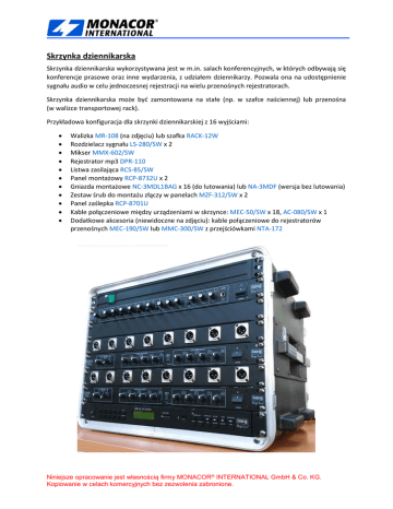 Skrzynka dziennikarska Skrzynka dziennikarska wykorzystywana jest w m.in. salach konferencyjnych, w których odbywają się konferencje prasowe oraz inne wydarzenia, z udziałem dziennikarzy. Pozwala ona na udostępnienie sygnału audio w celu jednoczesnej rejestracji na wielu przenośnych rejestratorach. Skrzynka dziennikarska może być zamontowana na stałe (np. w szafce naściennej) lub przenośna (w walizce transportowej rack). Przykładowa konfiguracja dla skrzynki dziennikarskiej z 16 wyjściami: Walizka MR-108 (na zdjęciu) lub szafka RACK-12W Rozdzielacz sygnału LS-280/SW x 2 Mikser MMX-602/SW Rejestrator mp3 DPR-110 Listwa zasilająca RCS-85/SW Panel montażowy RCP-8732U x 2 Gniazda montażowe NC-3MDL1BAG x 16 (do lutowania) lub NA-3MDF (wersja bez lutowania) Zestaw śrub do montażu złączy w panelach MZF-312/SW x 2 Panel zaślepka RCP-8701U Kable połączeniowe między urządzeniami w skrzynce: MEC-50/SW x 18, AC-080/SW x 1 Dodatkowe akcesoria (niewidoczne na zdjęciu): kable połączeniowe do rejestratorów przenośnych MEC-190/SW lub MMC-300/SW z przejściówkami NTA-172 Niniejsze opracowanie jest własnością firmy MONACOR® INTERNATIONAL GmbH & Co. KG. Kopiowanie w celach komercyjnych bez zezwolenia zabronione. Schemat połączeń skrzynki dziennikarskiej Niniejsze opracowanie jest własnością firmy MONACOR® INTERNATIONAL GmbH & Co. KG. Kopiowanie w celach komercyjnych bez zezwolenia zabronione.