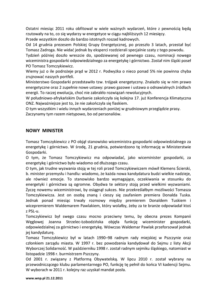 Ostatni miesiąc 2011 roku obfitował w wiele ważnych wydarzeń, które z pewnością będą rzutowały na to, co się wydarzy w energetyce w ciągu najbliższych 12 miesięcy. Przede wszystkim doszło do bardzo istotnych roszad kadrowych. Od 14 grudnia prezesem Polskiej Grupy Energetycznej, po przeszło 3 latach, przestał być Tomasz Zadroga. Nie widać jednak by eksperci rozdzierali specjalnie szaty z tego powodu. Tydzień później doszło wreszcie do, spodziewanej od pewnego czasu, nominacji nowego wiceministra gospodarki odpowiedzialnego za energetykę i górnictwo. Został nim śląski poseł PO Tomasz Tomczykiewicz. Wiemy już o ile podrożeje prąd w 2012 r. Podwyżka o nieco ponad 5% nie powinna chyba zrujnować naszych portfeli. Ministerstwo Gospodarki przedstawiło tzw. trójpak energetyczny. Znalazło się w nim prawo energetyczne oraz 2 zupełnie nowe ustawy: prawo gazowe i ustawa o odnawialnych źródłach energii. To raczej ewolucja, choć nie zabrakło rozwiązań rewolucyjnych. W południowo-afrykańskim Durbanie zakończyła się kolejna 17. już Konferencja Klimatyczna ONZ. Najważniejsze jest to, że nie zakończyła się fiaskiem. O tym wszystkim i wielu innych wydarzeniach poniżej w grudniowym przeglądzie prasy. Zaczynamy tym razem nietypowo, bo od personaliów. NOWY MINISTER Tomasz Tomczykiewicz z PO objął stanowisko wiceministra gospodarki odpowiedzialnego za energetykę i górnictwo. W środę, 21 grudnia, potwierdzono tę informację w Ministerstwie Gospodarki. O tym, że Tomasz Tomczykiewicz ma odpowiadać, jako wiceminister gospodarki, za energetykę i górnictwo było wiadomo od dłuższego czasu. O tym, jak trudne wyzwania stoją w tej roli przed Tomczykiewiczem mówił Klemens Ścierski, b. minister przemysłu i handlu: wiadomo, że każda nowa kandydatura budzi wielkie nadzieje, ale również emocje. To stanowisko bardzo wymagające, oczekiwania w stosunku do energetyki i górnictwa są ogromne. Obydwa te sektory stoją przed wielkimi wyzwaniami. Życzę nowemu wiceministrowi, by osiągnął sukces. Nie przekreślałbym możliwości Tomasza Tomczykiewicza. Jest on osobą znaną i cieszy się zaufaniem premiera Donalda Tuska. Jednak ponad miesiąc trwały rozmowy między premierem Donaldem Tuskiem i wicepremierem Waldemarem Pawlakiem, który wolałby, żeby za te branże odpowiadał ktoś z PSL-u. Tomczykiewicz był swego czasu mocno przeciwny temu, by obecna prezes Kompanii Węglowej Joanna Strzelec-Łobodzińska objęła funkcję wiceminister gospodarki, odpowiedzialnej za górnictwo i energetykę. Wówczas Waldemar Pawlak przeforsował jednak jej kandydaturę. Tomasz Tomczykiewicz był w latach 1990–98 radnym rady miejskiej w Pszczynie oraz członkiem zarządu miasta. W 1997 r. bez powodzenia kandydował do Sejmu z listy Akcji Wyborczej Solidarność. W październiku 1998 r. został radnym sejmiku śląskiego, natomiast w listopadzie 1998 r. burmistrzem Pszczyny. Od 2001 r. związany z Platformą Obywatelską. W lipcu 2010 r. został wybrany na przewodniczącego klubu parlamentarnego PO, funkcję tę pełnił do końca VI kadencji Sejmu. W wyborach w 2011 r. kolejny raz uzyskał mandat posła. www.wnp.pl 21.12.2011 2 Jak powiedział wicepremier Pawlak, nowy wiceminister będzie zajmował się "sprawami związanymi z energetyką". Nieoficjalnie mówi się, że zajmie się górnictwem. W tej chwili nadzór górnictwem, a także energetyką i gazem oraz ropą w resorcie gospodarki sprawuje wiceminister Maciej Kaliski. Spekuluje się, że powołanie wiceministra, należącego do Platformy Obywatelskiej, może być początkiem procesu wydzielania Ministerstwa Energetyki. www.cire.pl 21.12.2011 WIĘCEJ PRĄDU W listopadzie produkcja energii elektrycznej w Polsce była o 6,71% wyższa niż rok temu, a po 11 miesiącach 2011 r. o 5,17% większa niż w analogicznym okresie 2010 r. - wynika ze wstępnych danych PSE Operator. W listopadzie produkcja energii elektrycznej w Polsce wyniosła 14,399 TWh i była wyższa o 6,71% niż w listopadzie 2010 r. Natomiast w okresie styczeń-listopad 2011 r. wyniosła 148,621 TWh i była większa o 5,17% niż w analogicznym okresie 2010 r. W minionym miesiącu większe było też krajowe zużycie energii elektrycznej niż w listopadzie 2010 r. - 14,320 TWh. Było o 8,07% więcej niż rok wcześniej. W okresie styczeń-listopad 2011, zużycie energii elektrycznej w Polsce wyniosło 144,400 TWh i było o 3,01% większe niż w tym samym okresie 2010 r. Widoczna nadwyżka produkcji energii elektrycznej nad jej krajowym zużyciem to rezultat sprzyjającej polskim elektrowniom koniunktury w handlu zagranicznym energią elektryczną. W okresie styczeń-listopad 2011 r. nadwyżka eksportu nad importem prądu wyniosła 4,222 TWh, a w analogicznym okresie 2010 r. - 1,126 TWh. W strukturze paliwowej produkcji naturalnie nadal zdecydowanie dominuje węgiel. W listopadzie udział elektrowni zawodowych na węgiel kamienny w produkcji energii elektrycznej ogółem wyniósł w Polsce ok. 58,5%, a dynamika wzrostu ich produkcji, która wyniosła 8,433 TWh, osiągnęła poziom 8,69%. Z kolei elektrownie zawodowe na węgiel brunatny wytworzyły w listopadzie 4,396 TWh, a to było o 8,03% więcej niż rok temu i stanowiło ok. 30,5% listopadowej produkcji prądu w Polsce. Natomiast w okresie styczeńlistopad 2011 r. udział elektrowni zawodowych na węgiel kamienny w produkcji energii elektrycznej ogółem wyniósł w Polsce ok. 56%, a elektrowni zawodowych na węgiel brunatny ok. 33% Sporo energii elektrycznej produkują już elektrownie wiatrowe. W okresie styczeń-listopad 2011 r. wytworzyły 2,260 TWh energii elektrycznej, a w tym samym okresie 2010 r. wyprodukowały one 1,132 TWh. Z kolei elektrownie gazowe w pierwszych 11 miesiącach 2011 r. wytworzyły 3,901 TWh energii elektrycznej, co w porównaniu z takim samym okresem 2010 r. oznaczało wzrost produkcji o 3,3%. W Polsce ostatnio nie pada deszcz więc nie dziwi, że elektrownie wo