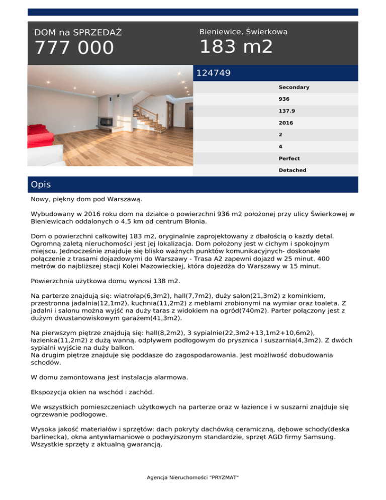 Bieniewice, Świerkowa DOM na SPRZEDAŻ 183 m2 777 000 124749 Secondary 936 137.9 2016 2 4 Perfect Detached Opis Nowy, piękny dom pod Warszawą. Wybudowany w 2016 roku dom na działce o powierzchni 936 m2 położonej przy ulicy Świerkowej w Bieniewicach oddalonych o 4,5 km od centrum Błonia. Dom o powierzchni całkowitej 183 m2, oryginalnie zaprojektowany z dbałością o każdy detal. Ogromną zaletą nieruchomości jest jej lokalizacja. Dom położony jest w cichym i spokojnym miejscu. Jednocześnie znajduje się blisko ważnych punktów komunikacyjnych- doskonałe połączenie z trasami dojazdowymi do Warszawy - Trasa A2 zapewni dojazd w 25 minut. 400 metrów do najbliższej stacji Kolei Mazowieckiej, która dojeżdża do Warszawy w 15 minut. Powierzchnia użytkowa domu wynosi 138 m2. Na parterze znajdują się: wiatrołap(6,3m2), hall(7,7m2), duży salon(21,3m2) z kominkiem, przestronna jadalnia(12,1m2), kuchnia(11,2m2) z meblami zrobionymi na wymiar oraz toaleta. Z jadalni i salonu można wyjść na duży taras z widokiem na ogród(740m2). Parter połączony jest z dużym dwustanowiskowym garażem(41,3m2). Na pierwszym piętrze znajdują się: hall(8,2m2), 3 sypialnie(22,3m2+13,1m2+10,6m2), łazienka(11,2m2) z dużą wanną, odpływem podłogowym do prysznica i suszarnia(4,3m2). Z dwóch sypialni wyjście na duży balkon. Na drugim piętrze znajduje się poddasze do zagospodarowania. Jest możliwość dobudowania schodów. W domu zamontowana jest instalacja alarmowa. Ekspozycja okien na wschód i zachód. We wszystkich pomieszczeniach użytkowych na parterze oraz w łazience i w suszarni znajduje się ogrzewanie podłogowe. Wysoka jakość materiałów i sprzętów: dach pokryty dachówką ceramiczną, dębowe schody(deska barlinecka), okna antywłamaniowe o podwyższonym standardzie, sprzęt AGD firmy Samsung. Wszystkie sprzęty z aktualną gwarancją. Agencja Nieruchomości "PRYZMAT" W sąsiedztwie podobna zabudowa jednorodzinna oraz pełna infrastruktura: przedszkola, szkoła i sklepy. Agencja Nieruchomości "PRYZMAT" tel. 25 758 66 26 email: [email protected] Agencja Nieruchomości "PRYZMAT" Powered by TCPDF (www.tcpdf.org)