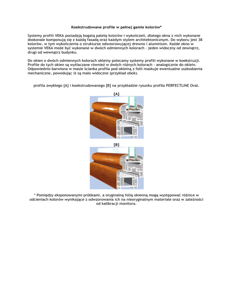 Koekstrudowane profile w pełnej gamie kolorów* Systemy profili VEKA posiadają bogatą paletę kolorów i wykończeń, dlatego okna z nich wykonane doskonale komponują się z kaŜdą fasadą oraz kaŜdym stylem architektonicznym. Do wyboru jest 38 kolorów, w tym wykończenia o strukturze odwzorowującej drewno i aluminium. KaŜde okno w systemie VEKA moŜe być wykonane w dwóch odmiennych kolorach - jeden widoczny od zewnątrz, drugi od wewnątrz budynku. Do okien o dwóch odmiennych kolorach okleiny polecamy systemy profili wykonane w koekstruzji. Profile do tych okien są wytłaczane równieŜ w dwóch róŜnych kolorach - analogicznie do oklein. Odpowiednio barwiona w masie ścianka profila pod okleiną z folii maskuje ewentualne uszkodzenia mechaniczne, powodując iŜ są mało widoczne (przykład obok). profila zwykłego [A] i koekstrudowanego [B] na przykładzie rysunku profila PERFECTLINE Oval. [A] [B] * Pomiędzy eksponowanymi próbkami, a oryginalną folią okienną mogą występować róŜnice w odcieniach kolorów wynikające z odwzorowania ich na nieoryginalnym materiale oraz w zaleŜności od kalibracji monitora.