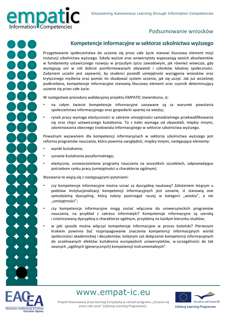 Empowering Autonomous Learning through Information Competencies Podsumowanie wniosków Kompetencje informacyjne w sektorze szkolnictwa wyższego Przygotowanie społeczeństwa do uczenia się przez całe życie stanowi kluczowy element misji instytucji szkolnictwa wyższego. Szkoły wyższe oraz uniwersytety wyposażają swoich absolwentów w fundamenty ustawicznego rozwoju w przyszłym życiu zawodowym, jak również wówczas, gdy występują oni w roli dobrze poinformowanych obywateli i członków lokalnej społeczności. Zadaniem uczelni jest zapewnić, by studenci posiedli umiejętność wyciągania wniosków oraz krytycznego myślenia oraz pomóc im zbudować system uczenia, jak się uczyć. Jak już wcześniej podkreślano, kompetencje informacyjne stanowią kluczowy element oraz czynnik determinujący uczenie się przez całe życie. W następstwie procedury walidacyjnej projektu EMPATIC stwierdzono, iż: • na całym świecie kompetencje informacyjne uznawane są za warunek powstania społeczeństwa informacyjnego oraz gospodarki opartej na wiedzy; • rynek pracy wymaga elastyczności w zakresie umiejętności samodzielnego przekwalifikowania się oraz chęci ustawicznego kształcenia. To z kolei wymaga od obywateli, między innymi, zdominowania obecnego środowiska informacyjnego w sektorze szkolnictwa wyższego. Poważnym wyzwaniem dla kompetencji informacyjnych w sektorze szkolnictwa wyższego jest reforma programów nauczania, która powinna uwzględnić, między innymi, następujące elementy: • wyniki kształcenia; • uznanie kształcenia pozaformalnego; • elastyczne, unowocześnione programy nauczania na wszystkich szczeblach, odpowiadające potrzebom rynku pracy (umiejętności o charakterze ogólnym). Wyzwania te wiążą się z następującymi pytaniami: • czy kompetencje informacyjne można uznać za dyscyplinę naukową? Założeniem leżącym u podstaw instytucjonalizacji kompetencji informacyjnych jest uznanie, iż stanowią one samodzielną dyscyplinę, którą należy postrzegać raczej w kategorii „wiedzy”, a nie „umiejętności”; • czy kompetencje informacyjne mogą zostać włączone do uniwersyteckich programów nauczania, na przykład z zakresu informatyki? Kompetencje informacyjne są szeroką i zróżnicowaną dyscypliną o charakterze ogólnym, przydatną na każdym kierunku studiów; • w jaki sposób można włączyć kompetencje informacyjne w proces boloński? Pierwszym krokiem powinno być rozpropagowanie znaczenia kompetencji informacyjnych wśród społeczności akademickiej i decydentów; kolejnym zaś dołączenie kompetencji informacyjnych do oczekiwanych efektów kształcenia europejskich uniwersytetów, w szczególności do tak zwanych „ogólnych (generycznych) kompetencji instrumentalnych”. www.empat-ic.eu Projekt finansowany przez Komisję Europejską w ramach programu „Uczenie się przez całe życie” (Lifelong Learning Programme).. Empowering Autonomous Learning through Information Competencies Przykłady najlepszych praktyk W projekcie EMPATIC wskazano wiele przykładów dobrych praktyk w sektorze szkolnictwa wyższego, w tym, między innymi: • ALFIN-‐EEES – Skills and Competences in Information Management for Learning to Learn Within European Higher Education (Umiejętności i kompetencje w zakresie zarządzania informacją dla celów uczenia się, jak się uczyć w ramach europejskiego systemu szkolnictwa wyższego) (www.mariapinto.es/alfineees/AlfinEEES.htm); • Graduate Information Literacy Module (Kurs kompetencji informacyjnych dla absolwentów), National University of Ireland Galway (www.informationliteracy.ie/); • Information Literacy Project (Projekt z zakresu kompetencji informacyjnych), Staffordshire University (www.staffs.ac.uk/infoliteracy/index.php), • Masters (MA) in Information Literacy (Studia magisterskie z kompetencji informacyjnych), University of Sheffield (www.shef.ac.uk/is/prospectivepg/courses/il) oraz • SWIM – Streaming Web-‐based Information Modules. Swim Tutorial – Information Search Strategy (Internetowy interaktywny kurs wyszukiwania i wykorzystywania informacji). Aalborg University (www.swiminfo.dk/english.html) Podsumowanie Europejski sektor szkolnictwa wyższego przechodzi obecnie głęboką transformację w ramach procesu bolońskiego, co może stanowić idealną okazję do włączenia kompetencji informacyjnych do reformowanych programów nauczania. Jednakże nadal brakuje powszechnej wiedzy na temat charakteru kompetencji informacyjnych oraz tego, co odróżnia je od kompetencji informatycznych, kompetencji cyfrowych, kompetencji medialnych itd. Wiele osób jest w dalszym ciągu przekonanych, że umiejętność wyszukiwania informacji w Internecie jest wystarczająca i kojarzy kompetencje informacyjne przede wszystkim z informatyką, swobodnym poruszaniem się po sieci i wykorzystywaniem narzędzi komputerowych. Należy przekonać społeczność akademicką do zaakceptowania kompetencji informacyjnych jako nowej dyscypliny naukowej bądź też nawet jako integralnej części ich własnej dyscypliny. www.empat-ic.eu Projekt finansowany przez Komisję Europejską w ramach programu „Uczenie się przez całe życie” (Lifelong Learning Programme)..