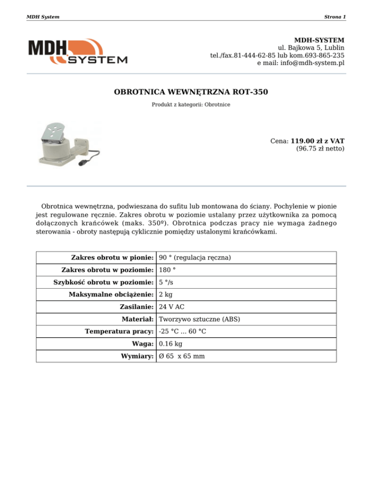 MDH System Strona 1 MDH-SYSTEM ul. Bajkowa 5, Lublin tel./fax.81-444-62-85 lub kom.693-865-235 e mail: [email protected] OBROTNICA WEWNĘTRZNA ROT-350 Produkt z kategorii: Obrotnice Cena: 119.00 zł z VAT (96.75 zł netto) Obrotnica wewnętrzna, podwieszana do sufitu lub montowana do ściany. Pochylenie w pionie jest regulowane ręcznie. Zakres obrotu w poziomie ustalany przez użytkownika za pomocą dołączonych krańcówek (maks. 350º). Obrotnica podczas pracy nie wymaga żadnego sterowania - obroty następują cyklicznie pomiędzy ustalonymi krańcówkami. Zakres obrotu w pionie: 90 ° (regulacja ręczna) Zakres obrotu w poziomie: 180 ° Szybkość obrotu w poziomie: 5 °/s Maksymalne obciążenie: 2 kg Zasilanie: 24 V AC Materiał: Tworzywo sztuczne (ABS) Temperatura pracy: -25 °C ... 60 °C Waga: 0.16 kg Wymiary: Ø 65 x 65 mm MDH System Strona 2 Obrotnica może być również montowana do sufitu: Za pomocą dołączonych krańcówek regulujemy zakres obrotu: MDH System Strona 3 Jedną z największych zalet obrotnicy są jej niewielkie wymiary: W zestawie: Porównanie gabarytowe obrotnic: MDH System Strona 4 Zapraszamy do naszego sklepu internetowego www.mdh-system.pl Dokument wygenerowany 2017-03-04 o godzinie 15:09