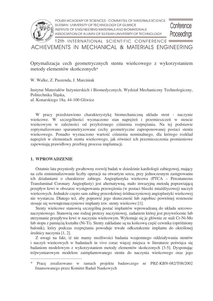0 03 E’ 2 M AM 1 2th Optymalizacja cech geometrycznych stentu wie cowego z wykorzystaniem metody elementów sko czonych* W. Walke, Z. Paszenda, J. Marciniak Instytut Materiałów In ynierskich i Biomedycznych, Wydział Mechaniczny Technologiczny, Politechnika l ska, ul. Konarskiego 18a, 44-100 Gliwice W pracy przedstawiono charakterystyk biomechaniczn układu stent - naczynie wie cowe. W szczególno ci wyznaczono stan napr e i przemieszcze w stencie wie cowym w zale no ci od przyło onego ci nienia rozpr ania. Na tej podstawie zoptymalizowano sparametryzowane cechy geometryczne zaproponowanej postaci stentu wie cowego. Ponadto wyznaczono warto ci nienia nominalnego, dla którego rozkład napr e w elementach stentu wie cowego, jak równie ich przemieszczenia promieniowe zapewniaj prawidłowy przebieg procesu implantacji. 1. WPROWADZENIE Ostatnie lata przyniosły gwałtowny rozwój bada w dziedzinie kardiologii zabiegowej, maj cy na celu zminimalizowanie liczby operacji na otwartym sercu, przy jednoczesnym zast powaniu ich działaniami o charakterze zabiegu. Angioplastyka wie cowa (PTCA – Percutaneous Transluminal Coronary Angioplasty) jest alternatywn , mało inwazyjn metod poprawiaj c przepływ krwi w obszarze wyst powania przew enia (w postaci blaszki mia d ycowej) naczy wie cowych. Jednak e cz sto sam zabieg przezskórnej ródnaczyniowej angioplastyki wie cowej nie wystarcza. Dlatego te , aby poprawi jego skuteczno lub zapobiec powtórnej restenozie stosuje si wewn trznaczyniowe implanty tzw. stenty wie cowe [1]. Stenty wie cowe stanowi szczególn posta implantów wprowadzan do układu sercowonaczyniowego. Stanowi one rodzaj protezy naczyniowej, zadaniem której jest przywrócenie lub utrzymanie przepływu krwi w naczyniu wie cowym. Wykonuje si je głównie ze stali Cr-Ni-Mo lub stopu z pami ci kształtu (Ni-Ti). Stenty zakładane s na ko cow cz cewnika (opró niony balonik), który podczas rozpr ania powoduje trwałe odkształcenie implantu do okre lonej rednicy naczynia [1, 2]. Z uwagi na fakt, i nie mamy mo liwo ci badania wzajemnego oddziaływania stentów i naczy wie cowych w badaniach in vivo coraz wi cej miejsca w literaturze po wi ca si badaniom modelowym z wykorzystaniem metody elementów sko czonych [3-5]. Dysponuj c trójwymiarowym modelem zaimplantowanego stentu do naczynia wie cowego oraz jego * Prac zrealizowano w ramach projektu badawczego nr PBZ-KBN-082/T08/2002 finansowanego przez Komitet Bada Naukowych 1012 W. Walke, Z. Paszenda, J. Marciniak parametrami mechanicznymi jeste my w stanie oszacowa wzajemne relacje pomi dzy tymi obiektami. Prowadzone analizy dotycz najcz ciej rozkładu napr e i przemieszcze poszczególnych elementów zamodelowanego układu oraz problematyki przepływu krwi. Tego rodzaju badania poddawane s równie weryfikacji do wiadczalnej, która umo liwia stworzenie modeli fizycznych i numerycznych z uwzgl dnieniem warunków fizjologicznych rodowiska [6, 7]. Uzyskane z rozwa a modelowych informacje s bardzo u yteczne do optymalizacji cech geometrycznych i materiałowych stentów, a jednocze nie daj przesłanki do techniki implantowania oraz prognozowania cech u ytkowych tego rodzaju implantów. 2. METODYKA BADA Zasadniczym celem zrealizowanej pracy była optymalizacja cech geometrycznych zaproponowanej postaci stentu wie cowego z wykorzystaniem metody elementów sko czonych. Zakres pracy obejmował: • opracowanie modelu geometrycznego stentu wie cowego, • opracowanie modelu geometrycznego naczynia wie cowego, • opracowanie modelu obliczeniowego układu stent – naczynie wie cowe, • wyznaczenie charakterystyk biomechanicznych analizowanego układu stent – naczynie wie cowe. 2.1. Model geometryczny i obliczeniowy stentu wie cowego W pracy zaproponowano model stentu wie cowego typu slotted tube o postaci konstrukcyjnej przedstawionej na rys. 1a. Tego typu stenty wykonywane s z cienko ciennej rurki, na powierzchni której technik laserow wykonywane s wyci cia umo liwiaj ce wymagan zmian rednicy podczas rozpr ania na baloniku. Opracowany model geometryczny stentu o rednicy zewn trznej 2 mm podzielono na elementy sko czone typu SOLID 45 – rys. 1b. Tego typu element u ywany jest przy modelowaniu przestrzennym i definiowany jest przez 8 w złów maj cych po trzy stopnie swobody. Dla analizowanego modelu stentu przyj to dane materiałowe odpowiadaj ce stali AISI 316L w stanie przesyconym (wyznaczone za pomoc statycznej próby rozci gania): • granica plastyczno co Rp0,2 = 270 MPa, • moduł Younga E = 200 000 MPa, • liczba Poisson’a ν = 0,33. a) b) Rys.1. Model stentu wie cowego: a - model geometryczny, b – model z nało on siatk elementów sko czonych Optymalizacja cech geometrycznych stentu wie cowego… 1013 2.2. Model geometryczny i obliczeniowy naczynia wie cowego Model geometryczny naczynia wie cowego wykonany został w postaci cienko ciennej rurki o długo ci 30 mm, rednicy wewn trznej 2,8 mm i grubo ci cianki 0,5 mm – rys.2a. We wn trzu modelu naczynia zasymulowano jego przew enie (wskutek odkładania si blaszki mia d ycowej) do rednicy 2 mm na odcinku równym 8,5 mm. Opracowany model geometryczny naczynia wie cowego podzielono na elementy sko czone typu SOLID 45 – rys. 2b. Dla analizowanego modelu przyj to nast puj ce dane materiałowe: • moduł Younga E = 7,5 MPa, • liczba Poisson’a ν = 0,44. a) b) Rys. 2. Model naczynia wie cowego: a – model geometryczny, b – model z nało on siatk elementów sko czonych 2.3. Model obliczeniowy układu stent – naczynie wie cowe W celu przeprowadzenia oblicze numerycznych w dalszej kolejno ci opracowano model komputerowy zawieraj cy przygotowane modele stentu oraz naczynia wie cowego. Stopnie swobody stentu oraz naczynia wie cowego odebrano w taki sposób, aby odzwierciedlały warunki rzeczywiste. Naczynie wie cowe zostało utwierdzone za pomoc dwóch podpór. Jedna uniemo liwiała realizacj ruchów prostoliniowego oraz obrotowego wzgl dem stałego układu odniesienia OXYZ. N