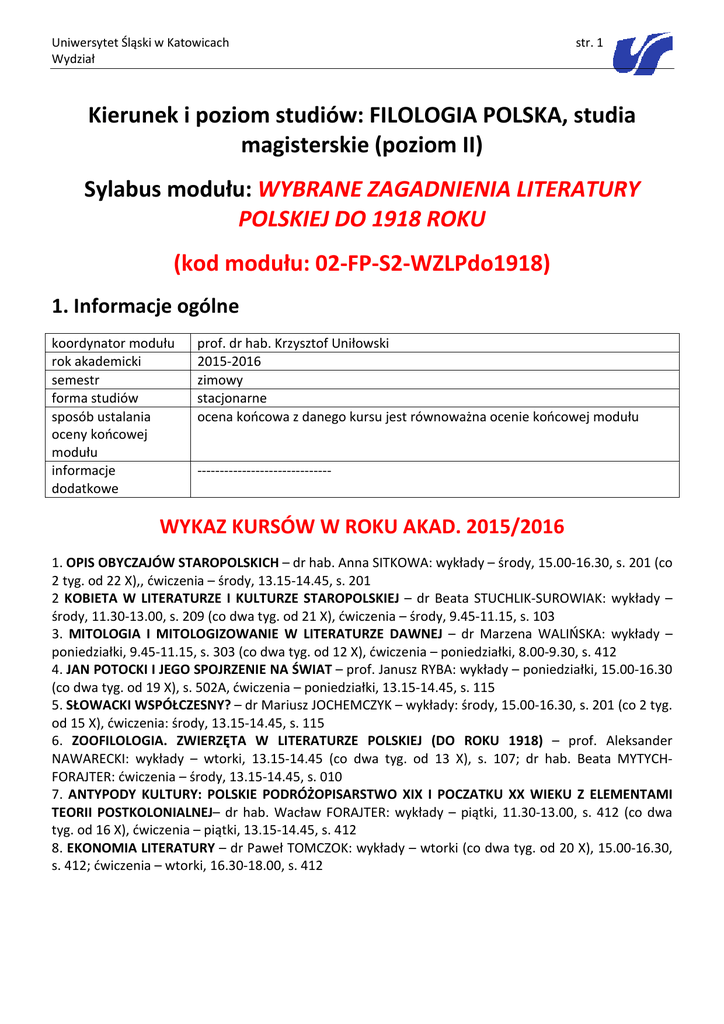 Uniwersytet Śląski w Katowicach Wydział str. 1 Kierunek i poziom studiów: FILOLOGIA POLSKA, studia magisterskie (poziom II) Sylabus modułu: WYBRANE ZAGADNIENIA LITERATURY POLSKIEJ DO 1918 ROKU (kod modułu: 02-FP-S2-WZLPdo1918) 1. Informacje ogólne koordynator modułu rok akademicki semestr forma studiów sposób ustalania oceny końcowej modułu informacje dodatkowe prof. dr hab. Krzysztof Uniłowski 2015-2016 zimowy stacjonarne ocena końcowa z danego kursu jest równoważna ocenie końcowej modułu ------------------------------ WYKAZ KURSÓW W ROKU AKAD. 2015/2016 1. OPIS OBYCZAJÓW STAROPOLSKICH – dr hab. Anna SITKOWA: wykłady – środy, 15.00-16.30, s. 201 (co 2 tyg. od 22 X),, ćwiczenia – środy, 13.15-14.45, s. 201 2 KOBIETA W LITERATURZE I KULTURZE STAROPOLSKIEJ – dr Beata STUCHLIK-SUROWIAK: wykłady – środy, 11.30-13.00, s. 209 (co dwa tyg. od 21 X), ćwiczenia – środy, 9.45-11.15, s. 103 3. MITOLOGIA I MITOLOGIZOWANIE W LITERATURZE DAWNEJ – dr Marzena WALIŃSKA: wykłady – poniedziałki, 9.45-11.15, s. 303 (co dwa tyg. od 12 X), ćwiczenia – poniedziałki, 8.00-9.30, s. 412 4. JAN POTOCKI I JEGO SPOJRZENIE NA ŚWIAT – prof. Janusz RYBA: wykłady – poniedziałki, 15.00-16.30 (co dwa tyg. od 19 X), s. 502A, ćwiczenia – poniedziałki, 13.15-14.45, s. 115 5. SŁOWACKI WSPÓŁCZESNY? – dr Mariusz JOCHEMCZYK – wykłady: środy, 15.00-16.30, s. 201 (co 2 tyg. od 15 X), ćwiczenia: środy, 13.15-14.45, s. 115 6. ZOOFILOLOGIA. ZWIERZĘTA W LITERATURZE POLSKIEJ (DO ROKU 1918) – prof. Aleksander NAWARECKI: wykłady – wtorki, 13.15-14.45 (co dwa tyg. od 13 X), s. 107; dr hab. Beata MYTYCHFORAJTER: ćwiczenia – środy, 13.15-14.45, s. 010 7. ANTYPODY KULTURY: POLSKIE PODRÓŻOPISARSTWO XIX I POCZATKU XX WIEKU Z ELEMENTAMI TEORII POSTKOLONIALNEJ– dr hab. Wacław FORAJTER: wykłady – piątki, 11.30-13.00, s. 412 (co dwa tyg. od 16 X), ćwiczenia – piątki, 13.15-14.45, s. 412 8. EKONOMIA LITERATURY – dr Paweł TOMCZOK: wykłady – wtorki (co dwa tyg. od 20 X), 15.00-16.30, s. 412; ćwiczenia – wtorki, 16.30-18.00, s. 412 Uniwersytet Śląski w Katowicach Wydział str. 2 Nazwa wariantu modułu: „Opis obyczajów” staropolskich 2. Opis zajęć dydaktycznych i pracy studenta nazwa OPIS OBYCZAJÓW STAROPOLSKICH kod 02-FP-S2-WZLdo18.OOS prowadzący grupa(-y) treści zajęć dr hab. Anna Sitkowa logowanie w systemie USOS (limit 17 osób) Zajęcia poświęcone zostaną „opisowi obyczajów” staropolskich w trzech podstawowych kontekstach. Interesować nas będą ówczesne preferencje czytelnicze, łączące się z lekturą dawnych bestsellerów (m. in. Żywotów świętych Piotra Skargi, drukowanych kalendarzy), a także herbarzy, stemmatów, genetliakonów, kazań pogrzebowych. Uwaga skupiona zostanie również na opisach obyczajów, zawartych w wybranych dziełach oddających czytelnicze gusty epoki (m.in. „pijana” facecjonistyka, książki kucharskie, teksty wymierzone przeciw pijaństwu i obżarstwu, przeciw uleganiu modzie, przeciw czarom, icon nationum). Zagadnieniom tym towarzyszyć będzie „opis obyczajów” ówczesnych autorów, którzy dysponując rozmaitymi technikami wykorzystywania wzorów literackich – zgodnie z obowiązującymi wówczas normami estetycznymi – przerabiali utwory cudze lub redagowali własne, ale złożone w całości z cytatów (sygnalizowanych lub nie), zaczerpniętych z dzieł swoich poprzedników. metody prowadzenia zajęć 1/ Wykład z wykorzystaniem prezentacji multimedialnych (15 godz.) przedstawia historię wybranych zjawisk, tendencji oraz ich konteksty. 2/ Ćwiczenia (30 godz.) dotyczą wybranych problemów z zakresu staropolskiego życia literackiego oraz analizy i interpretacji dzieł ilustrujących omawiane tendencje w literaturze liczba godzin dydaktycznych (kontaktowych) liczba godzin pracy własnej studenta opis pracy własnej studenta organizacja zajęć literatura obowiązkowa 45 literatura 135 Przygotowanie do zajęć, obejmujące zalecone lektury literackie i historycznoliterackie; przygotowanie referatu. Kurs obejmuje zajęcia o charakterze konwersatorium oraz dedykowany im wykład. Wymaga się udziału studenta w obu składowych kursu. J. S. Bystroń: Dzieje obyczajów w dawnej Polsce. T. 1-2. Wstęp J. Tazbir. Warszawa 1994; A. Brückner: Encyklopedia staropolska. T. 1-2. Materiał ilustracyjny K. Estreicher. Warszawa 1990; Cudzoziemcy w Polsce. Relacje i opinie. T. 1: wiek X-XVII. Wybór J. Gintel. Kraków 1971; Dawna facecja polska (XVI-XVIII w.). Oprac. J. Krzyżanowski, K. Żukowska-Billip. Warszawa 1960; Słownik literatury staropolskiej. (Średniowiecze. Renesans. Barok). Red. T. Michałowska, współpraca B. Otwinowska, E. Sarnowska-Temeriusz. Wrocław 1990; Słownik sarmatyzmu. Idee, pojęcia, symbole. Red. A. Borowski. Kraków 2001 oraz wybrane teksty literackie. Uczestnicy zajęć otrzymają spis lektur uzupełniających, z których wybiorą teksty lub Uniwersytet Śląski w Katowicach Wydział uzupełniająca str. 3 opracowania przeznaczone do indywidualnej lektury. 3. Opis sposobów weryfikacji efektów kształcenia modułu nazwa „OPIS OBYCZAJÓW” STAROPOLSKICH kod zajęć osoba przeprowadzająca weryfikację grupa wymagania merytoryczne kryteria oceny przebieg procesu weryfikacji kod 02-FP-S2-WZLdo18.OOS --------------------dr hab. Anna Sitkowa logowanie w systemie USOS (limit 17 osób) Test, stanowiący podstawę zaliczenia wykładu, obejmuje wyłącznie problematykę omawianą w jego ramach. Proporcje między oceną z testu z wykładu (test obligatoryjny) a oceną z aktywności oraz z referatu, zredagowanego w formie pisemnej i wygłoszonego na ćwiczeniach 1:1:1. Test przeprowadzony zostanie na ostatnim wykładzie. Termin składania referatu w formie pisemnej – w dniu jego wygłoszenia lub do 19 I 2015 r. Nazwa wariantu modułu: Kobieta w literaturze i kulturze staropolskiej 2. Opis zajęć dydaktycznych i pracy studenta nazwa KOBIETA W LITERATURZE I KUL