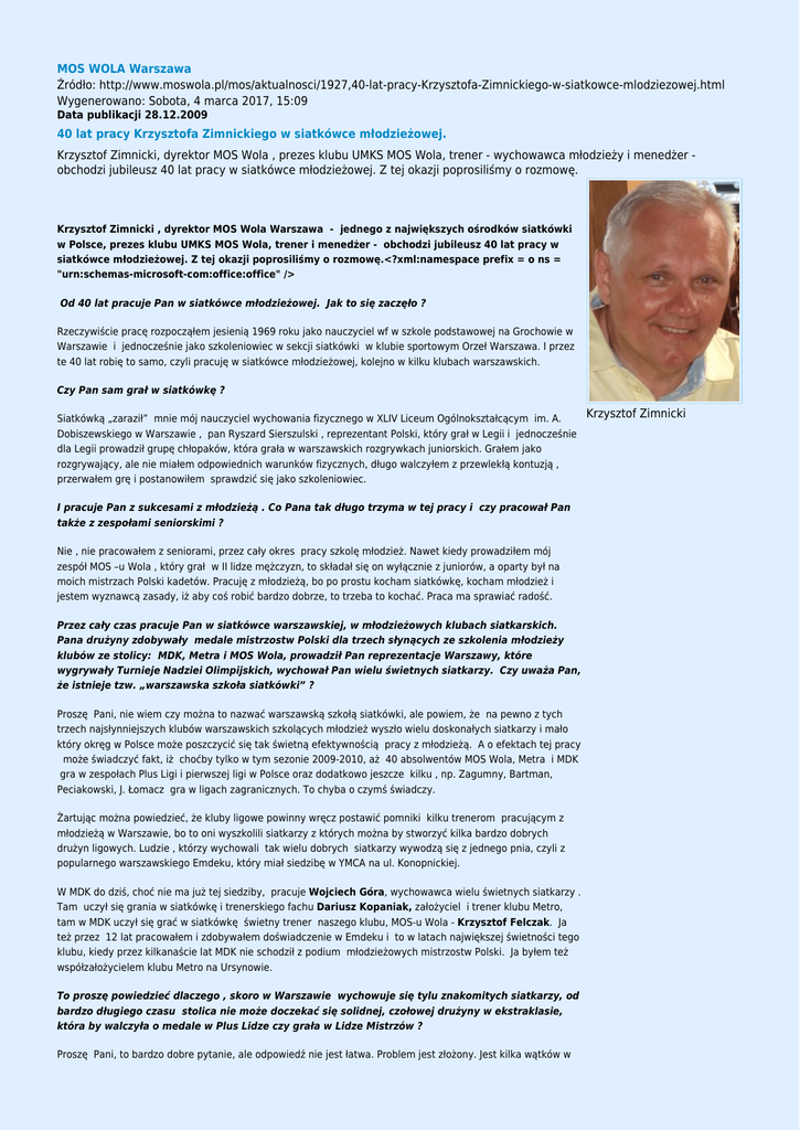 MOS WOLA Warszawa Źródło: http://www.moswola.pl/mos/aktualnosci/1927,40-lat-pracy-Krzysztofa-Zimnickiego-w-siatkowce-mlodziezowej.html Wygenerowano: Sobota, 4 marca 2017, 15:09 Data publikacji 28.12.2009 40 lat pracy Krzysztofa Zimnickiego w siatkówce młodzieżowej. Krzysztof Zimnicki, dyrektor MOS Wola , prezes klubu UMKS MOS Wola, trener - wychowawca młodzieży i menedżer obchodzi jubileusz 40 lat pracy w siatkówce młodzieżowej. Z tej okazji poprosiliśmy o rozmowę. Krzysztof Zimnicki , dyrektor MOS Wola Warszawa - jednego z największych ośrodków siatkówki w Polsce, prezes klubu UMKS MOS Wola, trener i menedżer - obchodzi jubileusz 40 lat pracy w siatkówce młodzieżowej. Z tej okazji poprosiliśmy o rozmowę.<?xml:namespace prefix = o ns = "urn:schemas-microsoft-com:office:office" /> Od 40 lat pracuje Pan w siatkówce młodzieżowej. Jak to się zaczęło ? Rzeczywiście pracę rozpocząłem jesienią 1969 roku jako nauczyciel wf w szkole podstawowej na Grochowie w Warszawie i jednocześnie jako szkoleniowiec w sekcji siatkówki w klubie sportowym Orzeł Warszawa. I przez te 40 lat robię to samo, czyli pracuję w siatkówce młodzieżowej, kolejno w kilku klubach warszawskich. Czy Pan sam grał w siatkówkę ? Krzysztof Zimnicki Siatkówką „zaraził” mnie mój nauczyciel wychowania fizycznego w XLIV Liceum Ogólnokształcącym im. A. Dobiszewskiego w Warszawie , pan Ryszard Sierszulski , reprezentant Polski, który grał w Legii i jednocześnie dla Legii prowadził grupę chłopaków, która grała w warszawskich rozgrywkach juniorskich. Grałem jako rozgrywający, ale nie miałem odpowiednich warunków fizycznych, długo walczyłem z przewlekłą kontuzją , przerwałem grę i postanowiłem sprawdzić się jako szkoleniowiec. I pracuje Pan z sukcesami z młodzieżą . Co Pana tak długo trzyma w tej pracy i czy pracował Pan także z zespołami seniorskimi ? Nie , nie pracowałem z seniorami, przez cały okres pracy szkolę młodzież. Nawet kiedy prowadziłem mój zespół MOS –u Wola , który grał w II lidze mężczyzn, to składał się on wyłącznie z juniorów, a oparty był na moich mistrzach Polski kadetów. Pracuję z młodzieżą, bo po prostu kocham siatkówkę, kocham młodzież i jestem wyznawcą zasady, iż aby coś robić bardzo dobrze, to trzeba to kochać. Praca ma sprawiać radość. Przez cały czas pracuje Pan w siatkówce warszawskiej, w młodzieżowych klubach siatkarskich. Pana drużyny zdobywały medale mistrzostw Polski dla trzech słynących ze szkolenia młodzieży klubów ze stolicy: MDK, Metra i MOS Wola, prowadził Pan reprezentacje Warszawy, które wygrywały Turnieje Nadziei Olimpijskich, wychował Pan wielu świetnych siatkarzy. Czy uważa Pan, że istnieje tzw. „warszawska szkoła siatkówki” ? Proszę Pani, nie wiem czy można to nazwać warszawską szkołą siatkówki, ale powiem, że na pewno z tych trzech najsłynniejszych klubów warszawskich szkolących młodzież wyszło wielu doskonałych siatkarzy i mało który okręg w Polsce może poszczycić się tak świetną efektywnością pracy z młodzieżą. A o efektach tej pracy może świadczyć fakt, iż choćby tylko w tym sezonie 2009-2010, aż 40 absolwentów MOS Wola, Metra i MDK gra w zespołach Plus Ligi i pierwszej ligi w Polsce oraz dodatkowo jeszcze kilku , np. Zagumny, Bartman, Peciakowski, J. Łomacz gra w ligach zagranicznych. To chyba o czymś świadczy. Żartując można powiedzieć, że kluby ligowe powinny wręcz postawić pomniki kilku trenerom pracującym z młodzieżą w Warszawie, bo to oni wyszkolili siatkarzy z których można by stworzyć kilka bardzo dobrych drużyn ligowych. Ludzie , którzy wychowali tak wielu dobrych siatkarzy wywodzą się z jednego pnia, czyli z popularnego warszawskiego Emdeku, który miał siedzibę w YMCA na ul. Konopnickiej. W MDK do dziś, choć nie ma już tej siedziby, pracuje Wojciech Góra, wychowawca wielu świetnych siatkarzy . Tam uczył się grania w siatkówkę i trenerskiego fachu Dariusz Kopaniak, założyciel i trener klubu Metro, tam w MDK uczył się grać w siatkówkę świetny trener naszego klubu, MOS-u Wola - Krzysztof Felczak. Ja też przez 12 lat pracowałem i zdobywałem doświadczenie w Emdeku i to w latach największej świetności tego klubu, kiedy przez kilkanaście lat MDK nie schodził z podium młodzieżowych mistrzostw Polski. Ja byłem też współzałożycielem klubu Metro na Ursynowie. To proszę powiedzieć dlaczego , skoro w Warszawie wychowuje się tylu znakomitych siatkarzy, od bardzo długiego czasu stolica nie może doczekać się solidnej, czołowej drużyny w ekstraklasie, która by walczyła o medale w Plus Lidze czy grała w Lidze Mistrzów ? Proszę Pani, to bardzo dobre pytanie, ale odpowiedź nie jest łatwa. Problem jest złożony. Jest kilka wątków w tej sprawie. Na pewno brak jest zainteresowania władz administracyjnych i sportowych stolicy, aby powstała taka drużyna. W Warszawie wyjątkowo trudno o sponsorów dla sportu. Aby powstała silna drużyna w stolicy, Warszawa powinna mieć grupę prężnych działaczy, menedżerów , którzy by chcieli, powtarzam chcieli stworzyć taki zespół. W stolicy są świetni działacze, którzy sobie bardzo dobrze radzą jako menedżerowie, jak choćby pan prezes PZPS Mirosław Przedpełski, szefowie Plus Ligi mężczyzn i kobiet , panowie Artur Popko i Jacek Kasprzyk, prezes Mazowiecko-Warszawskiego Związku Siatkówki i jednocześnie menedżer reprezentacji Polski mężczyzn, pan Witold Roman. Wszyscy oni reprezentują Warszawę w PZPS. Jak pani widzi to kwiat polskich działaczy siatkarskich. Działając w PZPS sprawdzają się bardzo dobrze, świetnie organizują rozgrywki Plus Ligi, Ligę Światową itd. Proszę więc nie mnie, a ich zapytać dlaczego tak niewiele lub nic nie robią dla warszawskiej siatkówki, ani tej seniorskiej, ani młodzieżowej. No właśnie, ostatnio wiele się słyszy dyskusji o problemie szkolen
