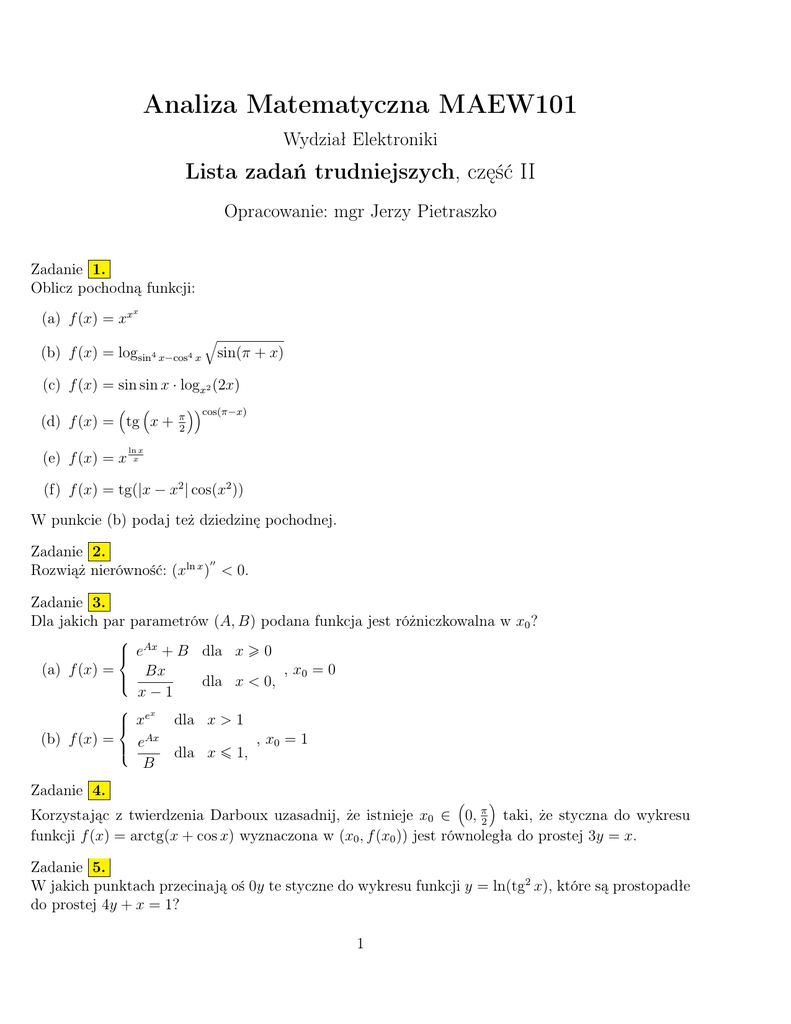 Analiza Matematyczna MAEW101 Wydział Elektroniki Lista zadań trudniejszych, część II Opracowanie: mgr Jerzy Pietraszko Zadanie 1. Oblicz pochodną funkcji: (a) f (x) = xx x (b) f (x) = logsin4 x−cos4 x q sin(π + x) (c) f (x) = sin sin x · logx2 (2x) (d) f (x) = tg x + (e) f (x) = x π 2 cos(π−x) ln x x (f) f (x) = tg(|x − x2 | cos(x2 )) W punkcie (b) podaj też dziedzinę pochodnej. Zadanie 2. 00 Rozwiąż nierówność: (xln x ) < 0. Zadanie 3. Dla jakich par parametrów (A, B) podana funkcja jest różniczkowalna w x0 ? eAx + B dla x 0 (a) f (x) = , x0 = 0 Bx dla x < 0, x−1 x xe dla x > 1 Ax (b) f (x) = , x0 = 1 e dla x ¬ 1, B Zadanie 4. Korzystając z twierdzenia Darboux uzasadnij, że istnieje x0 ∈ 0, π2 taki, że styczna do wykresu funkcji f (x) = arctg(x + cos x) wyznaczona w (x0 , f (x0 )) jest równoległa do prostej 3y = x. Zadanie 5. W jakich punktach przecinają oś 0y te styczne do wykresu funkcji y = ln(tg2 x), które są prostopadłe do prostej 4y + x = 1? 1 Zadanie 6. Wyznacz te styczne do wykresu funkcji y = 2x + 4−x , które są równoległe do podanej prostej: (a) y + x ln 2 = 0; (b) y + ln 2 = 0. Zadanie 7. Wyznacz równanie stycznej do wykresu podanej funkcji we wskazanym punkcie (a) f (x) = (cos(−3x))− cos(π−3x) , π , f ( π9 ) 9 (b) f (x) = xln x , (e, f (e)) (c) f (x) = xln x , (e3 , f (e3 )) Zadanie 8. 2 W jakich punktach (styczności) należy wytyczyć styczne do wykresu funkcji f (x) = xln (2x) , aby nie przechodziły one przez czwartą ćwiartkę układu współrzędnych? Zadanie 9. Wyznacz punkty przecięcia wykresów funkcji f (x) = log2 x oraz g(x) = logx 2. Wybierz dowolny z nich i wykaż, że wyznaczone w nim styczne do wykresów tych funkcji odcinają wraz z osią 0y trójkąt równoramienny. Zadanie 10. W jakim punkcie i pod jakim kątem krzywa y = 41−x przetnie styczną do wykresu f (x) = xlogx 2 wytyczoną w punkcie (666, f (666))? Zadanie 11. W punkcie (0, f (0)) wyznaczamy styczną do wykresu f (x). Jaki jest jej współczynnik kierunkowy, d4 sin x gdy f (x) = 4 ? dx ex Zadanie 12. π Gdzie i po co styczna do wykresu funkcji f (x) = (cos x)sin(x+ 2 ) wyznaczona w punkcie π3 , f π3 przetnie oś 0x? Zadanie 13. W którym z punktów przecięcia krzywych y = tg x i y = sin(2x) (−π < 6x < 3π) kąt pomiędzy nimi jest ostrzejszy i ile wynosi? Zadanie 14. Prosta y = ax+b jest styczna do wykresu funkcji f (x) w punkcie (π, f (π)). Wyznacz jej współczynnik d7 g(x) kierunkowy, gdy f (x) = dla g(x) = (x2 + x + 1) sin x. dx7 Zadanie 15. 2 W jakim punkcie przetną się styczne do wykresu funkcji f (x) = xln x wytyczone w punktach (e, f (e)) i (e−1 , f (e−1 )). 2 Zadanie 16. Wyznacz współrzędne punktów, w których wytyczono styczne do wykresu funkcji f (x) = 1 logx2 −x+1 e , gdy są one (a) równoległe; (b) prostopadłe do prostej x + y = 2. Zadanie 17. Wyznacz współrzędne punktów, w których wytyczono styczne do wykresu funkcji f (x) = arctg(1 − 2x), gdy są one (a) równoległe; (b) prostopadłe do prostej y − 5x = 4. Zadanie 18. Dla jakich wartości B prosta y = 2x + B jest styczna do wykresu funkcji f (x) = ln x2 − 3x + 32 ? Zadanie 19. Oblicz przybliżoną wartość podanego wyrażenia (a) (tg 440 )sin 88 0 0) (b) (cos 620 )sin(−28 ln 1, 02 (c) √ 1, 96 (d) (0, 51)0,49 Zadanie 20. Oszacuj błąd przybliżenia: π (a) 3 sin x cos x cos(2x) ≈ 3x − 8x3 dla x ∈ − 16 ,0 (b) cos x ≈ ex (1 − x) dla 0 < 3x < 1 oraz dla 0 < x < 1 Zadanie 21. Przybliż podaną funkcję trójmianem kwadratowym i oszacuj błąd przybliżenia: 2 (a) f (x) = e−x dla − 12 < x < 0 (b) f (x) = ln sin 2x + π 3 π dla x ∈ 0, 12 3 Zadanie 22. 2 Wyznacz współczynnik przy x13 dla rozwinięcia funkcji f (x) = e−x według wzoru Maclaurina z resztą Rn z n > 13. Zadanie 23. Wyznacz współczynnik przy x17 dla rozwinięcia funkcji f (x) = (x2 − x) cos(2x) według wzoru Maclaurina z resztą Rn z n > 17. Zadanie 24. Korzystając ze wzoru Maclaurina wyznacz równanie prostej przybliżającej łuk wykresu y = na przedziale 0 < x < 0, 1. ln(x + 1) ex Zadanie 25. Wyznacz wszystkie ekstrema lokalne funkcji f (x) = 2x − 1 + ln(x2 + 4x + 4) oraz przedziały I o własności: x1 , x2 ∈ I ⇐⇒ odcinek łączący punkty (x1 , f (x1 )) i (x2 , f (x2 )) leży poniżej łączącego je łuku wykresu funkcji f (x). Zadanie 26. Wyznacz wszystkie ekstrema lokalne i przedziały monotoniczności funkcji f (x) = ln(x3 − 3x) . 3 Zadanie 27. Przy pomocy metod rachunku różniczkowego oblicz odległość punktu (0, 1) od krzywej xy = x2 +x+1. Zadanie 28. x4 + A 3 w jej ekstremach wynosi A 2 . Wyznacz A liczbowo; znajdź punkty, w których 2 x f (x) ma ekstrema, i określ rodzaj ekstremów. Wartość f (x) = Zadanie 29. Określ przedziały monotoniczności oraz punkty przegięcia funkcji f (x) = 1 ecos x dla |x| < π. Zadanie 30. a Określ przedziały monotoniczności oraz granicę lim f (x) dla f (x) = axe x w zależności od paramex→0+ tru a. Zadanie 31. h i Wyznacz zbiór wartości funkcji f (x) = xx na przedziale 13 , 3 . Zadanie 32. Wyznacz wszystkie ekstrema lokalne i punkty przegięcia funkcji f (x) = ln(x3 ) − ln3 x. Zadanie 33. h i Wyznacz zbiór wartości funkcji f (x) = 2arctgx + x na przedziale 0, π3 . 4 Zadanie 34. W ostrosłup prawidłowy o podstawie kwadratu, polu powierzchni bocznej równym S i maksymalnej objetości wpisano kulę. Oblicz jej objętość. Zadanie 35. Określ przedziały wypukłości i wklęsłości funkcji f (x) = x2 ln(−x). Zadanie 36. √ √ Określ przedziały monotoniczności oraz punkty przegięcia funkcji f (x) = 3 3 x + 1 − x + 1. Zadanie 37. Określ wszystkie ekstrema lokalne funkcji f (x) = log2 x+logx 2. Podaj równanie wyznaczające punkty przegięcia tej funkcji (bez rozwiazywania tego równania). Zadanie 38. √ Wyznacz zbiór wartości funkcji f (x) = x x na przedziale [2−4 , 2−2 ]. 5