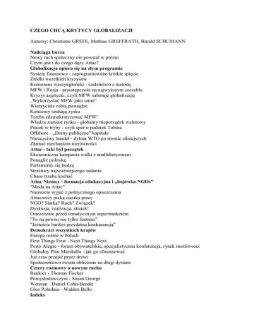 CZEGO CHCĄ KRYTYCY GLOBALIZACJI Autorzy: Christiane GREFE, Mathias GREFFRATH, Harald SCHUMANN Nadciąga burza Nowy ruch społeczny nie powstał w próżni Czym jest i do czego dąży Attac? Globalizacja opiera się na złym programie System finansowy - zaprogramowane krótkie spięcie Źródło wszelkich kryzysów Konsensus waszyngtoński - szaleństwo z metodą MFW i Rosja - przestępczość na najwyższym szczeblu Kryzys azjatycki, czyli MFW sabotuje globalizację „Wykorzystać MFW jako taran" Wierzyciele robią pieniądze Koncerny szukają zysku Trzeba zdemokratyzować MFW! Władza zamiast rynku - globalny nieporządek walutowy Piasek w tryby - czyli spór o podatek Tobina Offshore - „Domy publiczne" kapitału Nieuczciwy handel - dyktat WTO po stronie silniejszych Złamać mechanizm nierówności Attac - taki był początek Ekonomiczna kampania walki z analfabetyzmem Ponaglić politykę Parlamenty się budzą Strażnicy najważniejszego zadania Chaos trzeba kochać Attac Niemcy - formacja edukacyjna i „bojówka NGOs” "Moda na Attac" Nareszcie wyjść z politycznego opuszczenia Attacowcy pieką ciastka pracy NGO? Siatka? Ruch? Związek? Dyskusja, realizacja, skutek! Ostrzeżenie przed tematycznym supermarketem "To na pewno nie tylko fantaści" "Jesteście bardzo przydatną konkurencją" Demokraci wszystkich krajów Europa rośnie w bólach First Things First - Next Things Next Porto Alegre - forum obywatelskie, specjalistyczna konferencja, rynek możliwości Globalny Plan Marshalla - jak go sfinansować Już czas przejść przez drzwi Społeczeństwo świata obliczone na długi dystans Cztery rozmowy o nowym ruchu Bankier - Thomas Fischer Pomysłodawczyni - Susan George Weteran - Daniel Cohn-Bendit Głos Południa - Walden Bello Indeks
